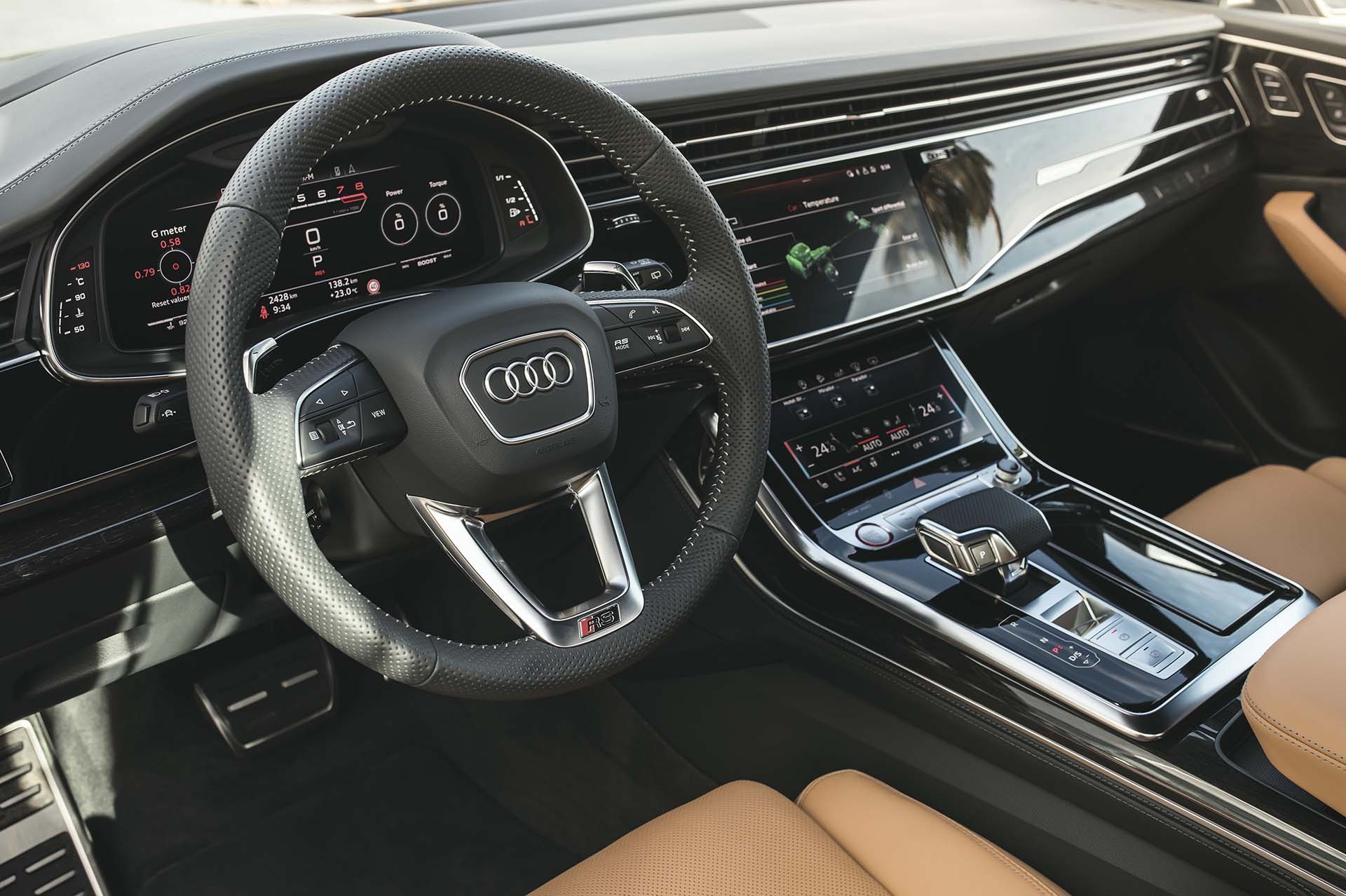 El conductor puede influir de manera precisa en el carácter del RS Q8 mediante el sistema de conducción dinámica Audi drive select. Existen ocho modos a elegir: comfort, auto, dynamic, efficiency, allroad, offroad y los dos modos RS individualmente configurables (RS1 y RS2), que se pueden activar directamente mediante el botón “RS-Mode” situado en el volante. El Audi drive select gestiona elementos como el motor, la transmisión, la dirección, la suspensión, el sonido del escape o la climatización.