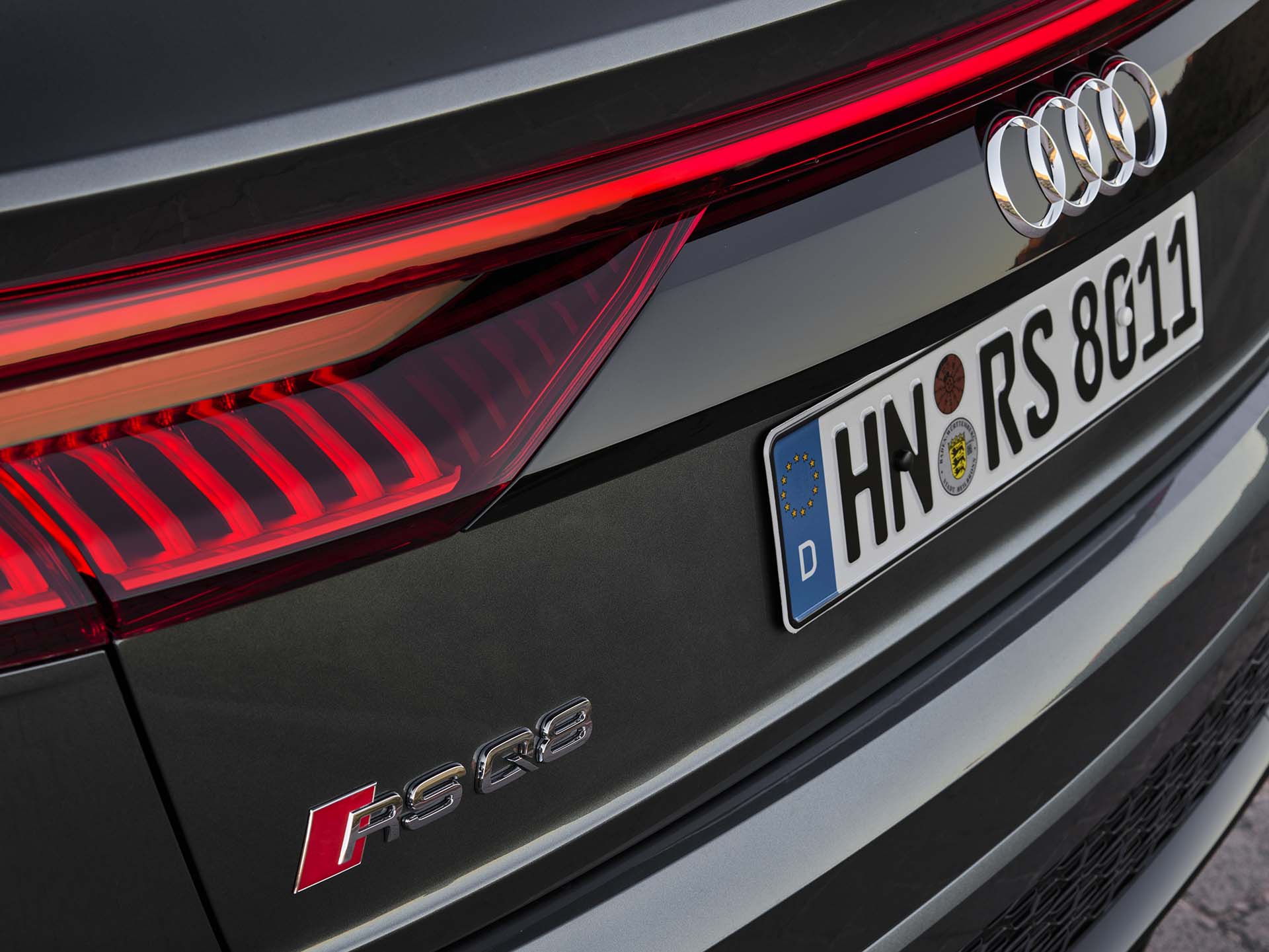 La línea del techo cae de forma descendente hacia los pilares D, hasta descansar en los blisters quattro sobre las salpicaderas. Elementos específicos RS en el color de la carrocería la ensanchan 10 milímetros en la parte delantera y 5 milímetros en la trasera, proporcionando espacio para la mayor anchura de vías. Las molduras en gris Manhattan –de serie– dan una apariencia aún más deportiva y estilizada al automóvil. El pequeño alerón del techo proporciona un acabado muy llamativo en la parte superior y funciona como un elemento aerodinámico que aporta apoyo extra en el eje trasero cuando se circula a velocidad elevada. En la parte inferior figuran detalles específicos RS, como el difusor trasero en óptica de aluminio o las salidas de escape ovaladas.