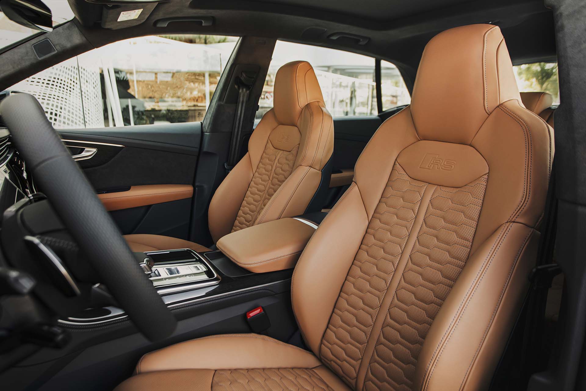 Los asientos deportivos RS de serie en cuero Valcona con un patrón panal y emblemas RS bordados encajan perfectamente con la filosofía deportiva del RS Q8. Además de la función de masaje, los asientos deportivos RS están perforados para ofrecer ventilación.