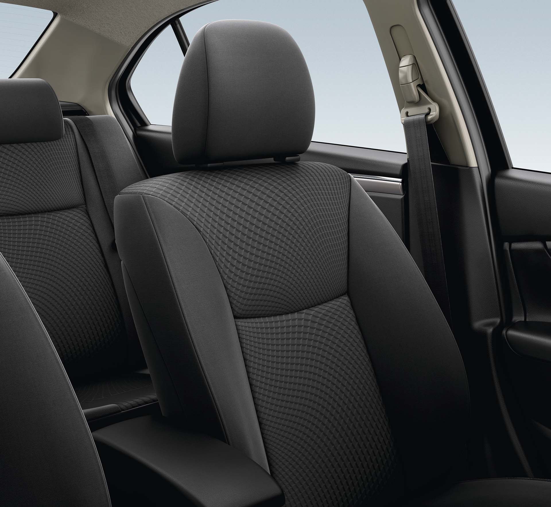 Al interior incorpora acabados tipo fibra de carbono en tablero y puertas; un nuevo diseño de clúster de instrumentos digital a color; el volante en piel cuenta con controles de audio y manos libres, dando una apariencia sofisticada; el sistema de aire acondicionado automático y tomacorrientes de 12v en consola central y fila trasera; las vestiduras incorporan asientos de tela; el centro de infoentretenimiento suma una pantalla de 7”, con conectividad a Apple Car Play y Android auto, sistema bluetooth y USB; se añade cámara de reversa y sensores de estacionamiento.