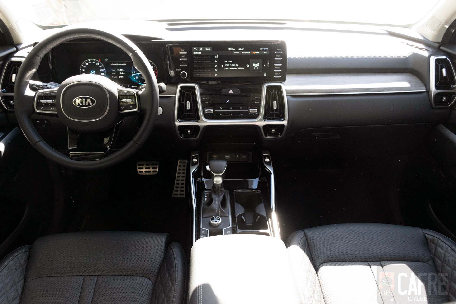 Si el diseño exterior de la KIA Sorento sobresale por su robustez, en el interior vemos un diseño más elegante. El tablero integra una moldura de imitación madera que abarca todo el frente y una parte de las puertas. Para la versión SX estrena un panel de instrumentos totalmente digital de 12.3 pulgadas que nos permite una personalización al poder cambiar de apariencia dependiendo el modo de manejo que tengas seleccionado. Este panel está unida a la pantalla touch de 10.25 pulgadas del sistema de infoentretenimiento, este sistema incorpora conexión bluetooth, USB, Android Auto y Apple CarPlay. Para armonizar tus viajes, tendremos un sistema de audio Bose con 12 bocinas.