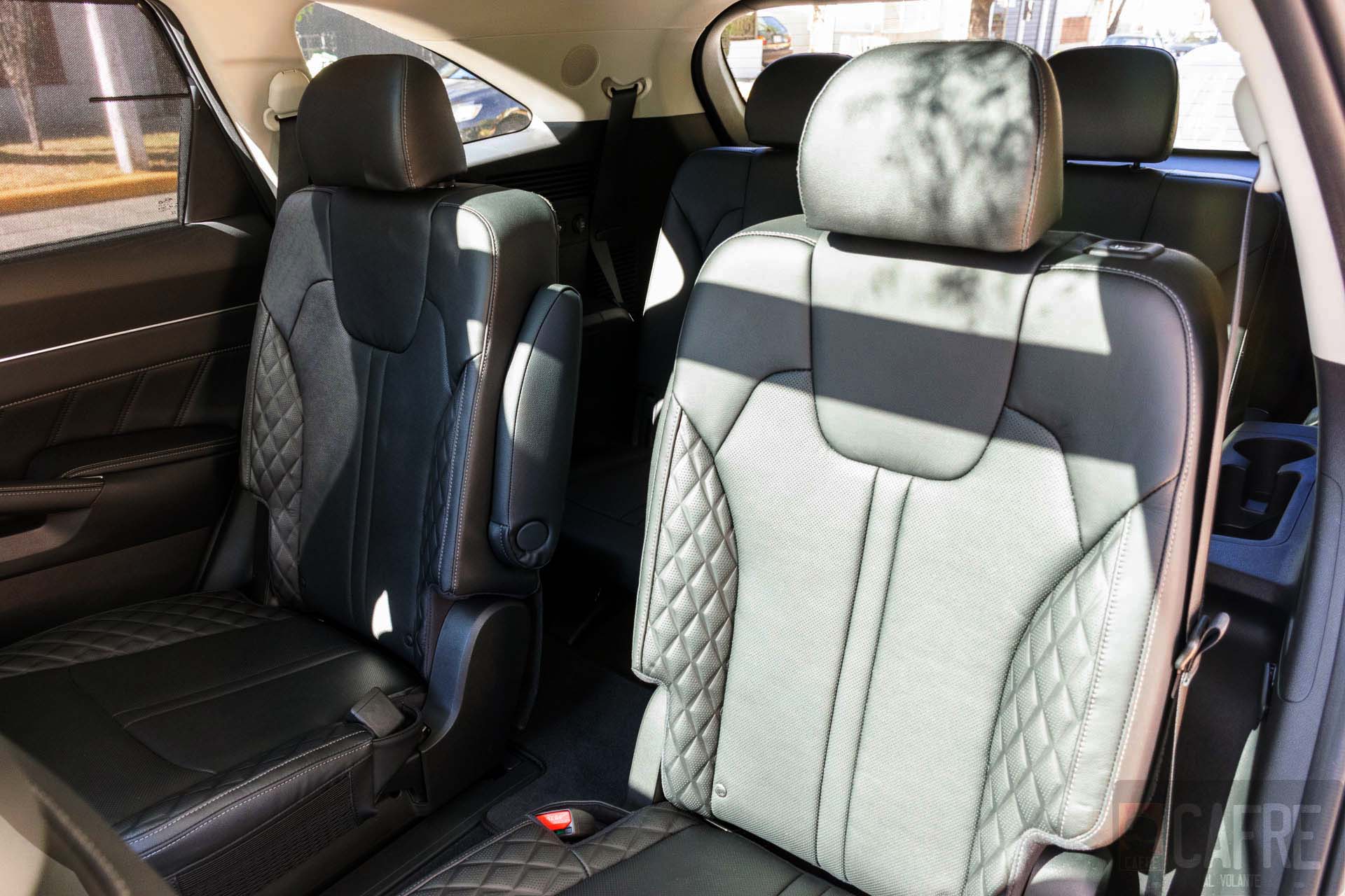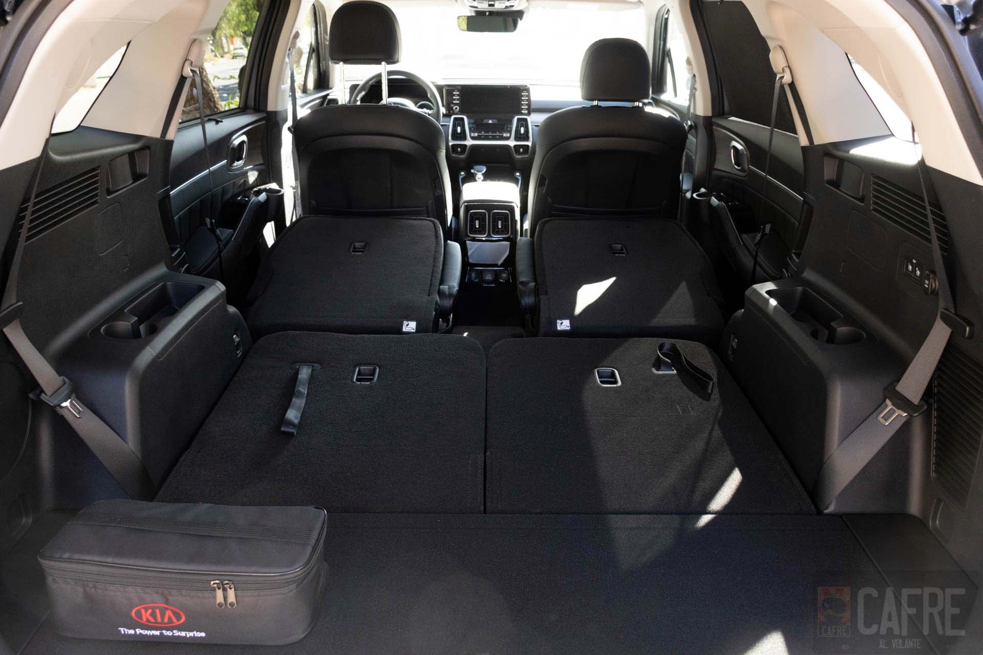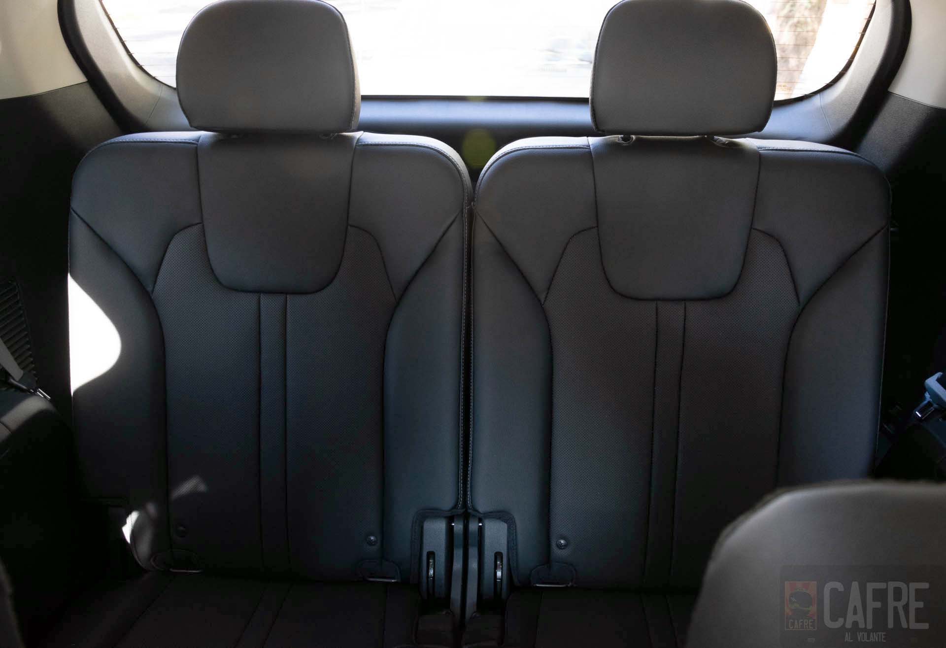 Al tener las tres filas el espacio de carga se reduce notablemente, por lo que, si piensas viajar con todos los ocupantes, las maletas tendrías que alojarlas entre los asientos, pero si sólo se ocupas sólo los asientos delanteros, el espacio de carga abatiendo la segunda y tercera fila alcanza los 2139 litros. Para obtener este volumen sólo es cuestión de oprimir los botones que se encuentran en el área de carga para abatir la segunda fila y para la tercera sólo es cuestión de tirar los cordones que encuentran en el respaldo.