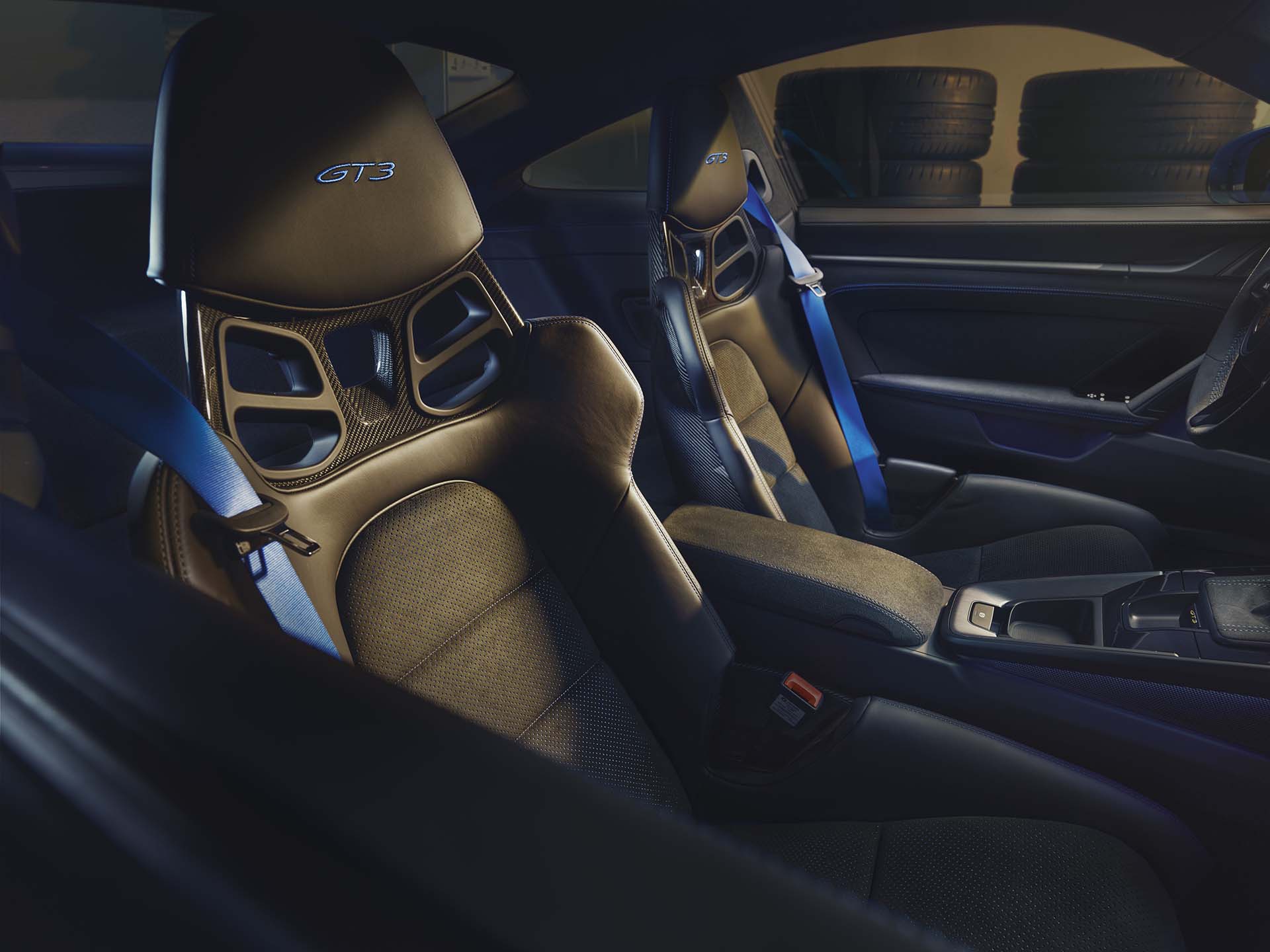 Cada vez más, los clientes quieren un equipamiento personalizado, especialmente en los modelos Porsche GT. Por ese motivo, el nuevo 911 GT3 también dispone de la amplia gama de opciones que ofrece Porsche Exclusive Manufaktur, y que se completa con algunas específicas para este vehículo, como por ejemplo, el techo ligero fabricado con fibra de carbono que se ve a simple vista. Otros detalles destacados son la parte superior de carbono de los retrovisores exteriores y los faros principales matrix LED oscurecidos, a juego con las luces traseras de diseño Exclusive, con un arco de luz sin componentes rojos. Los aros de los rines pintados en rojo Guardia o azul Tiburón realzan su color negro. Detalles en el tono de la carrocería, o en cualquier otro a elegir, para los diales del cuentarrevoluciones y del cronómetro Sport Chrono, los cinturones de seguridad y las molduras decorativas dan un toque especial al interior.