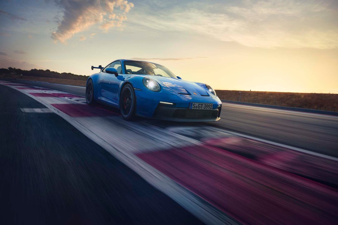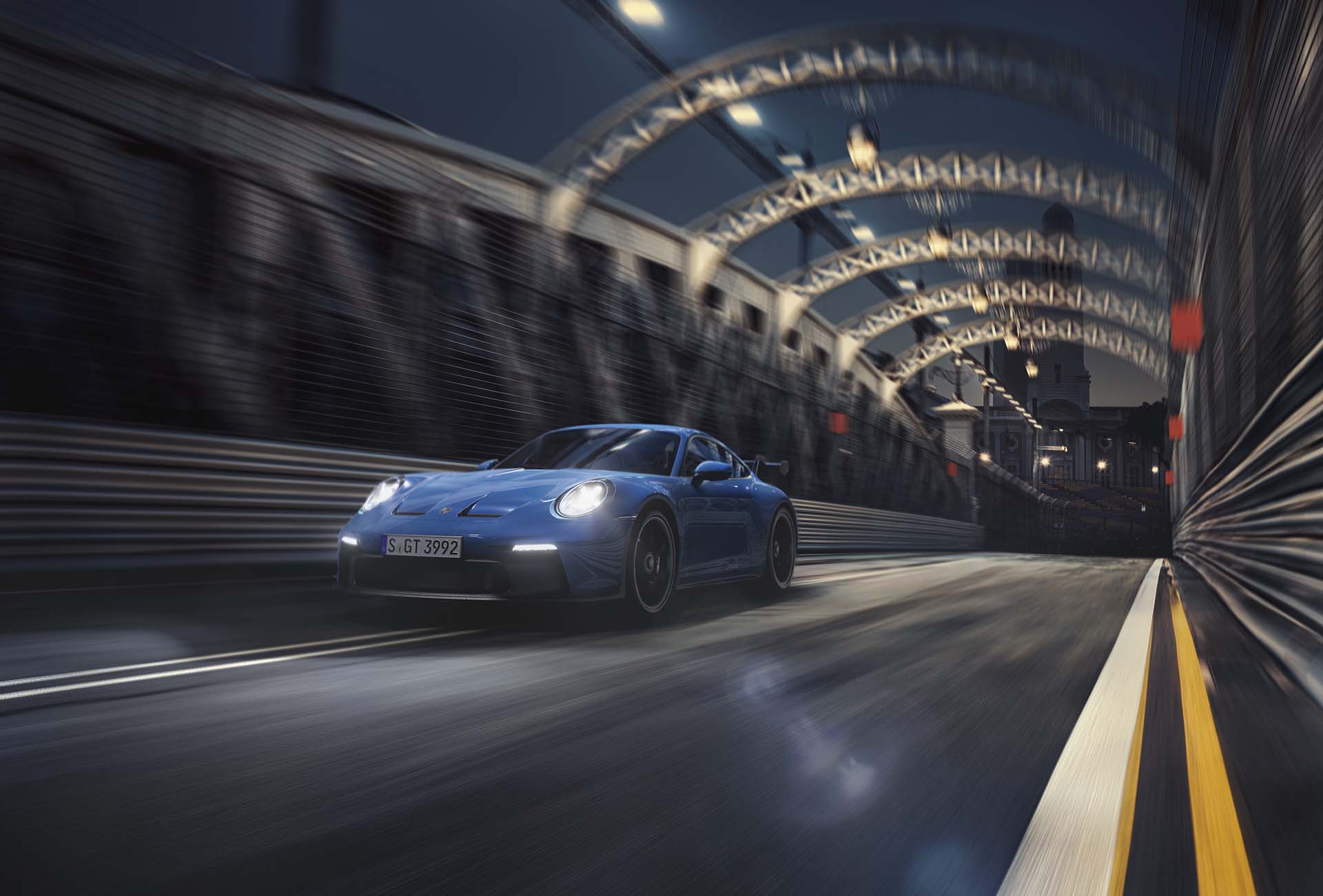 Porsche presenta el nuevo 911 GT3. La séptima edición de este deportivo de altas prestaciones ha sido desarrollada en estrecha colaboración con Porsche Motorsport, el departamento de competición de la marca. La transferencia de auténtica tecnología de las carreras a un modelo de producción en serie es la más extensa que haya hecho Porsche en su historia. El diseño de brazos dobles superpuestos en el eje delantero y la sofisticada aerodinámica, con un gran alerón posterior anclado en forma de cuello de cisne y un enorme difusor, provienen de su exitoso hermano de circuito, el 911 RSR. Además, el motor bóxer de seis cilindros y 3.996 centímetros cúbicos, que entrega una potencia de 510 caballos (375 kW), está basado en el que utiliza el 911 GT3 R, ampliamente probado y mejorado en las carreras de resistencia.