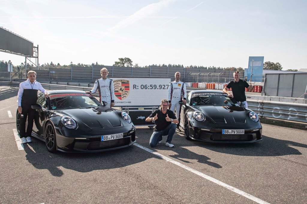 En el mítico Nürburgring Nordschleife, tradicionalmente la referencia para todos los deportivos Porsche, marcó un impresionante récord: durante la fase final de su puesta a punto, el 911 GT3 se convirtió en el primer modelo de producción en serie con motor atmosférico en bajar de la barrera de los siete minutos. El piloto de desarrollo Lars Kern marcó un tiempo de 6:59.927 minutos en una vuelta completa al trazado de 20 kilómetros y 800 metros. En la pista acortada de kilómetros y 600 metros, que anteriormente servía como referencia, el 911 GT3 paró el cronómetro en 6:55.2 minutos. Calzado con los neumáticos opcionales Michelin Pilot Sport Cup 2 R, el nuevo modelo demostró su excelente rendimiento durante varias vueltas, con Jörg Bergmeister, el experto embajador de la marca, al volante. Para Bergmeister, es “con diferencia, el mejor vehículo de producción en serie” que ha conducido en su vida en el ‘Infierno Verde’.