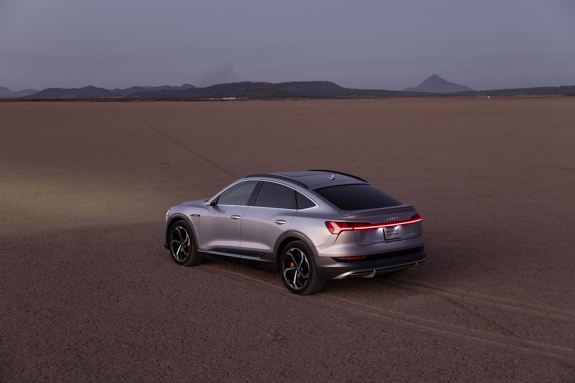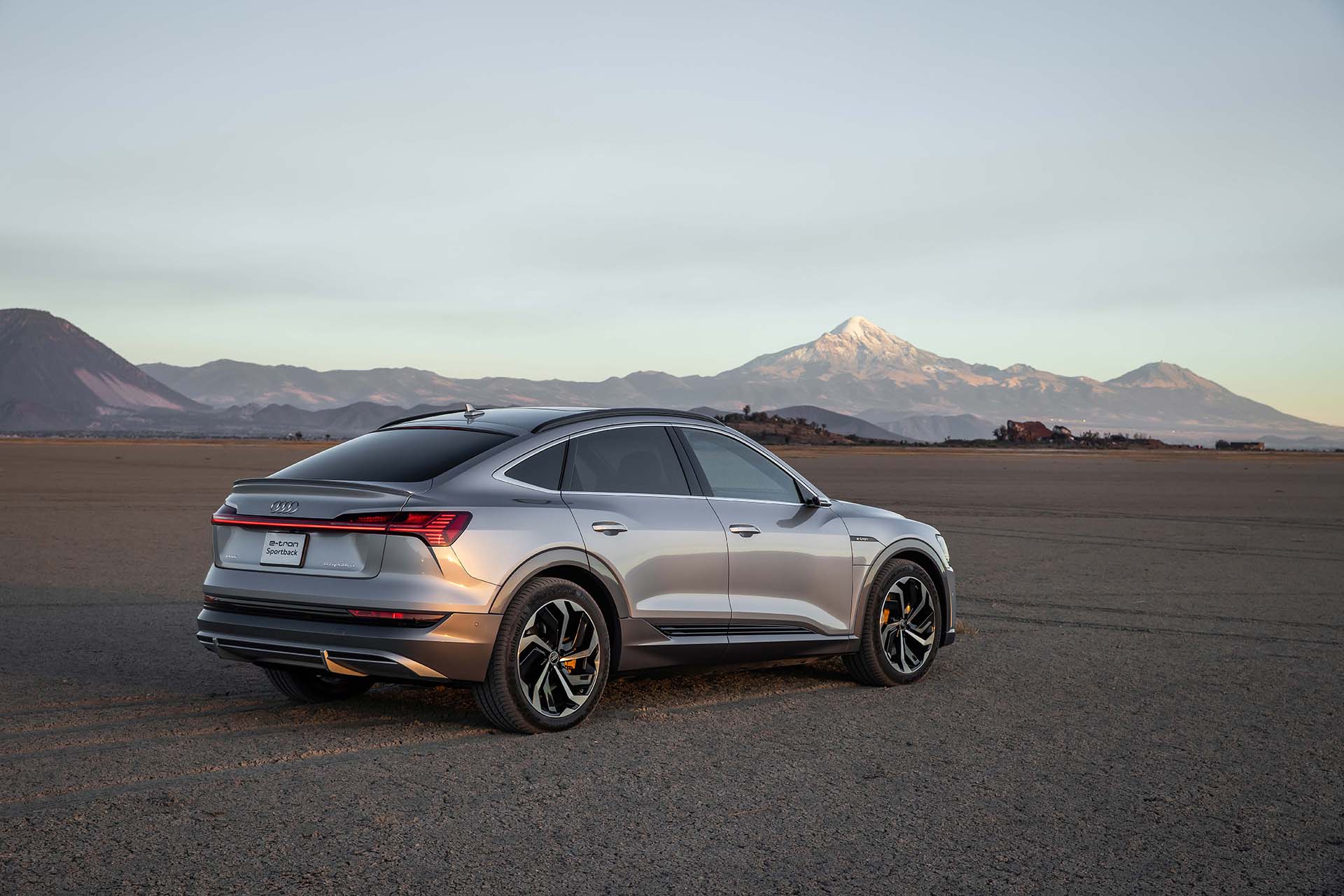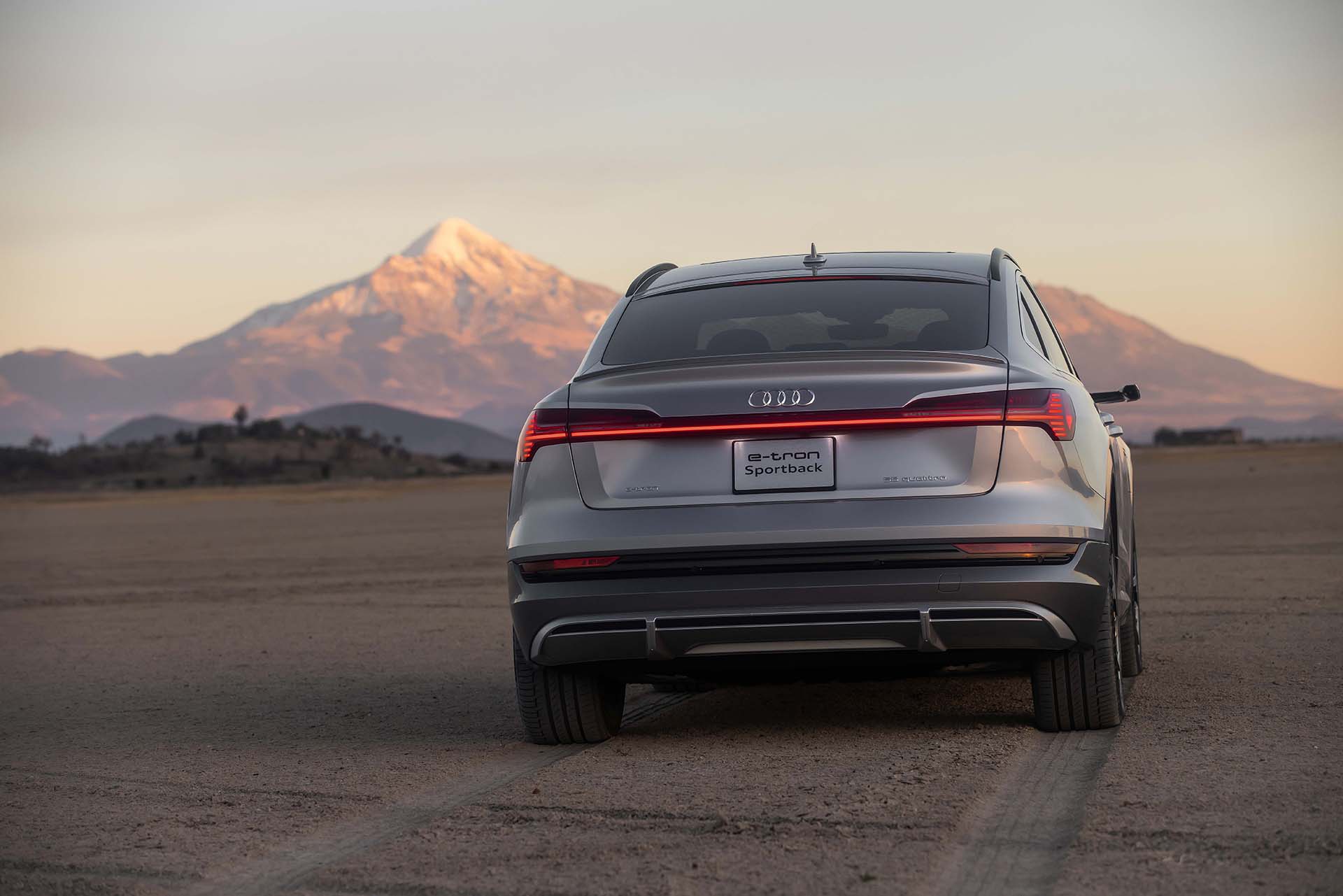 El Audi e-tron Sportback combina la potencia de un espacioso SUV con la elegancia de un coupé (CUV) de cuatro puertas y el carácter progresivo de un vehículo eléctrico. Mide 4,901 milímetros de largo, 1,935 milímetros de ancho y 1,616 milímetros de alto. Su techo se extiende de forma casi plana sobre la musculosa carrocería y desciende de forma muy marcada en su zona posterior hasta llegar a integrarse en unos pilares D visiblemente inclinados. El borde inferior de la tercera ventanilla lateral se eleva en su parte final, una característica típica de los modelos Sportback.