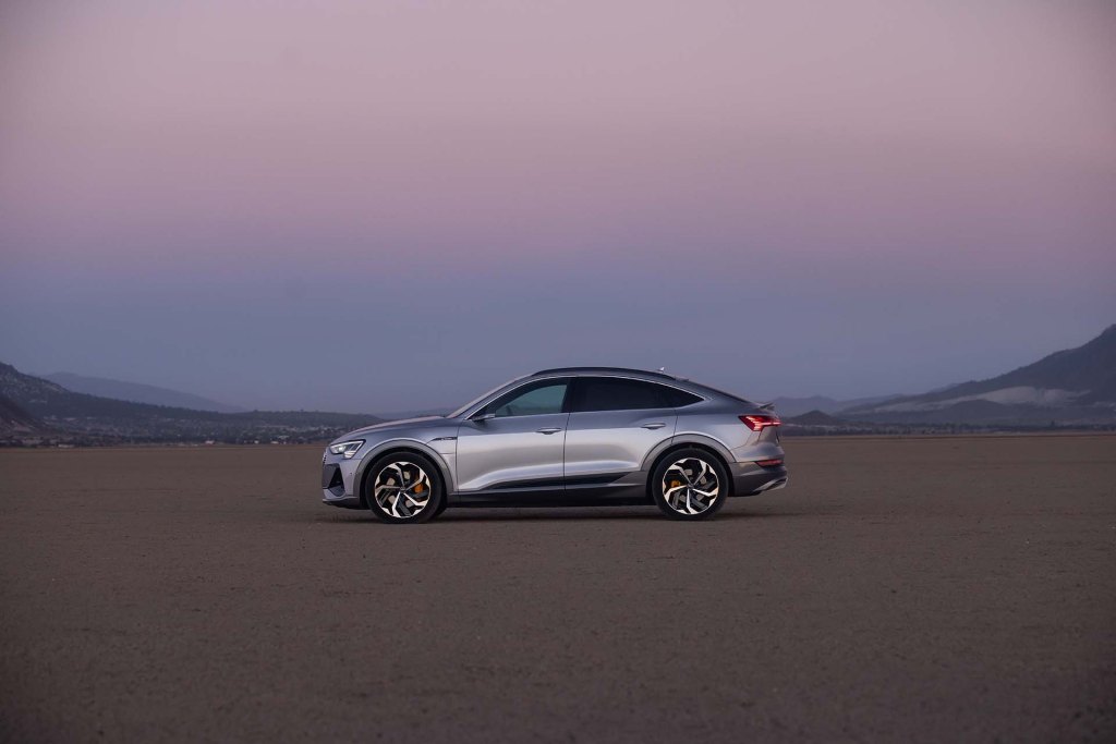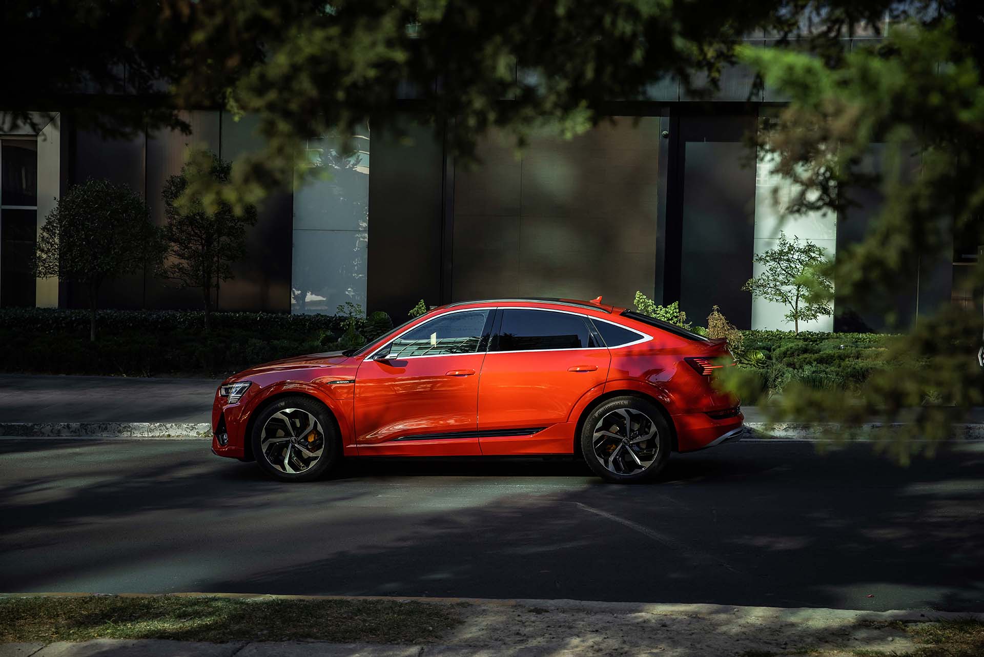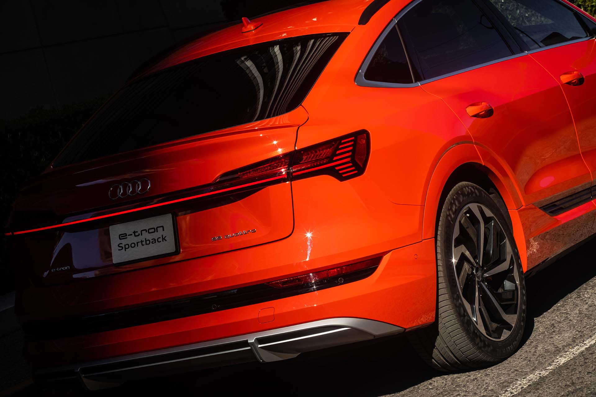 El Audi e-tron Sportback combina la potencia de un espacioso SUV con la elegancia de un coupé (CUV) de cuatro puertas y el carácter progresivo de un vehículo eléctrico. Mide 4,901 milímetros de largo, 1,935 milímetros de ancho y 1,616 milímetros de alto. Su techo se extiende de forma casi plana sobre la musculosa carrocería y desciende de forma muy marcada en su zona posterior hasta llegar a integrarse en unos pilares D visiblemente inclinados. El borde inferior de la tercera ventanilla lateral se eleva en su parte final, una característica típica de los modelos Sportback.