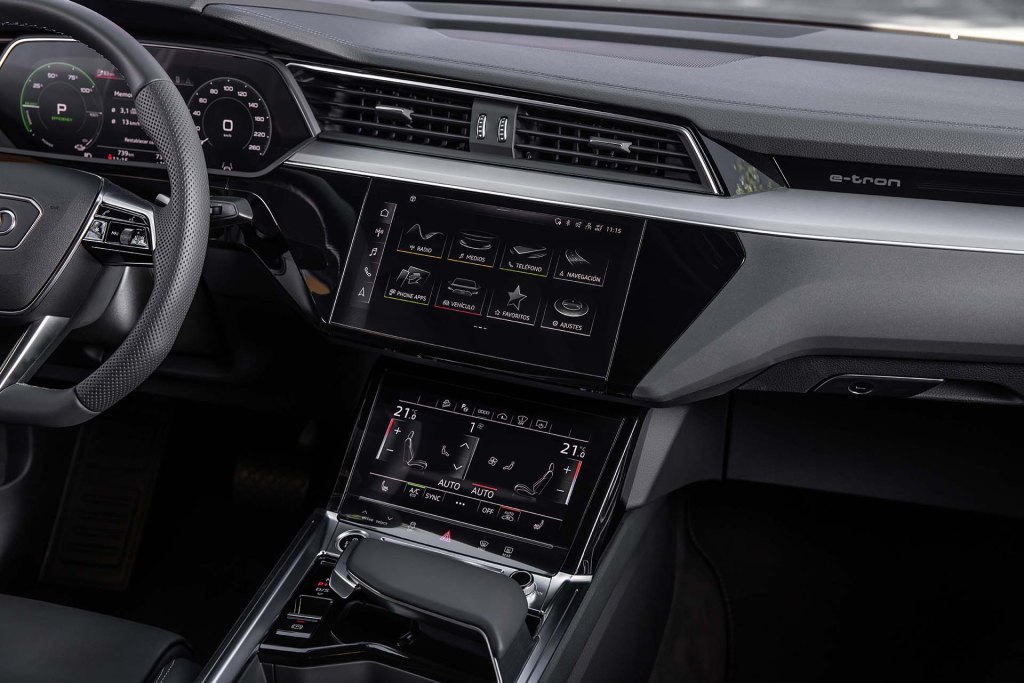 Igual que todos los modelos de categoría superior de Audi, el e-tron Sportback también presenta el sistema MMI touch response con dos pantallas. Cuando se activa una función con el dedo, una respuesta táctil y acústica confirma la operación. Mediante la pantalla táctil superior de 30.7 centímetros (12.1 pulgadas), el conductor controla el infotainment, el teléfono, la navegación y los ajustes específicos e-tron. La pantalla inferior de 21.8 centímetros (8.6 pulgadas) se usa para introducir texto y llevar a cabo otras tareas, como las relativas al control del climatizador. La estructura del menú es lógica e intuitiva, similar a la de un smartphone actual; los gráficos son claros y concisos.
