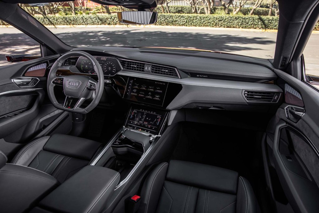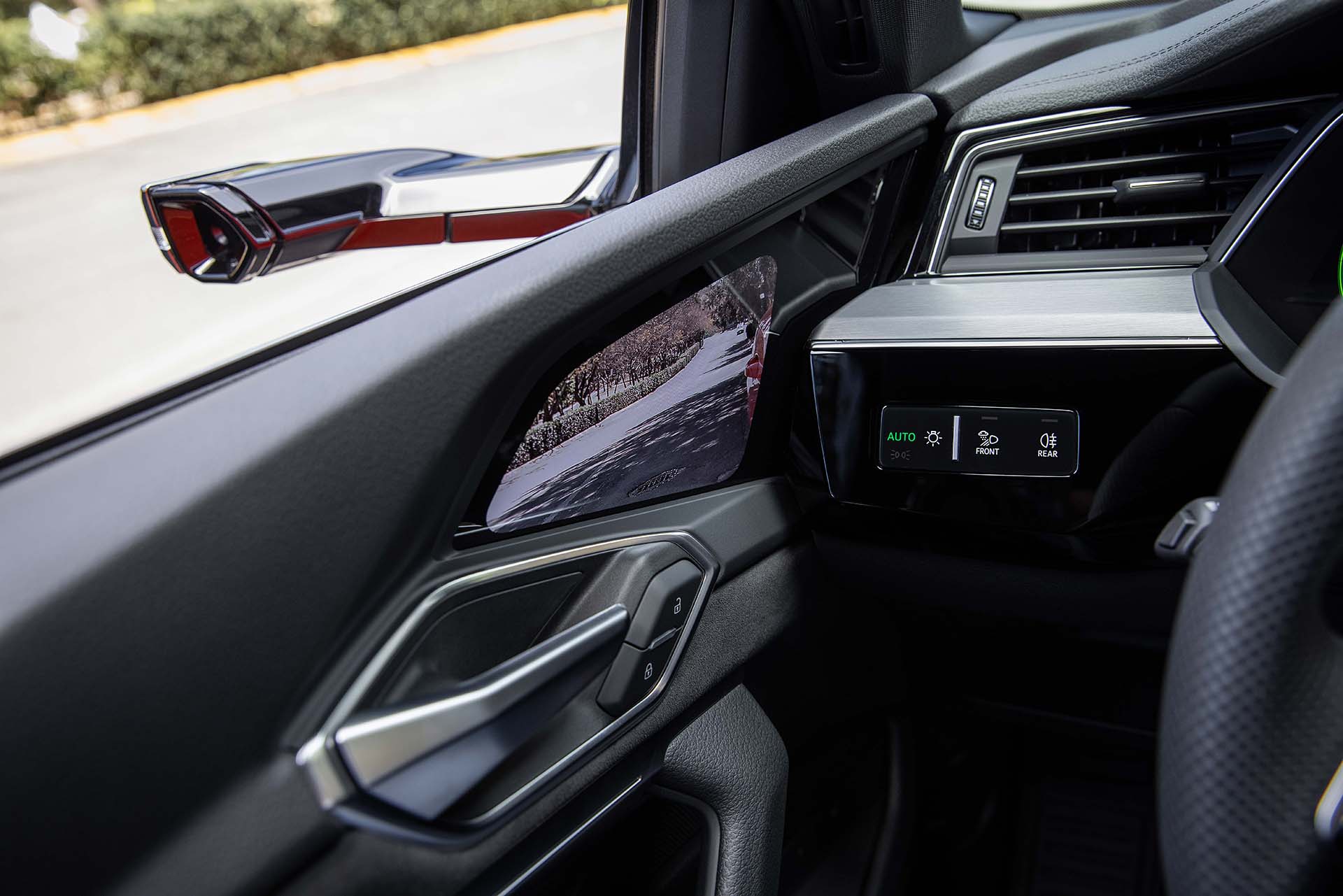 Aproximadamente diez de los kilómetros extra que ofrece en comparación con el e-tron se pueden atribuir a la aerodinámica. Los retrovisores exteriores virtuales opcionales, cuyos soportes en forma de ala integran pequeñas cámaras, son también importantes en la mejora de la eficiencia. Las imágenes que obtienen son proyectadas en pantallas OLED de alto contraste, ubicadas en la transición entre el tablero y las puertas. Si el conductor mueve su dedo hacia la superficie de la pantalla táctil, se activan símbolos que permiten reposicionar la imagen. Además, el sistema tiene capacidad para adaptarse automáticamente a tres situaciones de conducción: manejo en carretera, maniobras de giro y estacionamiento. El objetivo es proporcionar siempre una visibilidad óptima en cada escenario. El refinamiento aerodinámico también se extiende a determinadas áreas ocultas a la vista. Entre otras, la entrada de aire con canales de refrigeración para los frenos delanteros, las llantas aerodinámicas y los bajos totalmente revestidos, que incluyen una superficie de aluminio para proteger la batería de alto voltaje.