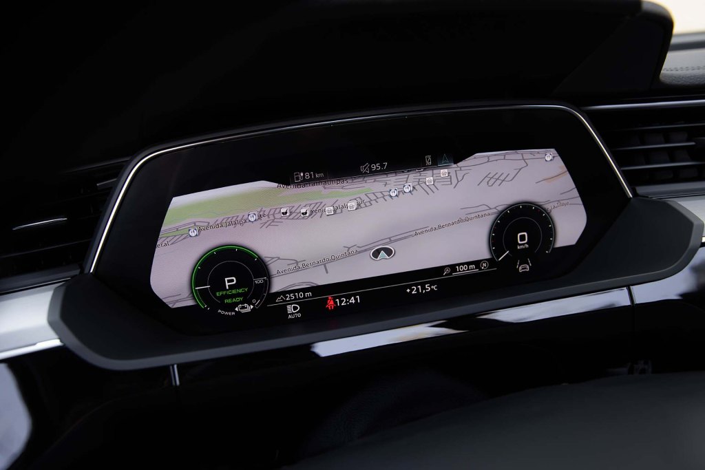 El equipamiento de serie del e-tron Sportback también incluye la instrumentación Audi virtual cockpit plus de 312 cm (12.3) pulgadas. Esta pantalla destaca por su resolución extremadamente alta de 1,920 x 720 píxeles y permite cambiar entre dos modos de vista mediante el botón ‘View’ del volante. Cuenta con un modo de visualización adicional, en el que el elemento protagonista es el medidor de potencia. Opcionalmente, es posible ampliar estas funciones con un Head-up display que proyecta información relevante en el parabrisas.