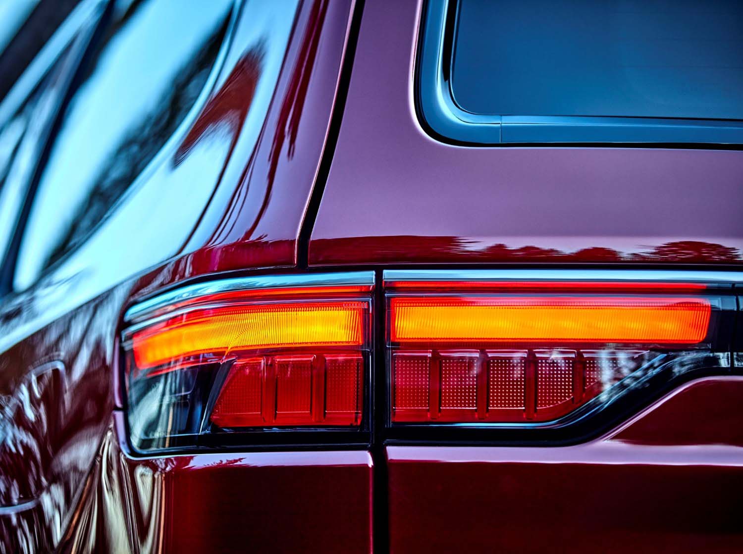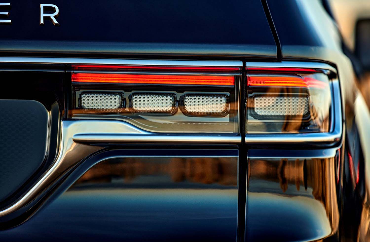 Las luces LED de funcionamiento diurno (DRL) rodean la parrilla y proporcionan una apariencia premium con un fondo en color negro brillante, enfatizando el ancho de la parte delantera. Un completo juego de luces LED (incluidas luces delanteras, antiniebla y traseras) amplifican la nueva estética. Tras el arranque remoto, las luces LED exteriores del Grand Wagoneer se activan sutilmente con una secuencia de “bienvenida”.