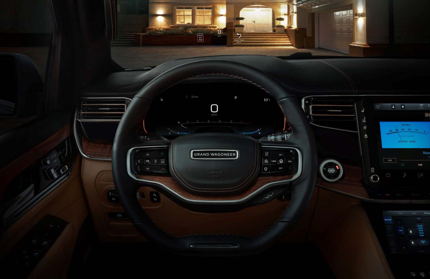Muchos de los elementos interiores rinden homenaje a la rica historia del Wagoneer, como el volante de dos brazos. Esta interpretación moderna del volante forrado en piel de Wagoneer ofrece mayor comodidad con un agarre reforzado donde normalmente se encuentra un tercer brazo del volante. Al abrir las puertas delanteras del lado del conductor y del pasajero del Grand Wagoneer, se muestra el borde exterior del panel de instrumentos, que cuenta con una inscripción — EST. 1963 — rindiendo homenaje al año del primer modelo Wagoneer original.