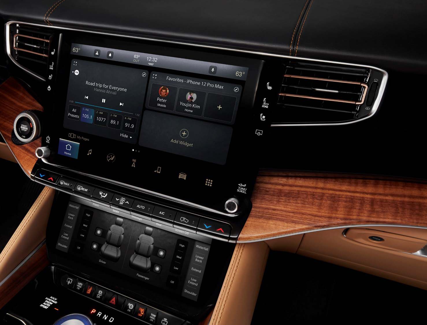 - Pantalla táctil horizontal de 10.1” en el Wagoneer y de 12” en el Grand Wagoneer que hace las funciones de pantalla principal