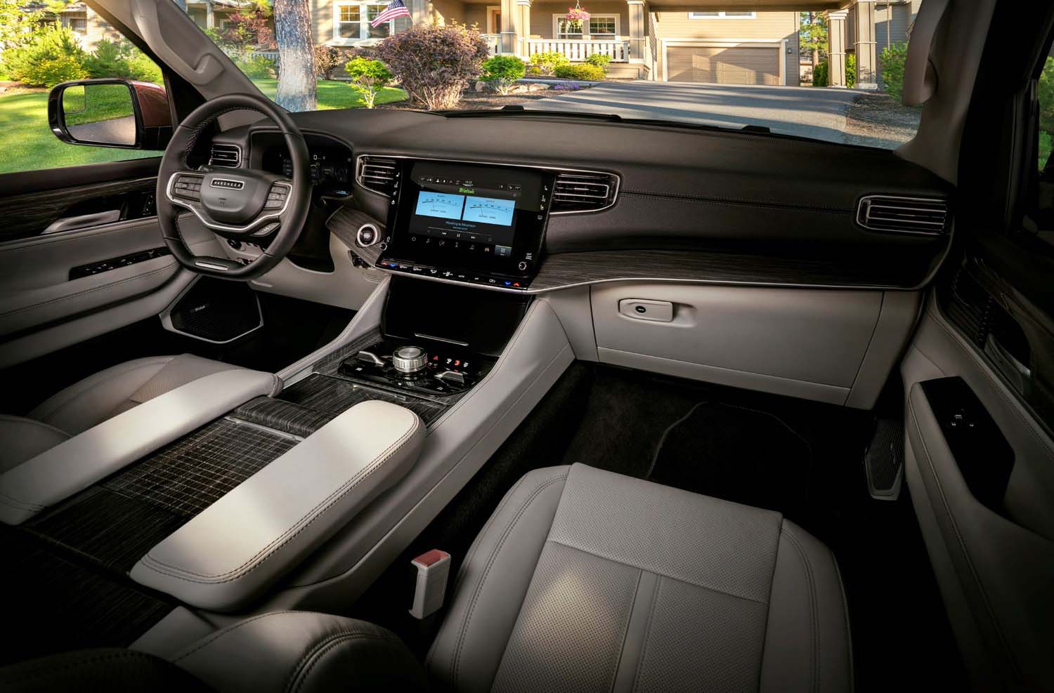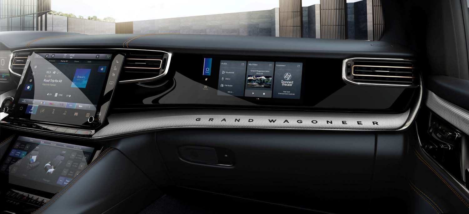 Casi 45 pulgadas de pantallas total que abarcan la longitud del panel de instrumentos: un panel de instrumentos de 10.25 pulgadas en Wagoneer o de 12.3 pulgadas en Grand Wagoneer, una pantalla táctil horizontal de 10.1 pulgadas (Wagoneer) o de 12 pulgadas (Grand Wagoneer) sirve como la pantalla principal en la consola central, con una pantalla táctil de confort horizontal de 10.25 pulgadas abajo, separada por el ala de aluminio estructural. Cuando está equipado con el sistema opcional de entretenimiento para el asiento trasero, las pantallas del grupo, del radio y del pasajero muestran una animación coordinada al arrancar el vehículo. Otras características incluyen: