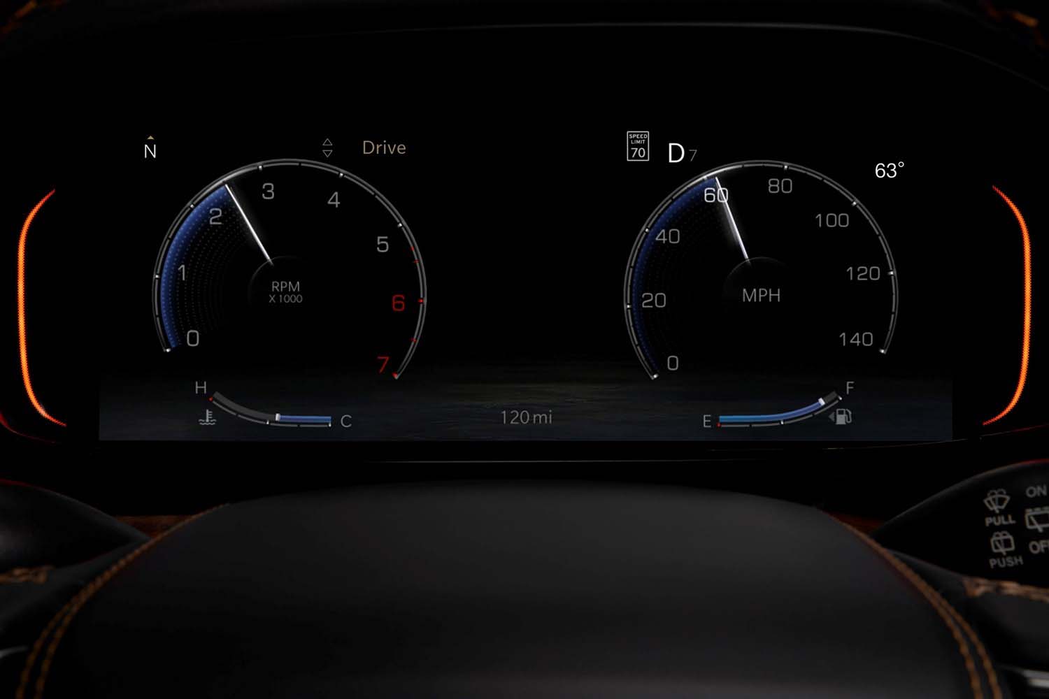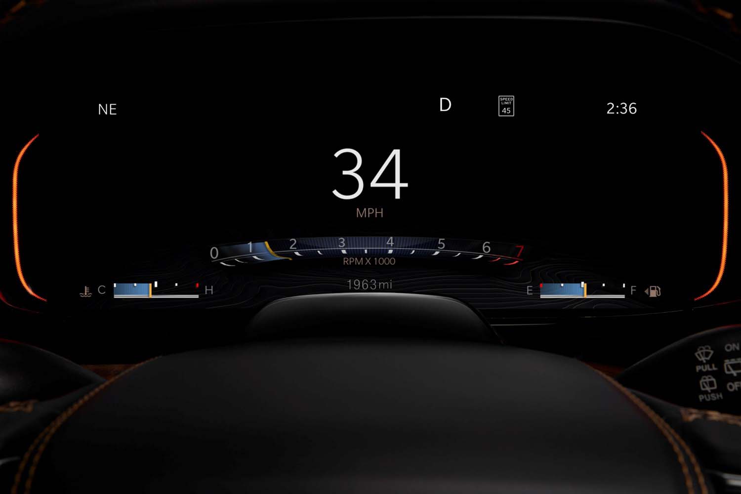 - Cuadro de relojes digital sin marcos de 10.25” pulgadas en el Wagoneer y 12.3” en el Grand Wagoneer, con cerca de dos docenas de menús diferentes entre los que se puedo escoger tecnologías de asistencia al conductor como control de crucero adaptativo, asistencia al manejo nocturno, visión nocturna, detección de conductor somnoliento, entre otras, y otros ajustes como música, tacómetro digital, modos de manejo o presión de los neumáticos. Es totalmente personalizable y el conductor puede seleccionar entre visualizar el cuadro de instrumentos de manera analógica o digital.