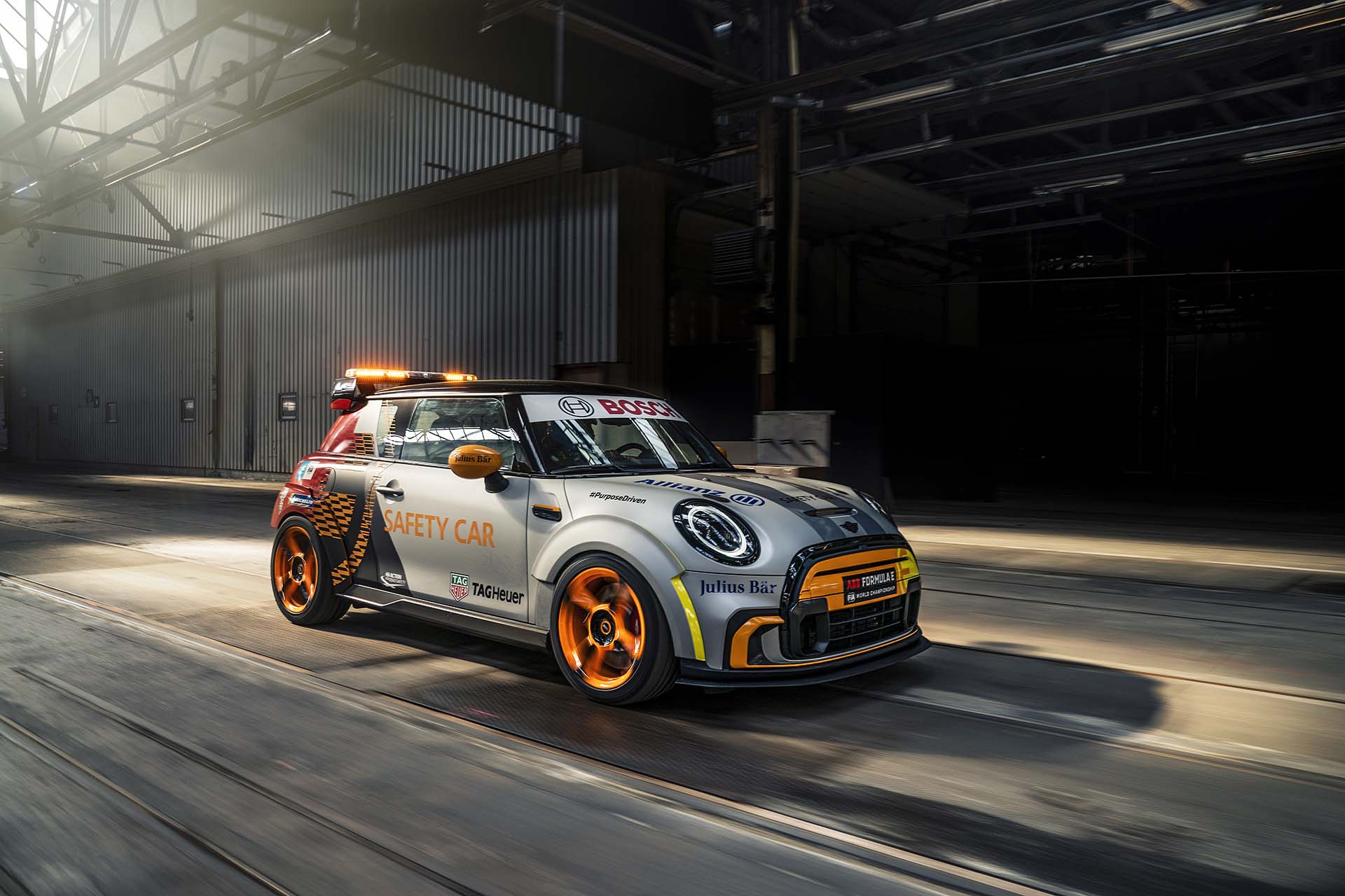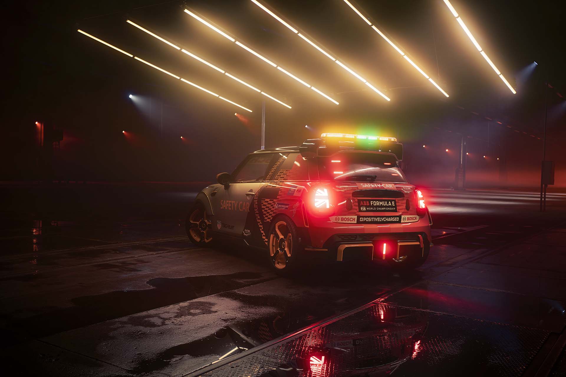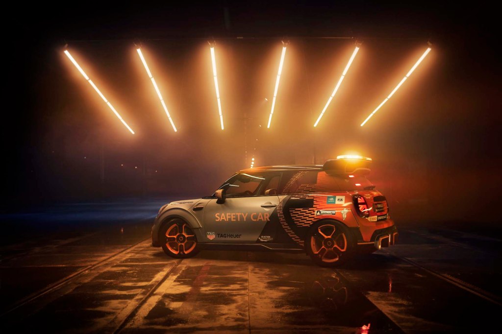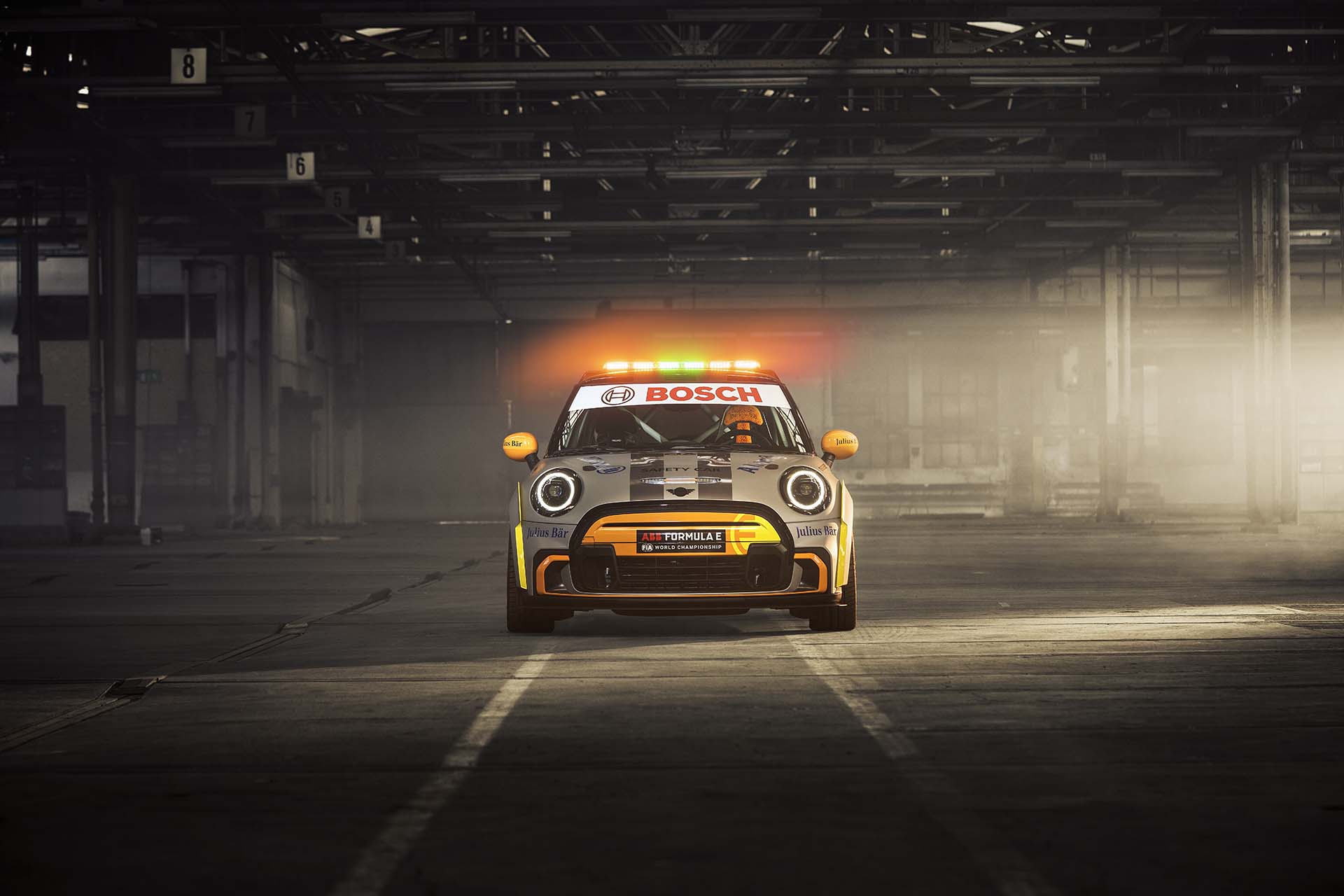 En la parte delantera del vehículo los iconos clásicos de MINI, como los faros circulares y la parrilla del radiador hexagonal, crean el rostro MINI familiar y fácilmente reconocible. Al mismo tiempo, los elementos de trabajo característicos de John Cooper, como las salpicaderas adaptadas al ancho de la vía del vehículo y el faldón delantero profundo con divisores delanteros adicionales a la izquierda y a la derecha, mejoran las imágenes deportivas de la parte delantera. La «parrilla del radiador» y el logotipo de MINI Electric señalan el «corazón» eléctrico del Safety Car. Como prácticamente no se requiere enfriamiento del sistema de propulsión a través de la parrilla, la parte delantera está en gran parte cerrada para ayudar a la aerodinámica. Las únicas excepciones son el área debajo de la parrilla y las llamativas aberturas casi cuadradas para el enfriamiento de los frenos. Las luces intermitentes blancas del Safety Car están integradas armoniosamente en el capó. Las características franjas del capó de MINI se extienden sobre el toldo hasta la parte trasera.