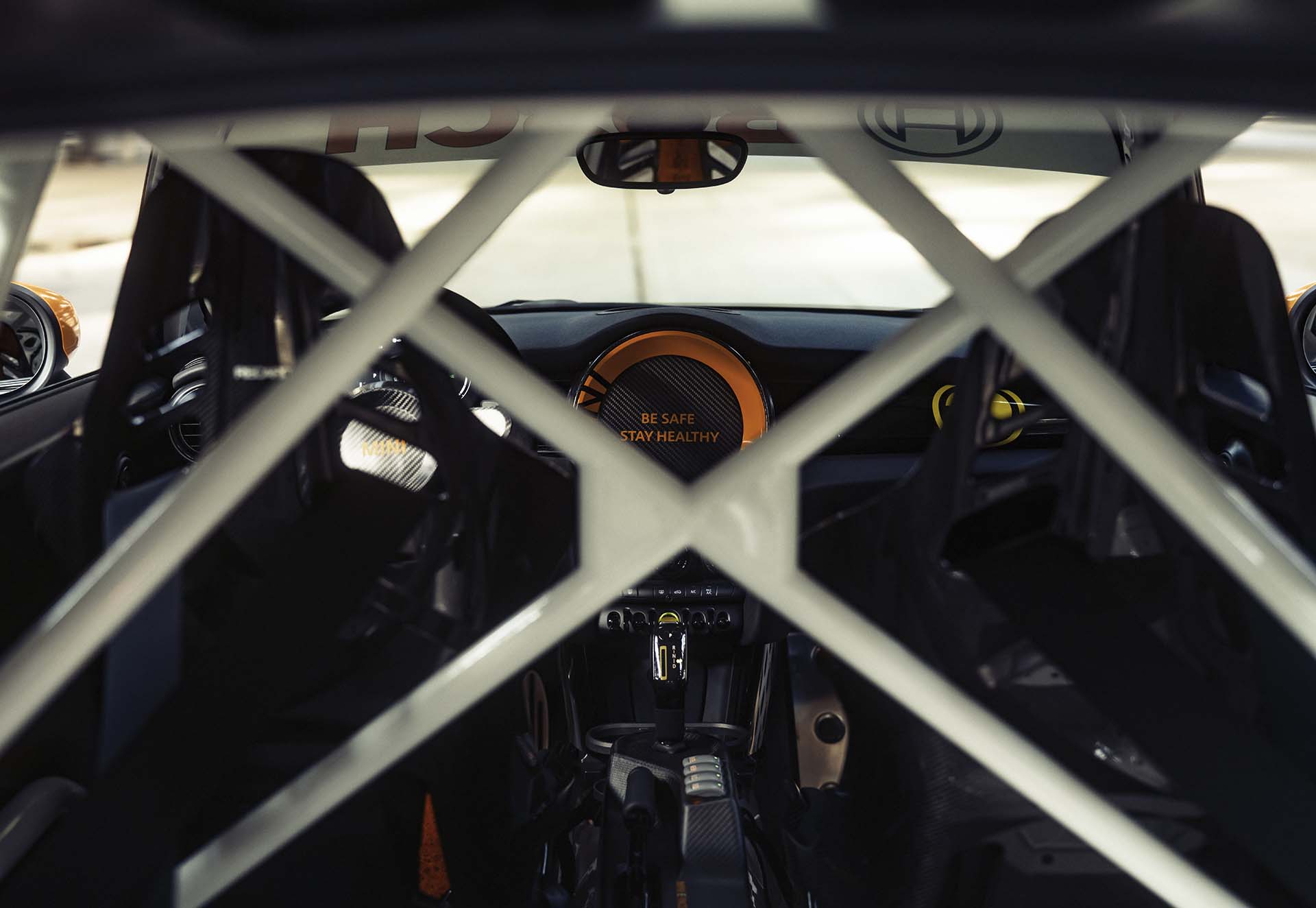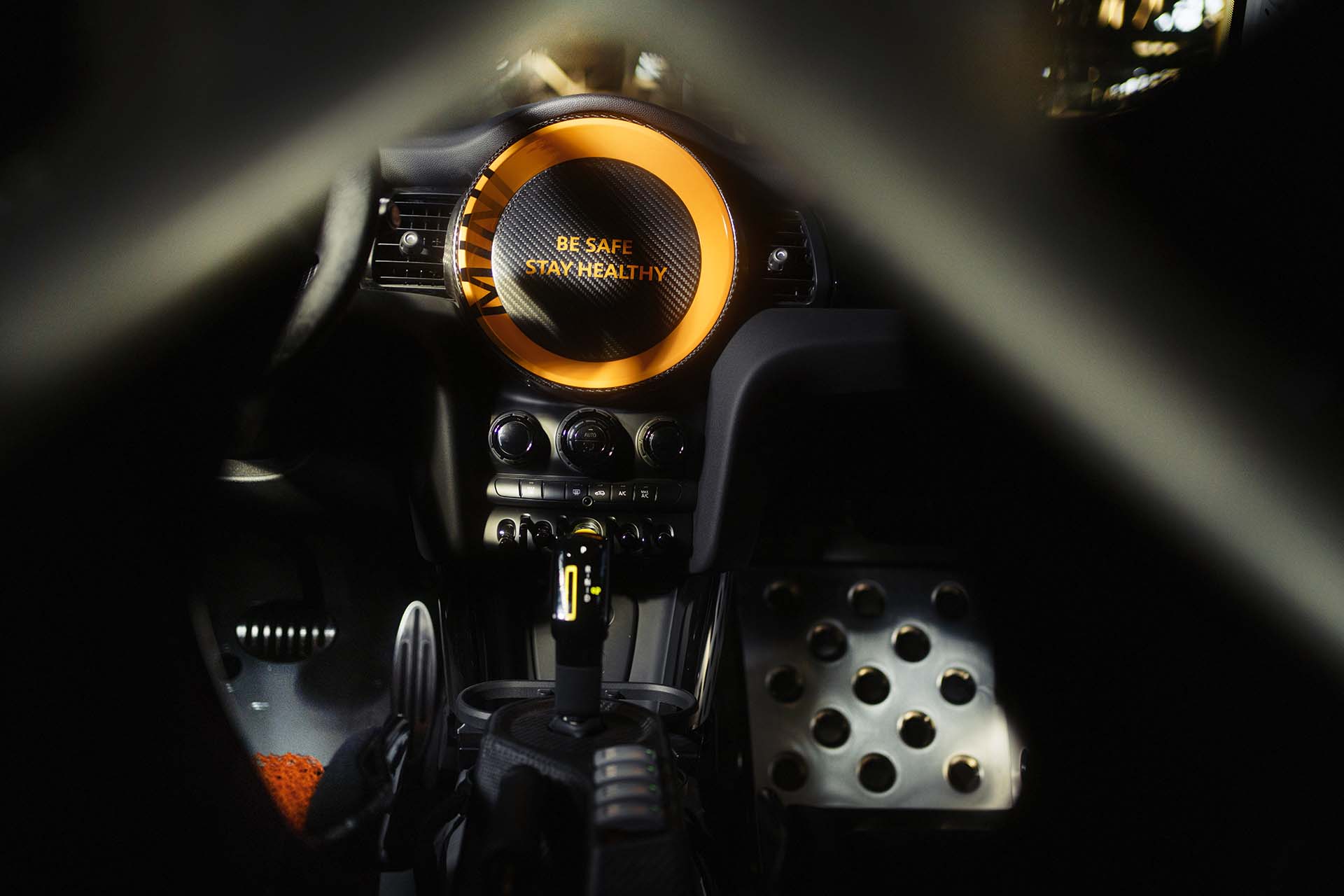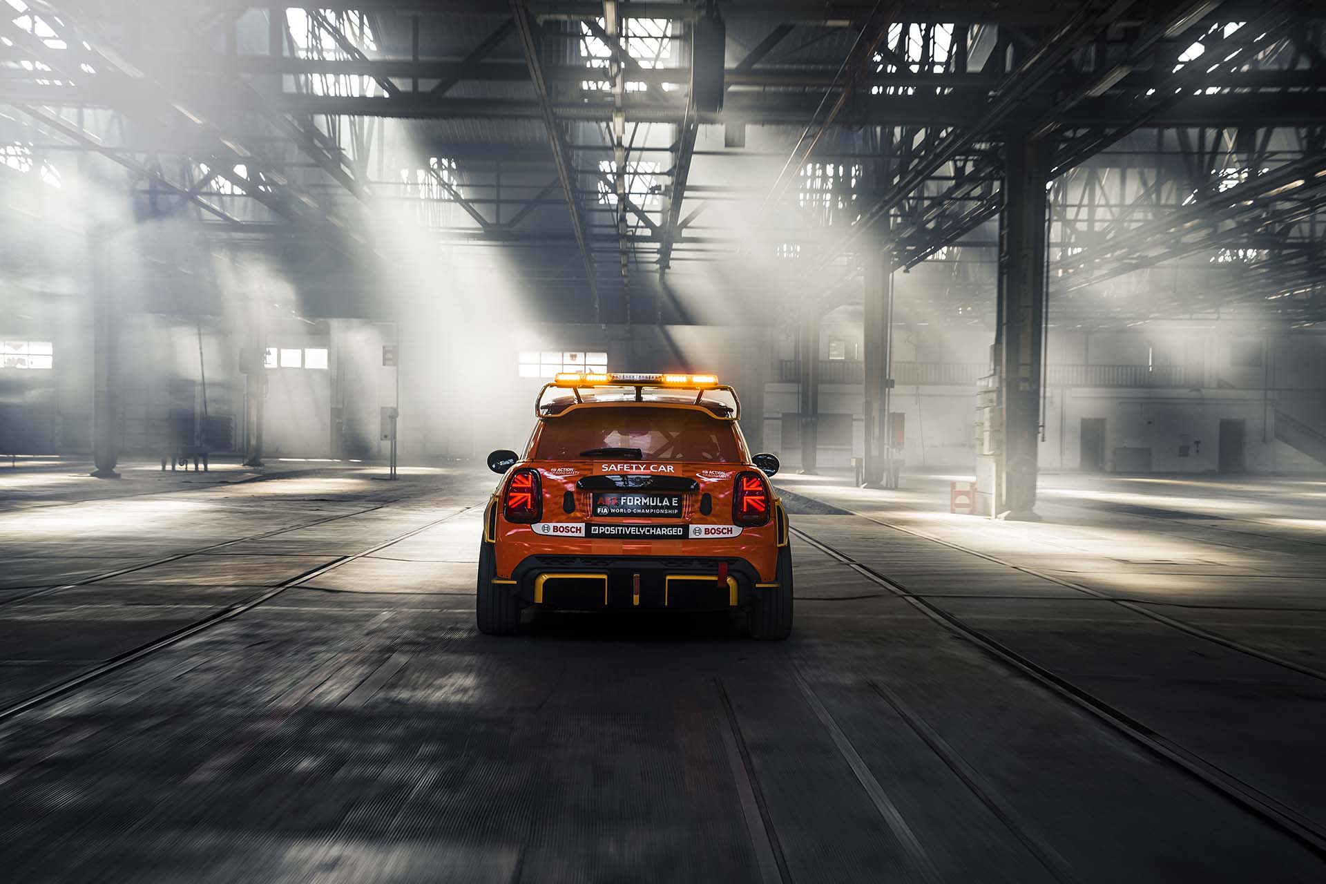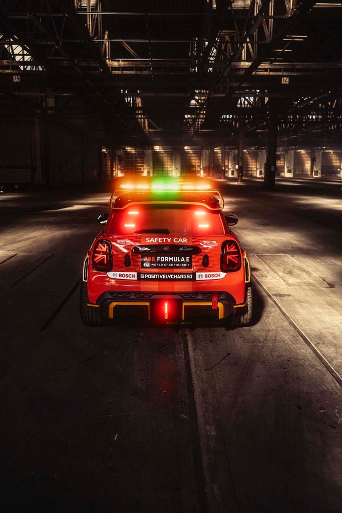 En la parte delantera del vehículo los iconos clásicos de MINI, como los faros circulares y la parrilla del radiador hexagonal, crean el rostro MINI familiar y fácilmente reconocible. Al mismo tiempo, los elementos de trabajo característicos de John Cooper, como las salpicaderas adaptadas al ancho de la vía del vehículo y el faldón delantero profundo con divisores delanteros adicionales a la izquierda y a la derecha, mejoran las imágenes deportivas de la parte delantera. La «parrilla del radiador» y el logotipo de MINI Electric señalan el «corazón» eléctrico del Safety Car. Como prácticamente no se requiere enfriamiento del sistema de propulsión a través de la parrilla, la parte delantera está en gran parte cerrada para ayudar a la aerodinámica. Las únicas excepciones son el área debajo de la parrilla y las llamativas aberturas casi cuadradas para el enfriamiento de los frenos. Las luces intermitentes blancas del Safety Car están integradas armoniosamente en el capó. Las características franjas del capó de MINI se extienden sobre el toldo hasta la parte trasera.