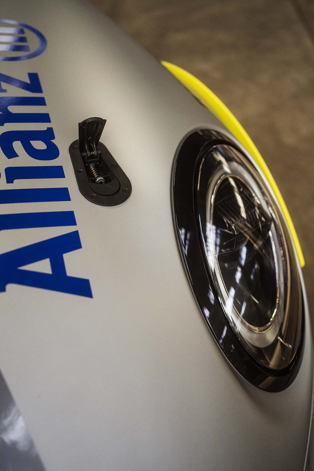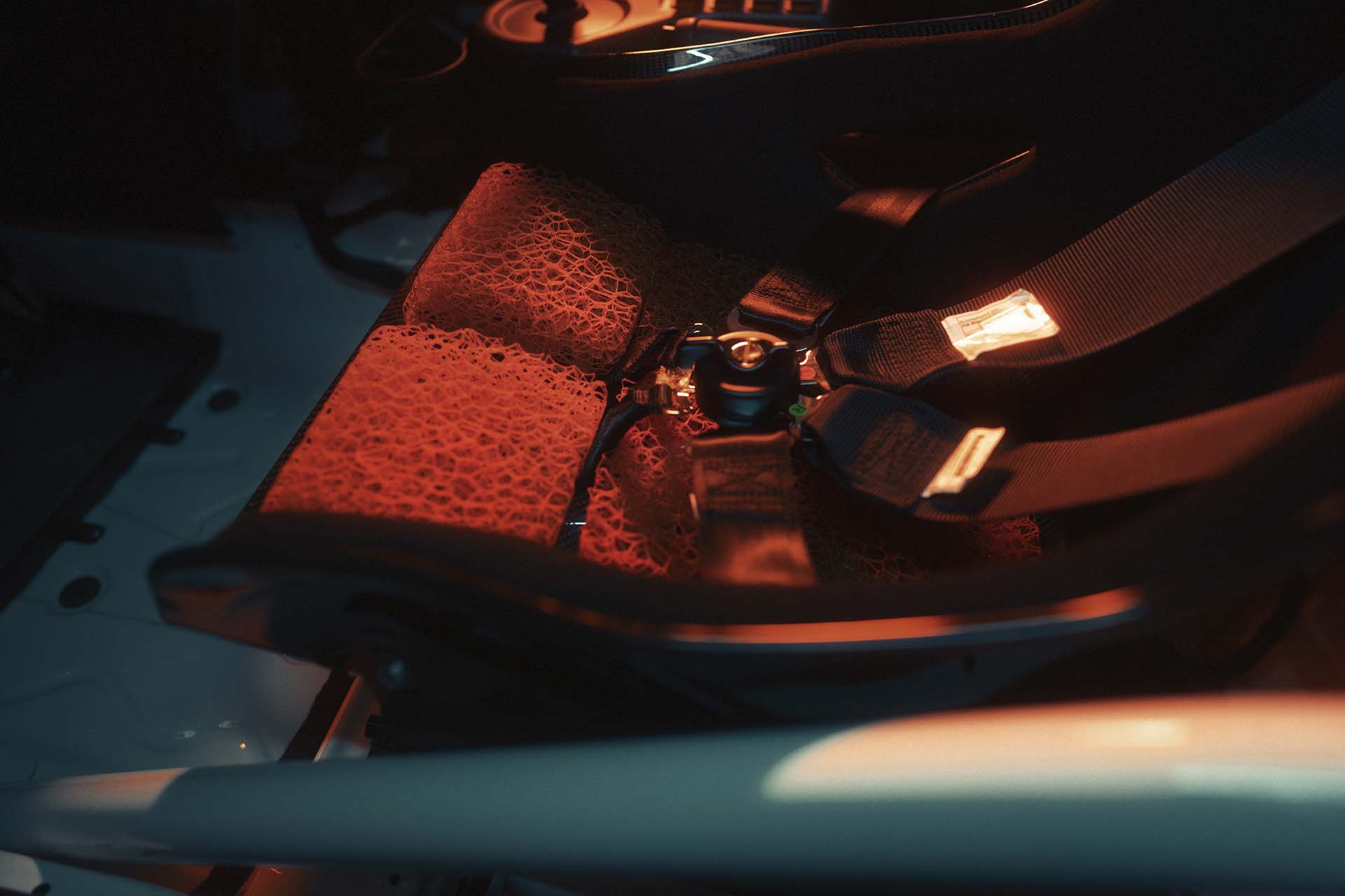 El amortiguador de impactos minimalista del volante y el panel de refuerzo en el lado derecho del volante son componentes de alta calidad hechos a medida, al igual que el carenado de la consola central y los paneles de las puertas del lado del conductor. Otro punto a destacar son las almohadillas extraíbles del asiento deportivo, igualmente impresas en 3D, cuya innovadora estructura combina comodidad, robustez y modularidad. El grosor, la dureza y el color de las almohadillas se pueden adaptar según sea necesario de acuerdo con la fisonomía, el peso y el gusto personal del conductor en cuestión.