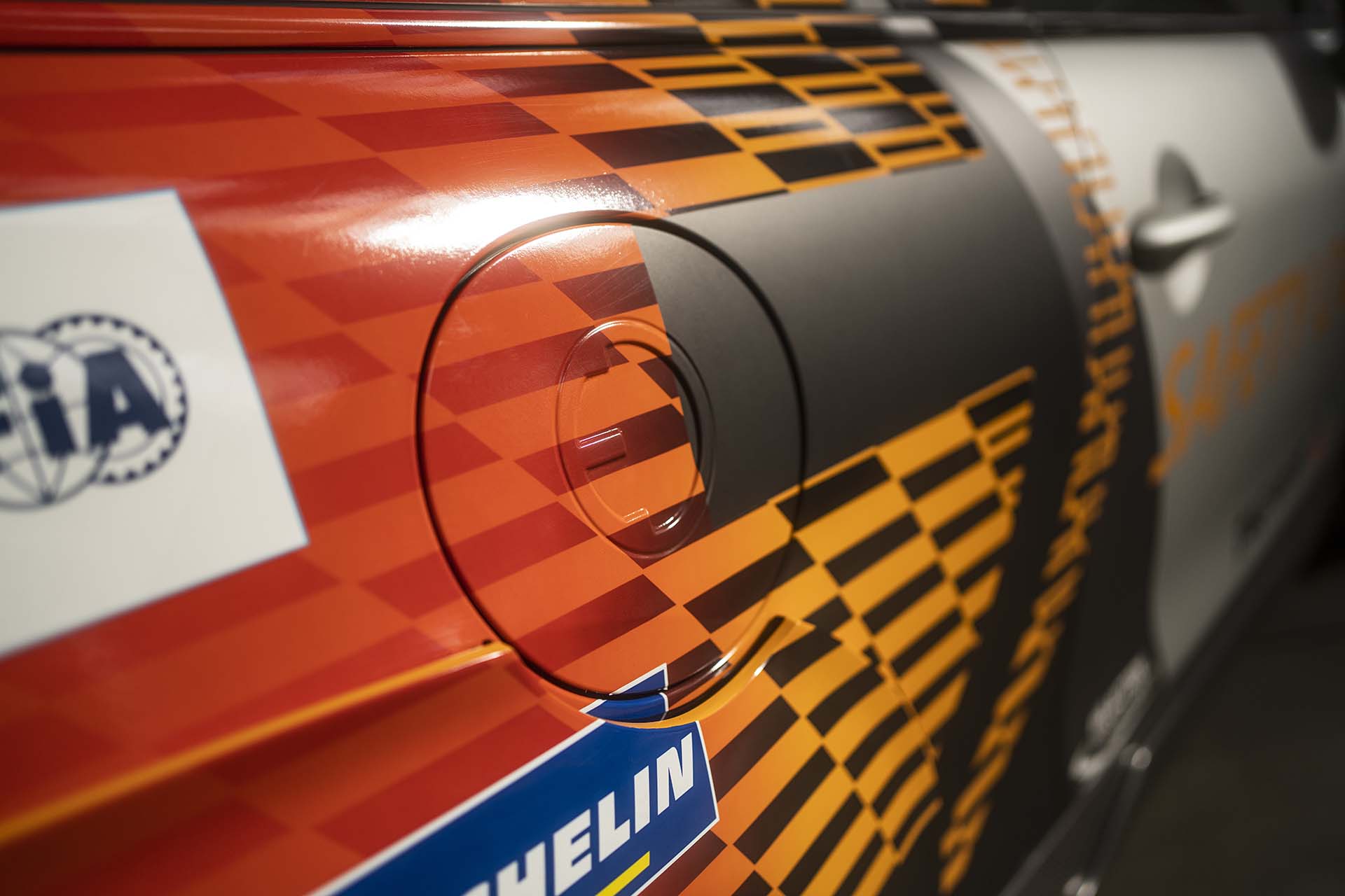 Los mundos de color respectivos del MINI Electric y John Cooper Works se fusionan aquí en una sola declaración. El color principal de la carrocería es un plateado mate que se extiende más allá del punto central del vehículo. Una envoltura de alto brillo con un degradado de color en dos etapas: Highspeed Orange a Curbside Red, que luego cubre el resto de la carrocería en la parte trasera. El contraste entre las superficies mate y brillante aporta una suavidad extra a la silueta, mientras que las líneas de separación diagonales claras entre los diferentes colores inyectan más dinamismo. En los flancos, un patrón inspirado en una bandera a cuadros comparte el escenario con un gran logotipo del MINI Electric, que también se puede encontrar en la parrilla del radiador, en el toldo y en la parte trasera. El Safety Car también incluye gráficos específicos de las regulaciones y relacionados con el patrocinador, que agregan mayor intensidad visual al carácter de carreras del vehículo.