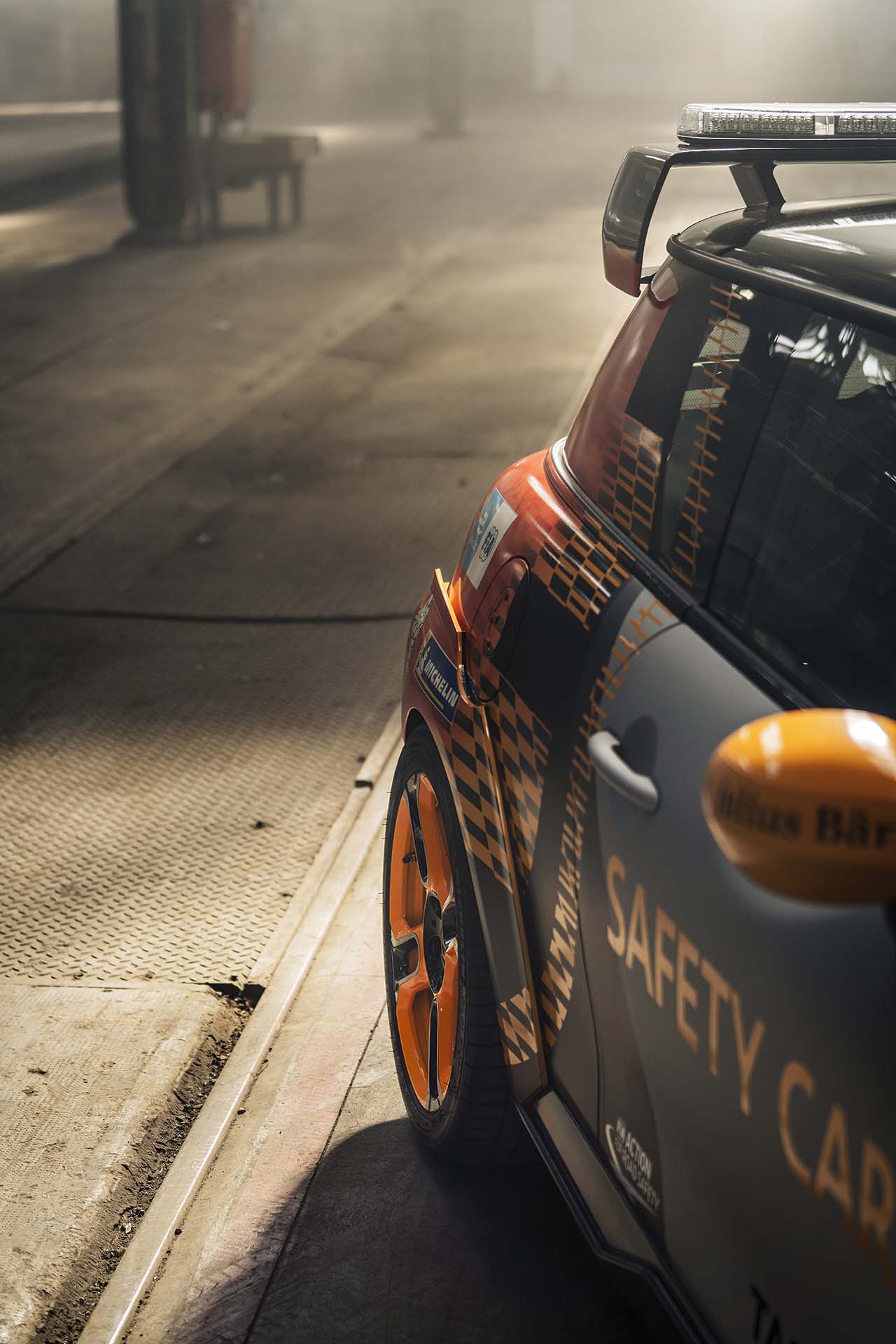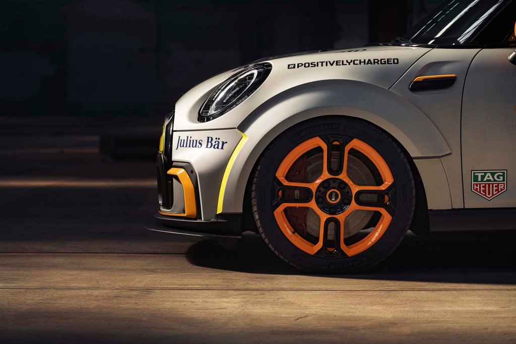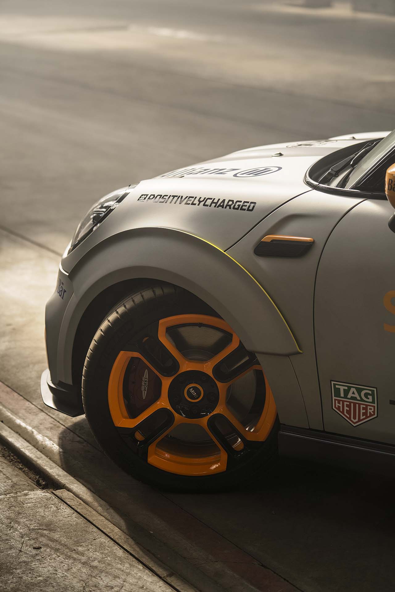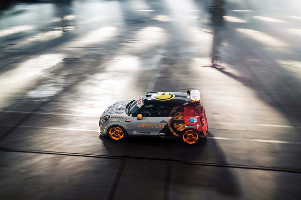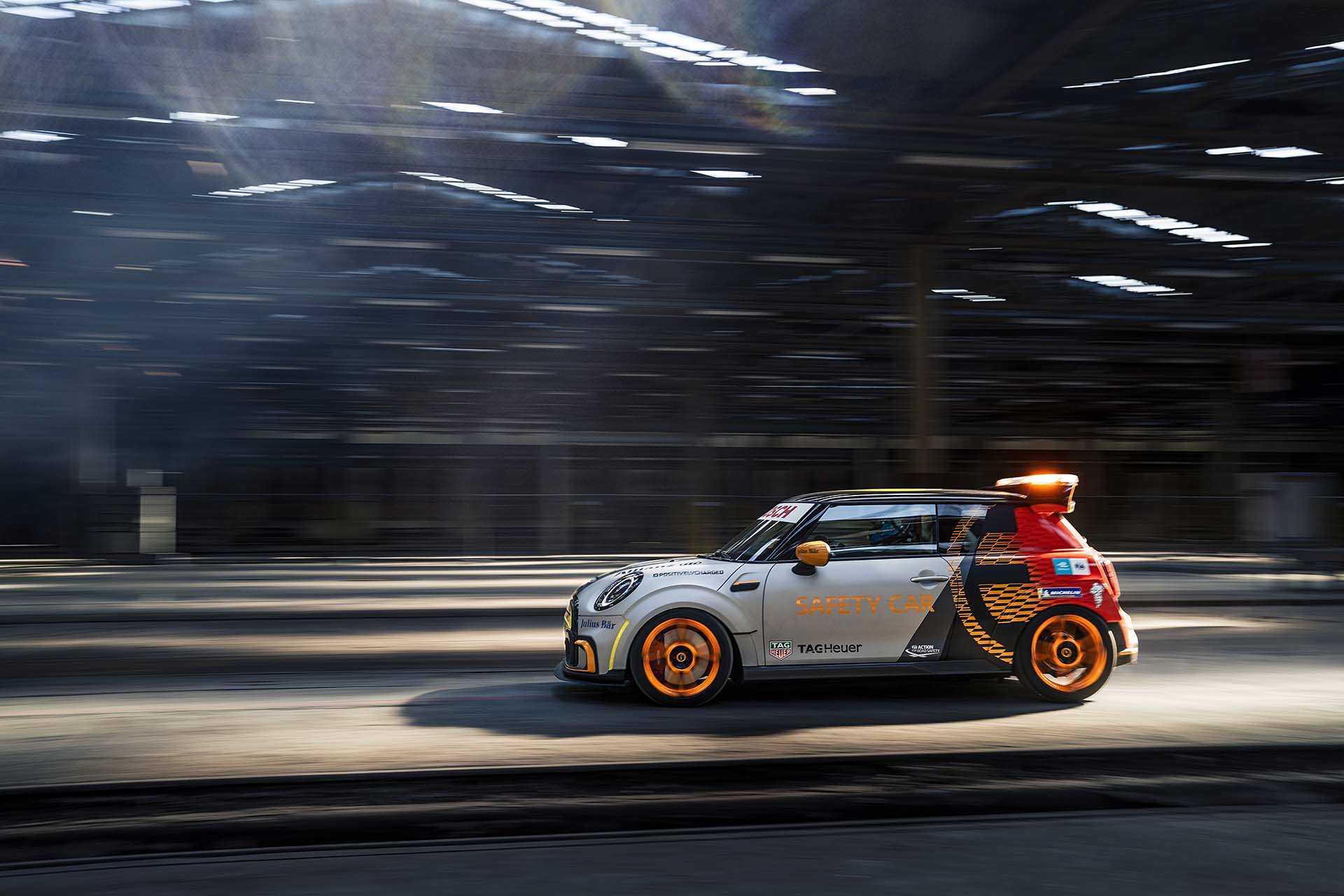 Detrás del diseño visualmente poderoso del MINI Electric Pacesetter inspirado en JCW se encuentra la experiencia de BMW Motorsport. La adherencia rigurosa a los principios de diseño ligero le da al Safety Car un peso de aproximadamente 1,230 kg – lo que lo hace aprox. 130 kg más ligero que el MINI Cooper SE de serie. El sistema de propulsión, también basado en el del MINI Cooper SE, produce 135 kW y 280 Nm, lo que le permite al MINI Electric Pacesetter inspirado en JCW hacer el 0 a 100 km/h en 6.7 segundos (modelo de serie: 7.3 s) y de 0 a 60 km/h en 3.6 segundos (modelo estándar: 3.9 s). Sin embargo, aún más importantes para un Safety Car son las cifras de rango medio. Aquí, el MINI Electric Pacesetter inspirado en JCW muestra todos los talentos de su sistema de propulsión eléctrica rico en par con transmisión de una sola velocidad, lo que permite una recuperación de 80 a 120 km / h en 4.3 segundos (modelo de serie: 4.6 s).