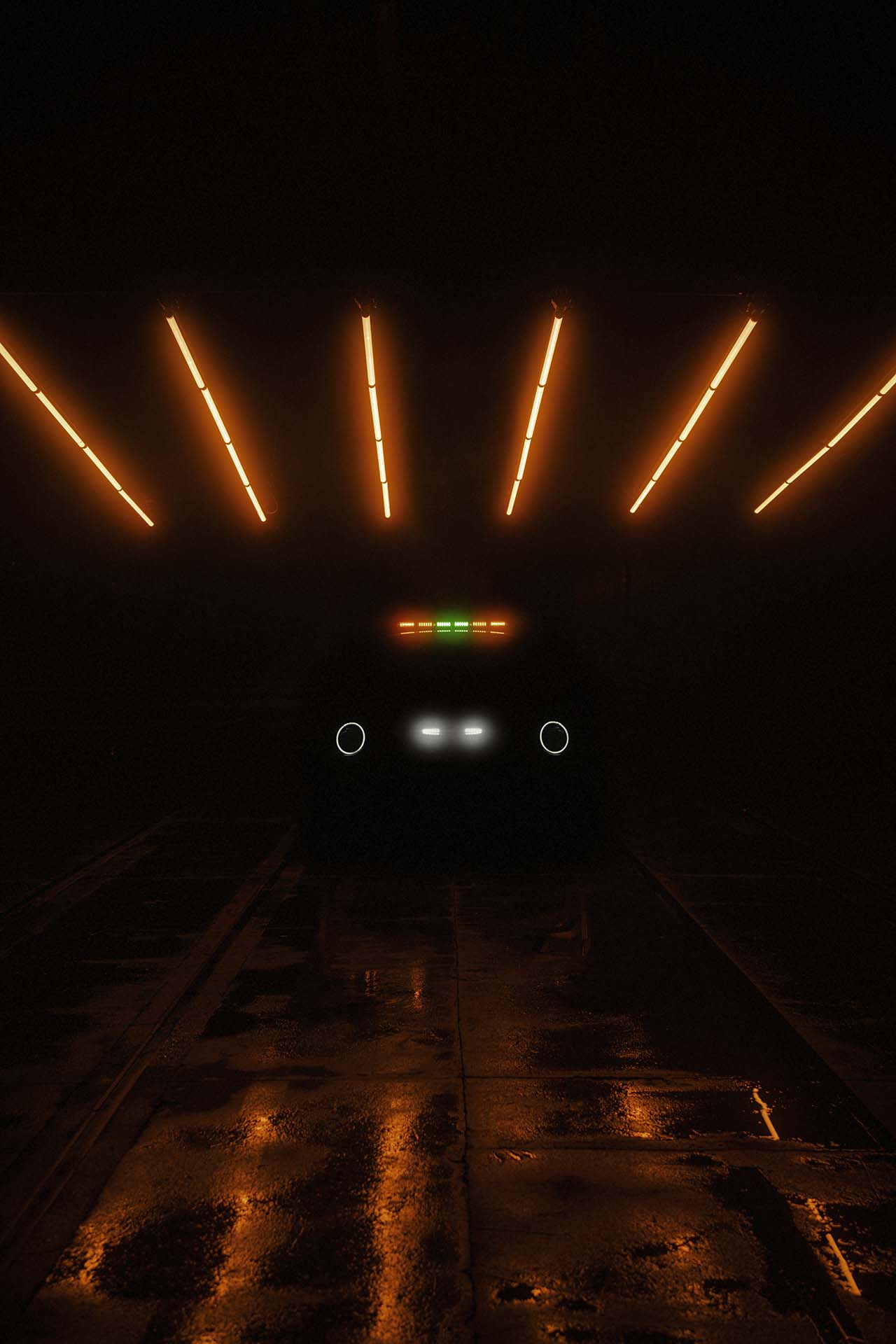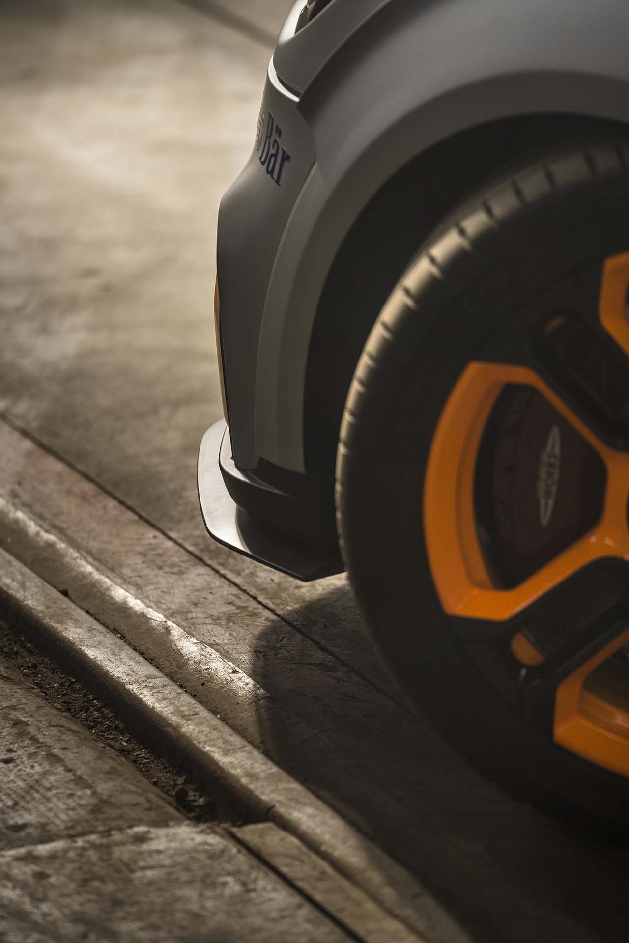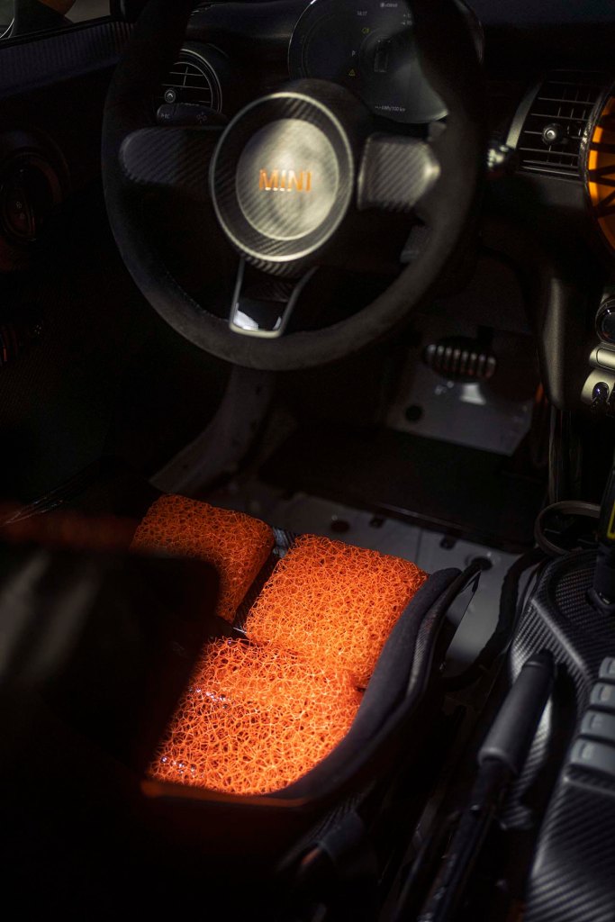 El MINI Electric Pacesetter inspirado en JCW también presenta una figura extremadamente dinámica desde el lateral. La interacción de las salpicaderas recortadas geométricamente acentuadas (con bordes aerodinámicos cuidadosamente colocados) y faldones laterales deportivos le da al vehículo la apariencia de avanzar incluso antes de girar una rueda. Junto con las ruedas de mayor diámetro, que casi llenan las salpicaderas, estos elementos refuerzan la honrada “postura sobre las ruedas” de MINI. Las salpicaderas recortadas y los spoilers están hechos, o más precisamente, impresos en 3D, a partir de fibra de carbono reciclada, en Oxford. Las líneas y superficies de acento amarillo en los elementos aerodinámicos (por ejemplo, las salpicaderas recortadas, los faldones y el alerón trasero) brindan un vistazo a la optimización del flujo de aire que tiene lugar en estas áreas y agregan un toque visual a los deflectores de aire y los bordes aerodinámicos. Los rines forjados de aleación ligera de 18 pulgadas en diseño bicolor negro-neón / naranja aportan una profundidad visual significativa y una mayor complejidad a los elementos de cuatro radios del MINI John Cooper Works GP.