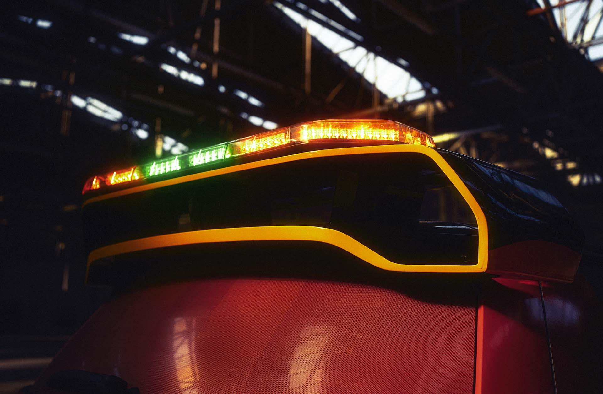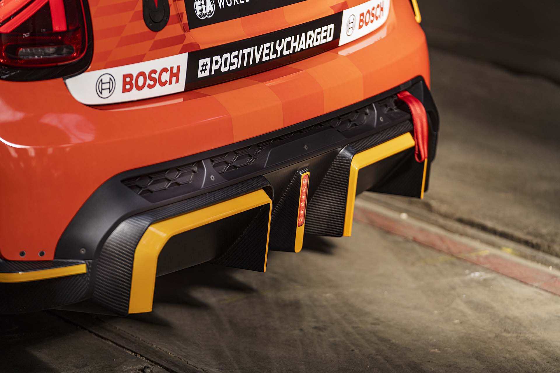 La parte trasera en negro y Curbside Red se encuentran y utilizan superficies acentuadas en amarillo para extender el llamativo lenguaje de diseño desde el frente y los flancos, y hace una declaración extremadamente moderna y dinámica. El prominente alerón trasero montado en el toldo, con flujo de aire y líneas de acento amarillo, también integra la unidad de luz de señalización y fue impreso en 3D en Plant Oxford. Las salpicaderas ensanchadas acentúan la vía ancha del vehículo y la transición sin problemas al faldón trasero pronunciado. El faldón trasero tiene recortes alrededor de las ruedas, despejando la vista de los neumáticos de carreras de mayor agarre. Entre las ruedas se encuentra un difusor sin adornos. Cuando se ve el vehículo desde este ángulo, los acentos en amarillo energético y la falta de tubos de escape lo identifican como un vehículo impulsado por un sistema de propulsión eléctrica.