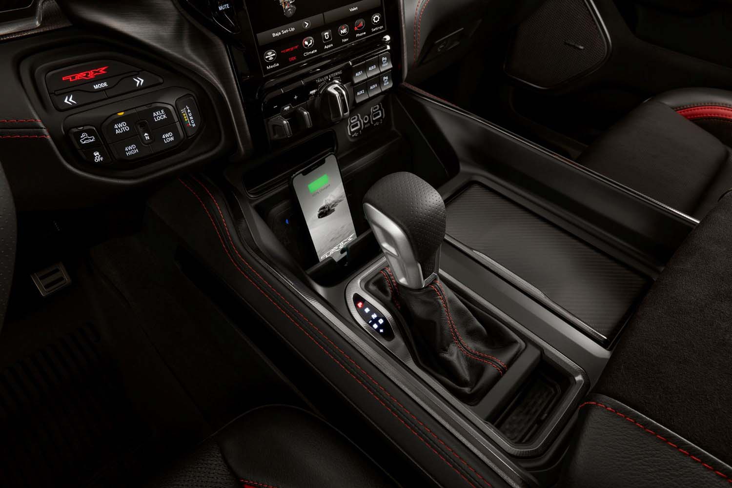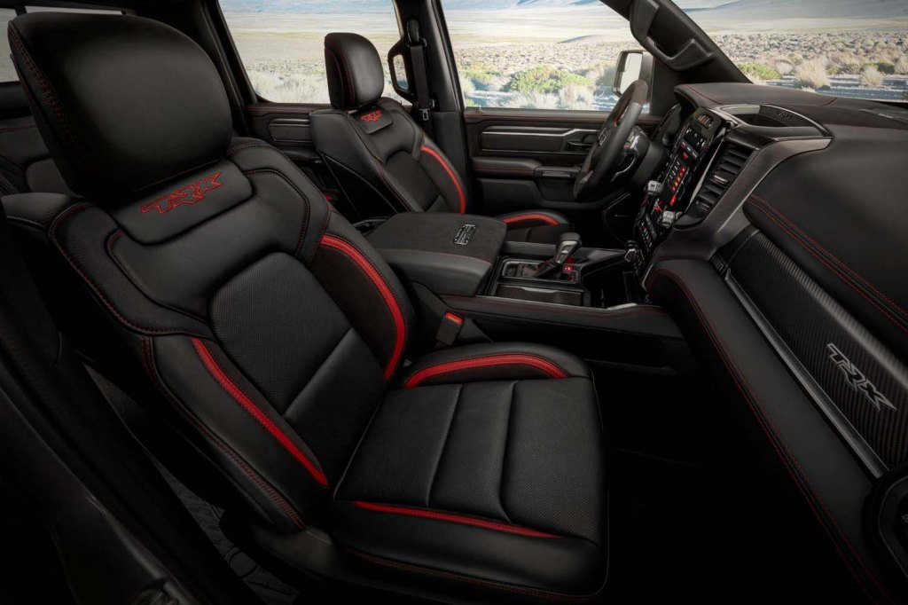 El espacioso interior cuenta con materiales Premium que además de piel, incluyen gamuza, costuras e insertos en color rojo, así como insertos en auténtica fibra de carbono que maximizan el lujo y la deportividad al interior de RAM 1500 TRX.