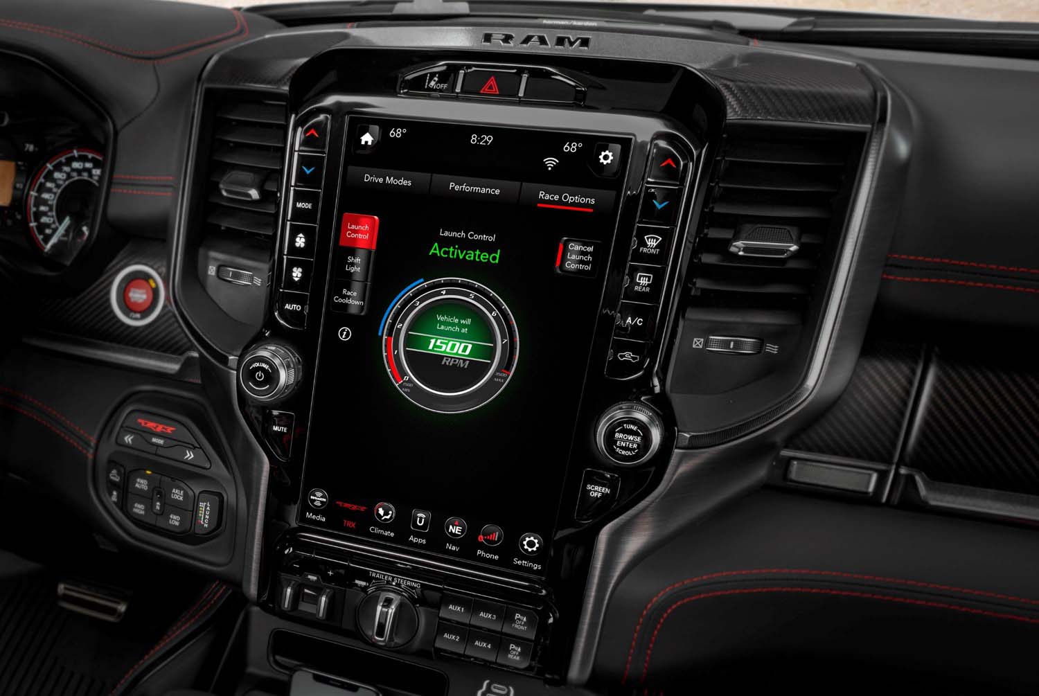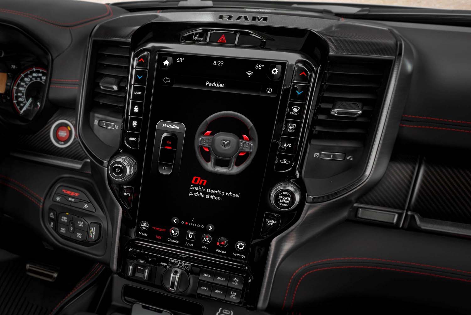 Ram 1500 TRX 2021 cuenta con la pantalla Uconnect 4C NAV de 12 pulgadas completamente configurable que puede mostrar una única aplicación o dividirse en dos mitades para operar dos sistemas al mismo tiempo. El Uconnect 4 permite la integración de dispositivos móviles personales vía CarPlay y Android Auto, y una auténtica experiencia personalizada que se realiza a través del sistema de audio Harman Kardon de 900 watios, 19 bocinas y 10 subwoofers.