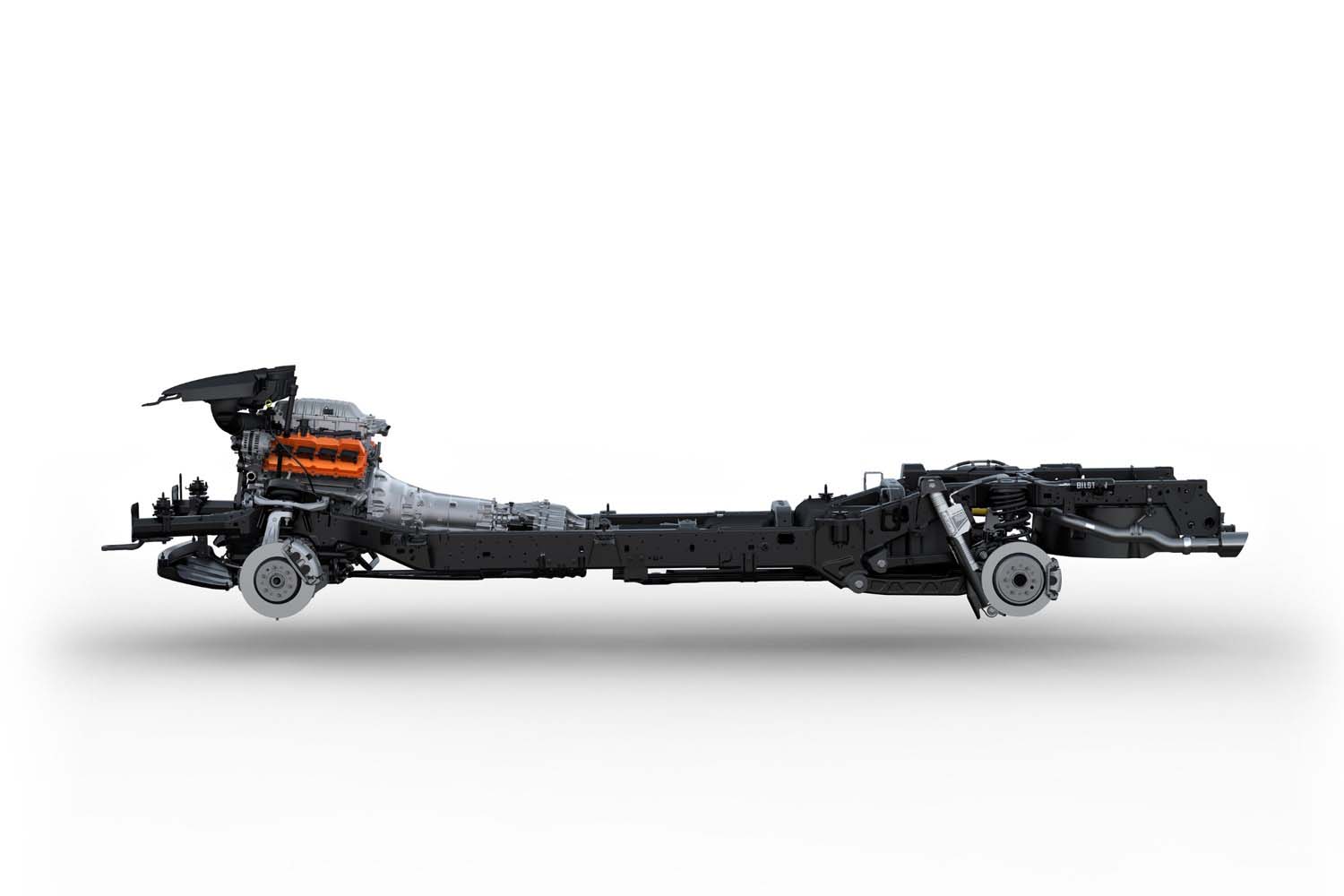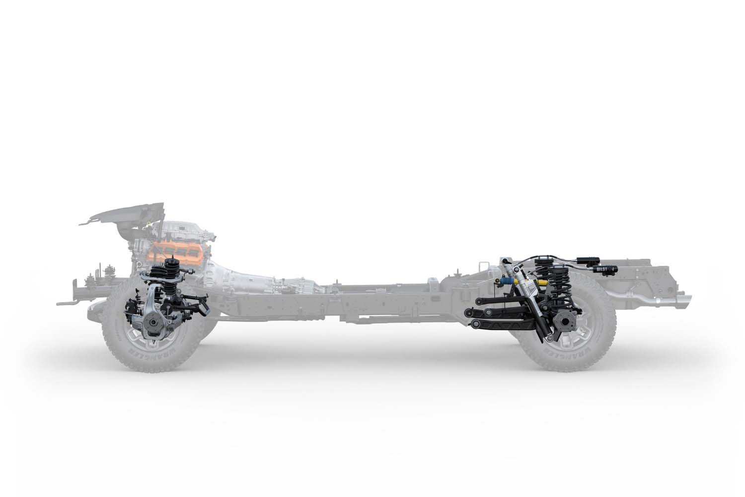 El nuevo y exclusivo sistema de suspensión delantera independiente con amortiguación activa, inspirado en todoterrenos para correr en el desierto bajo condiciones extremas, incorpora brazos de control inferiores y superiores de aluminio forjado con especial atención a los ángulos de entrada y salida durante el recorrido de la suspensión. Está fabricado en aluminio de alta resistencia, lo que incrementa su resistencia y durabilidad, y ha sido diseñado tomando en cuenta el aumento de la anchura del eje. El esquema de suspensión trasero comprende un eje sólido trasero Dana 60 con una relación de 3.55, con bujes flotantes y amortiguador para saltos, amortiguación activa y sistema de cinco brazos y muelles helicoidales calibrado para proporcionar la mejor combinación posible de marcha, manejo y confort sin importar la superficie.