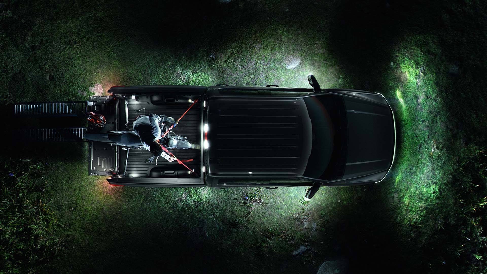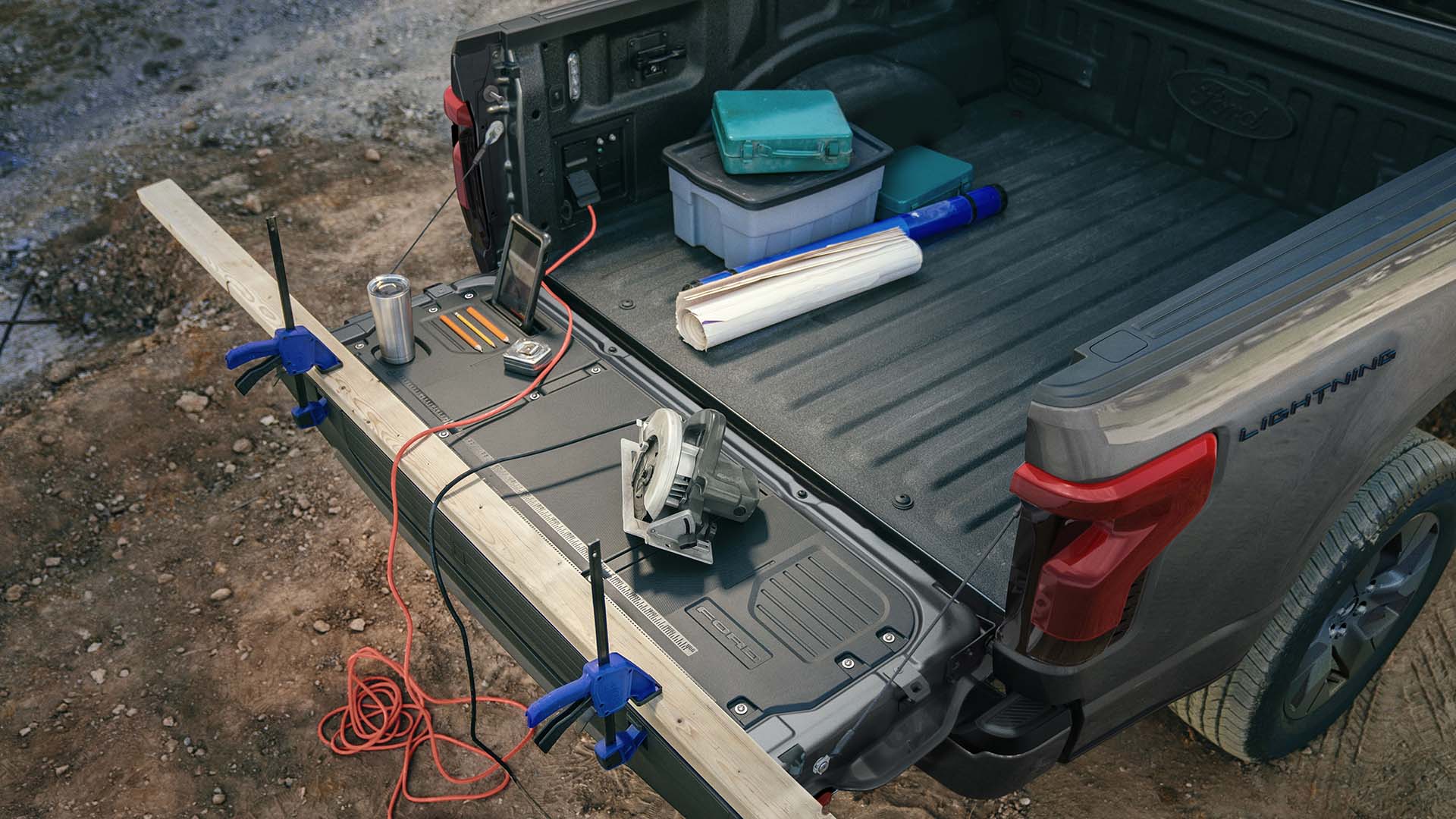 La capacidad de alimentación no se limita al hogar. Con el sistema Pro Power Onboard mejorado, los clientes pueden aprovechar las tomas de corriente integradas para alimentar directamente una variedad de herramientas, aparatos electrónicos y electrodomésticos fuera de casa. Con hasta 9.6 kW de energía eléctrica disponible en sus versiones Lariat y Platinum; hasta 2.4 kW disponibles a través del maletero delantero y hasta 7.2 kWa través de las tomas de corriente dentro de la de la cabina y caja.