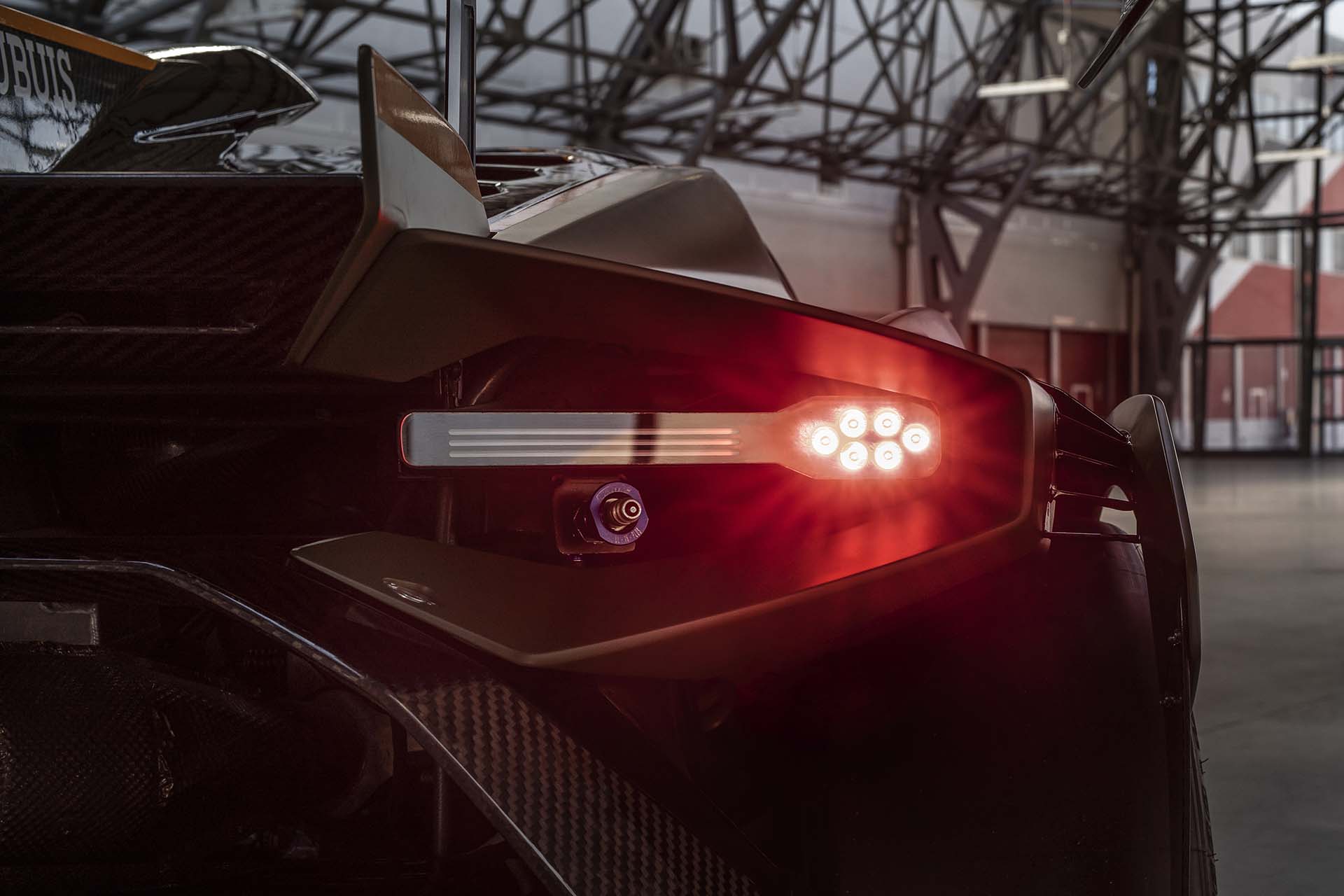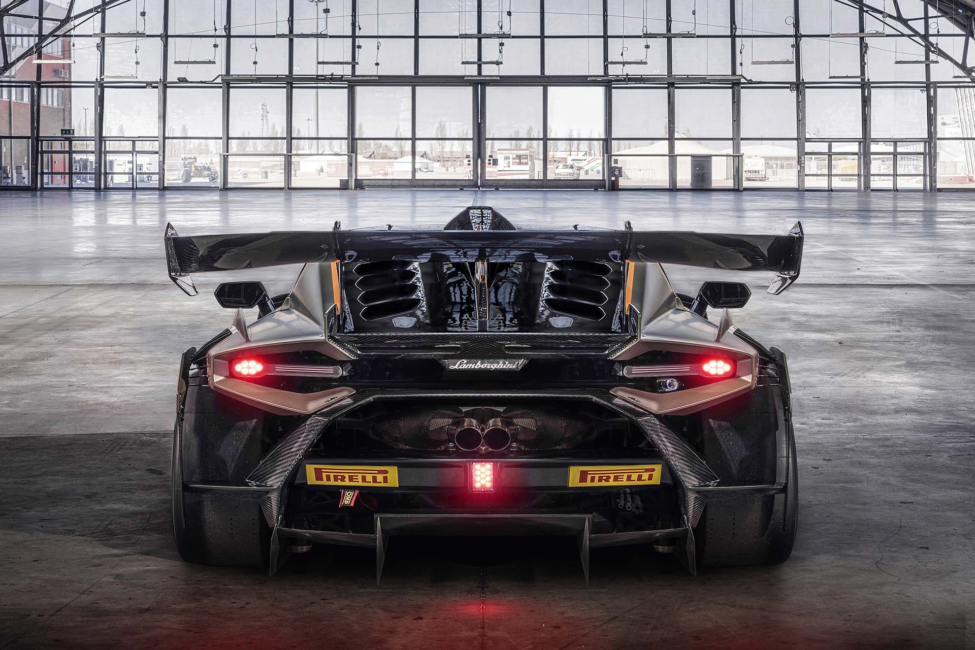 En la parte trasera, dominada por el amplio alerón de carbono, destacasu minimalismo y ligereza. Los marcos de los nuevos pilotos deLED homenajean el diseño del Countach y se apoyan con eficacia enel parachoques de carbono en forma de arco, que conecta de manera armónica los apéndices aerodinámicos situados detrás de las ruedas con las rediseñadas aletas del difusor.
