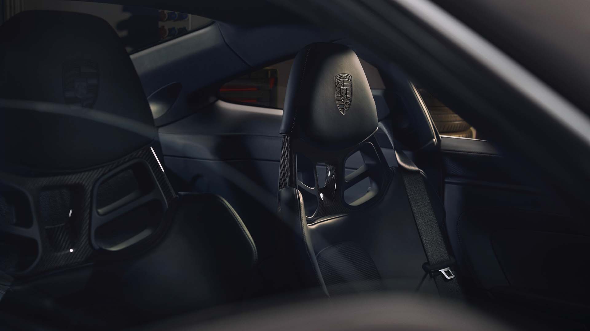 En el 911 GT3 con paquete Touring se respira un aire clásico en el interior, con el cuero negro como elemento destacado, que tapiza el volante, el selector del cambio, la cubierta de la consola central, los apoyabrazos y las correas para cerrar las puertas, entre otros elementos. El color negro está presente en el techo y en los asientos parcialmente tapizados en cuero, con las secciones centrales de tela negra. Estos asientos cuentan con costuras en ese mismo tono y en los reposacabezas figura el escudo de Porsche en relieve. Los protectores de los umbrales de las puertas y las molduras decorativas del tablero y de la consola central están hechos de aluminio negro cepillado.