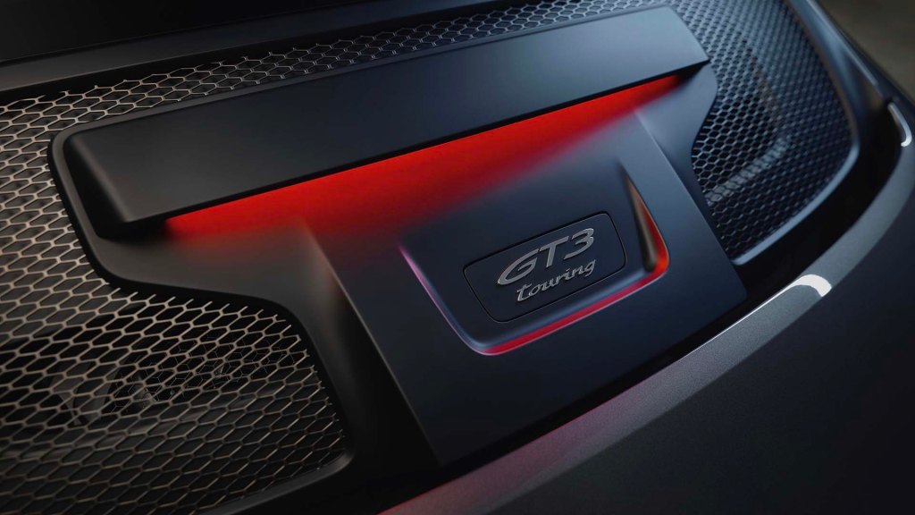 Un elemento que distingue a esta versión es el emblema ‘GT3 Touring’ que se encuentra sobre la parrilla del capó trasero. Tanto las molduras de las ventanillas como las salidas del tubo de escape deportivo son de color plateado. Como opción estas piezas pueden ir pintadas en negro satinado brillante, así como los grupos ópticos delanteros tintados en negro.