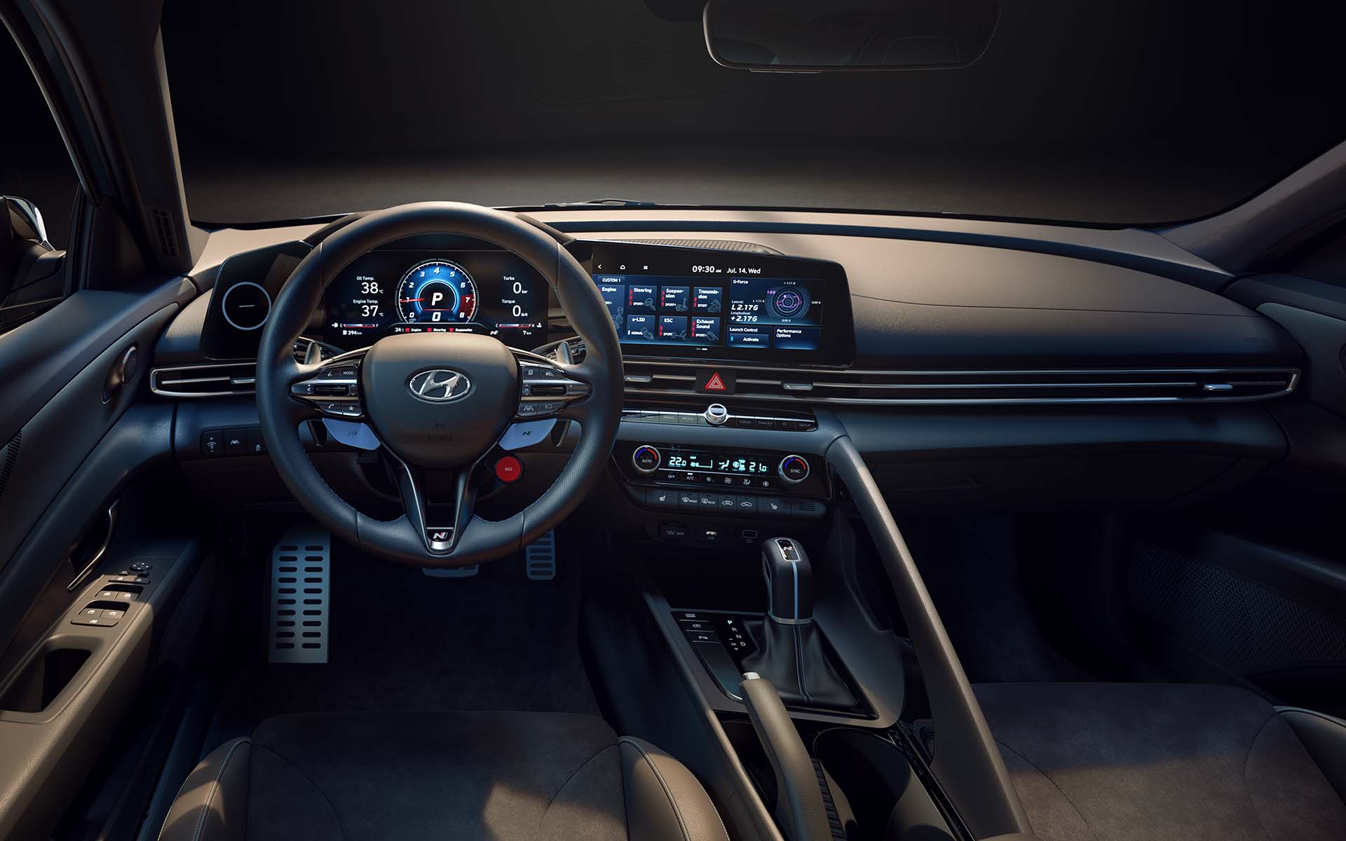 En el volante con levas de cambio, el botón NGS (solo DCT) que aumenta la potencia en 10 ps durante hasta 20 segundos y dos botones N que establecen el modo de conducción deseado están dispuestos para adaptarse a las preferencias del conductor. Los modos de conducción se pueden personalizar y combinar con cada botón en varias combinaciones para maximizar el espíritu de conducción divertido del Elantra N.