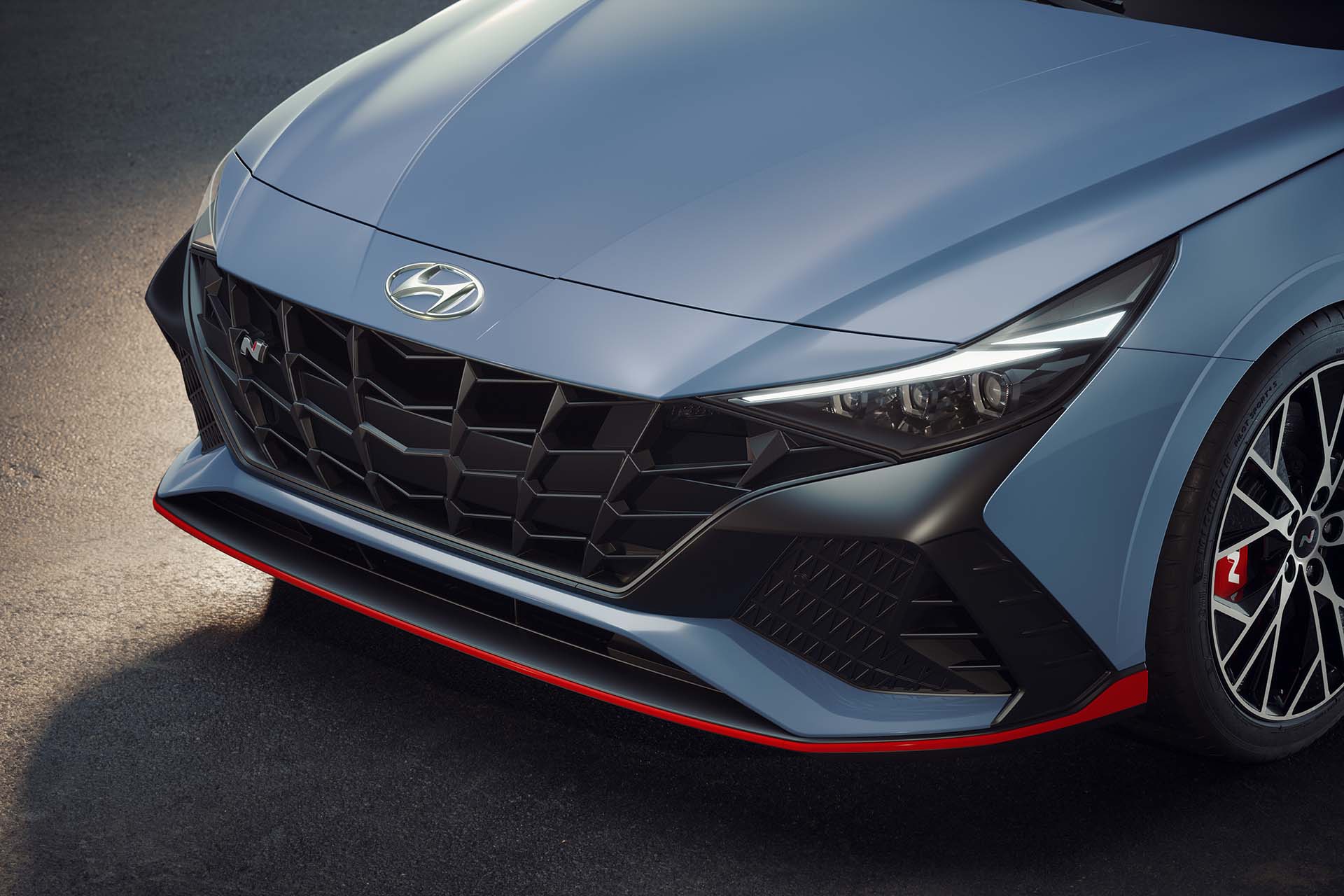 La franja roja exclusiva de N en la parte inferior del parachoques delantero continúa a lo largo de los faldones laterales del Elantra N, lo que le da al sedán un aspecto listo para la pista de carreras.