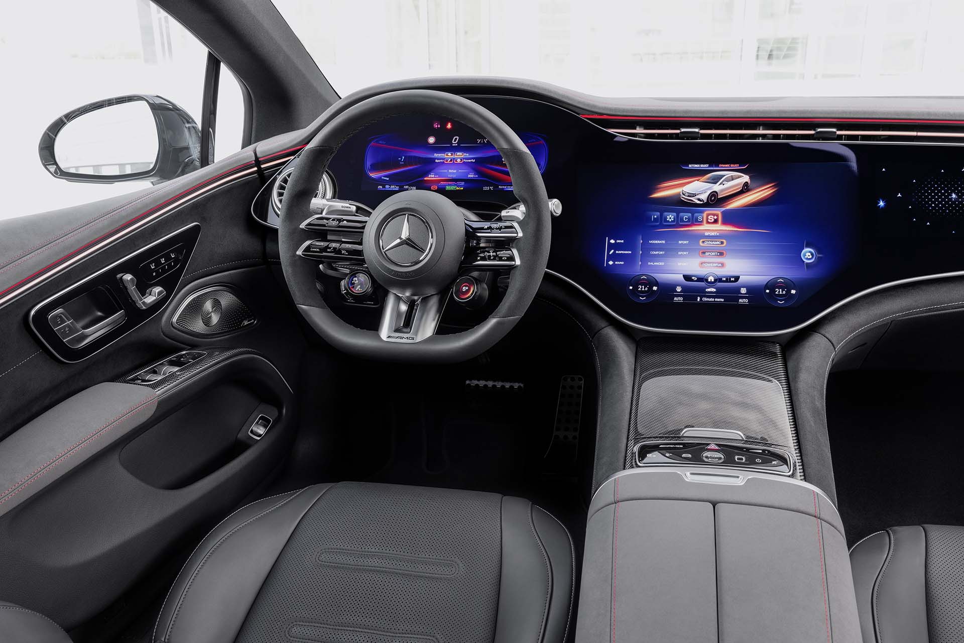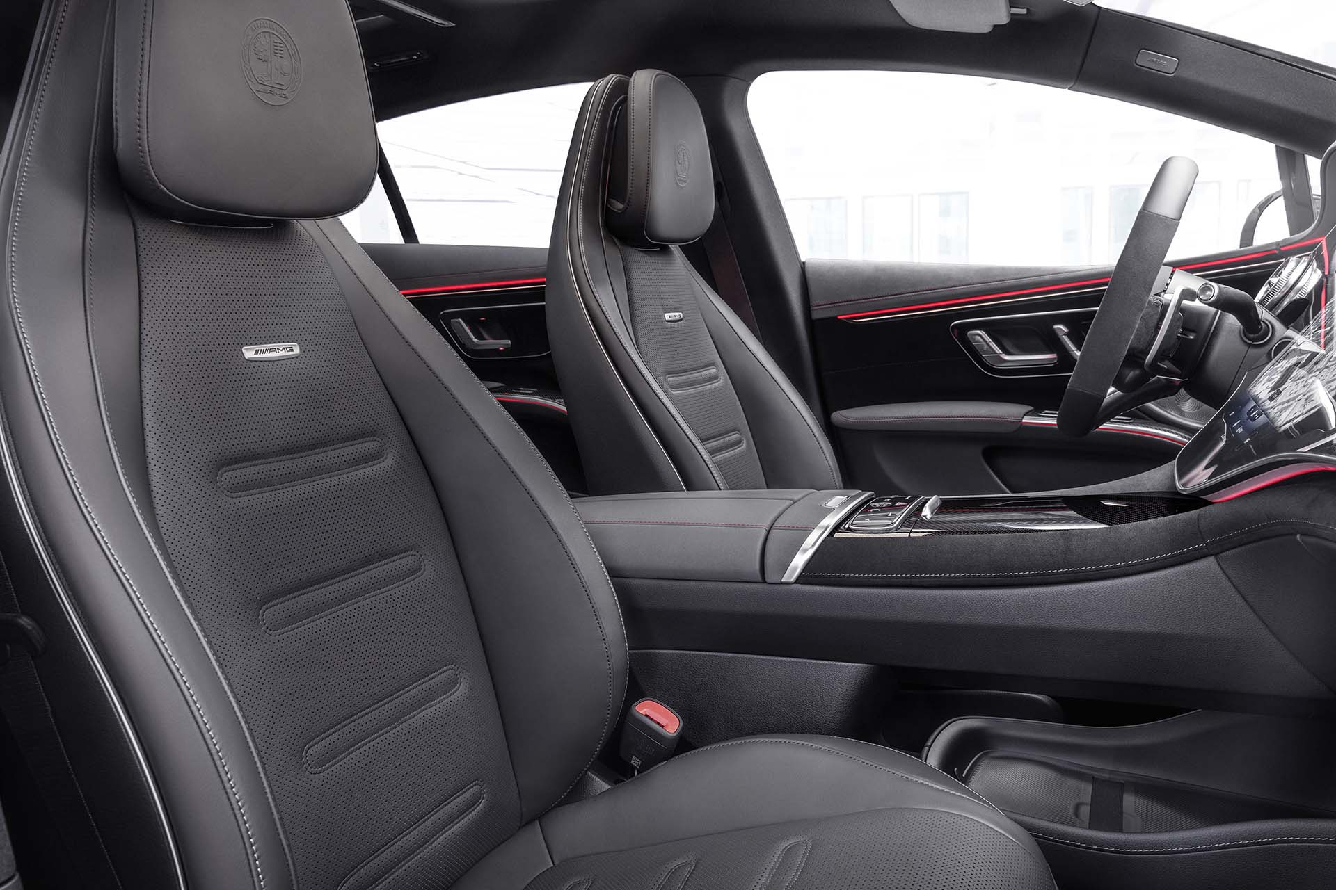 Al igual que sucede en el exterior, también en el habitáculo predominan los elementos de estilo de AMG. El EQS 53 4MATIC+ recrea para sus ocupantes un ambiente deportivo con asientos AMG, que se distinguen por un diseño individual de los módulos de acolchado, tapizados especiales en símil de cuero ARTICO con microfibra MICROCUT y costuras de adorno en color de contraste rojo. Como opción se ofrecen tapizados en napa para los asientos, también con diseño individual de los módulos de acolchado AMG. A esto se añaden numerosos detalles que subrayan el estilo individual del espacio interior: