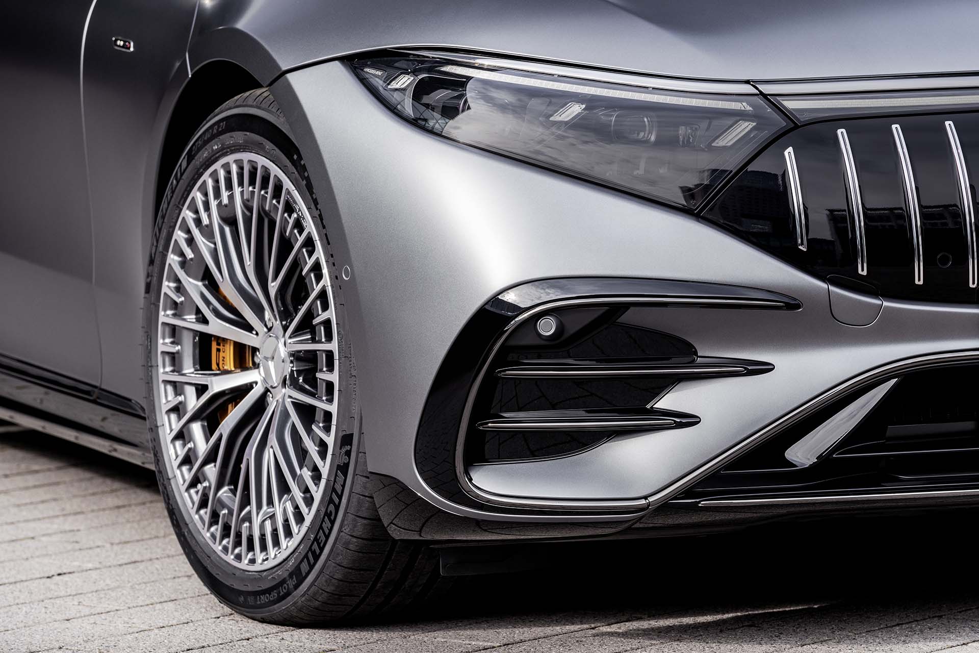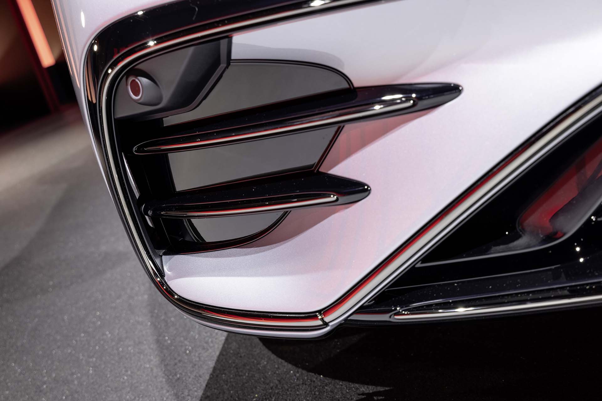 La silueta arqueada «One Bow» de la carrocería, el diseño con cabina avanzada y el portón trasero inclinado distinguen a primera vista al AMG EQS 53 4MATIC+ de los vehículos con motor de combustión interna. La filosofía de diseño se refleja en las superficies generosamente modeladas, con una reducción de las juntas y transiciones sin solución de continuidad. El diseño exterior adopta además elementos característicos de AMG y los transmite a la era de la conducción exclusivamente eléctrica. El resultado es una presencia inconfundible, con los rasgos típicos de la marca, unida a la máxima eficiencia aerodinámica. La vista frontal con los faros DIGITAL LIGHT de serie se distingue por la calandra Black Panel específica de AMG con perfiles verticales cromados estampados en caliente, estrella Mercedes integrada y distintivo «AMG». Los rasgos formales específicos continúan en el parachoques delantero, pintado del color del vehículo. El faldón delantero asume el diseño A-Wing típico de AMG, está pintado en negro de alto brillo y adornado por un elemento de adorno cromado.