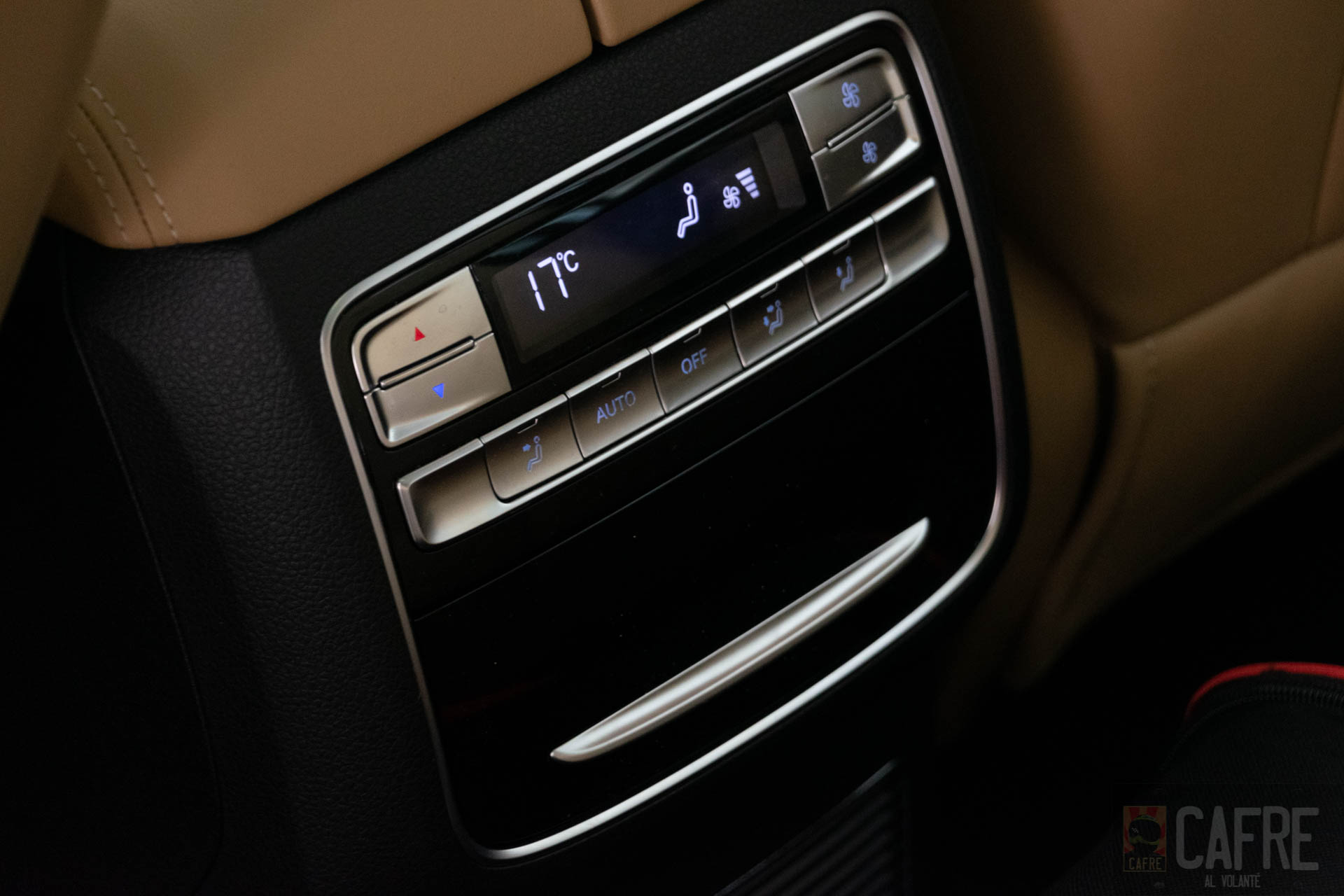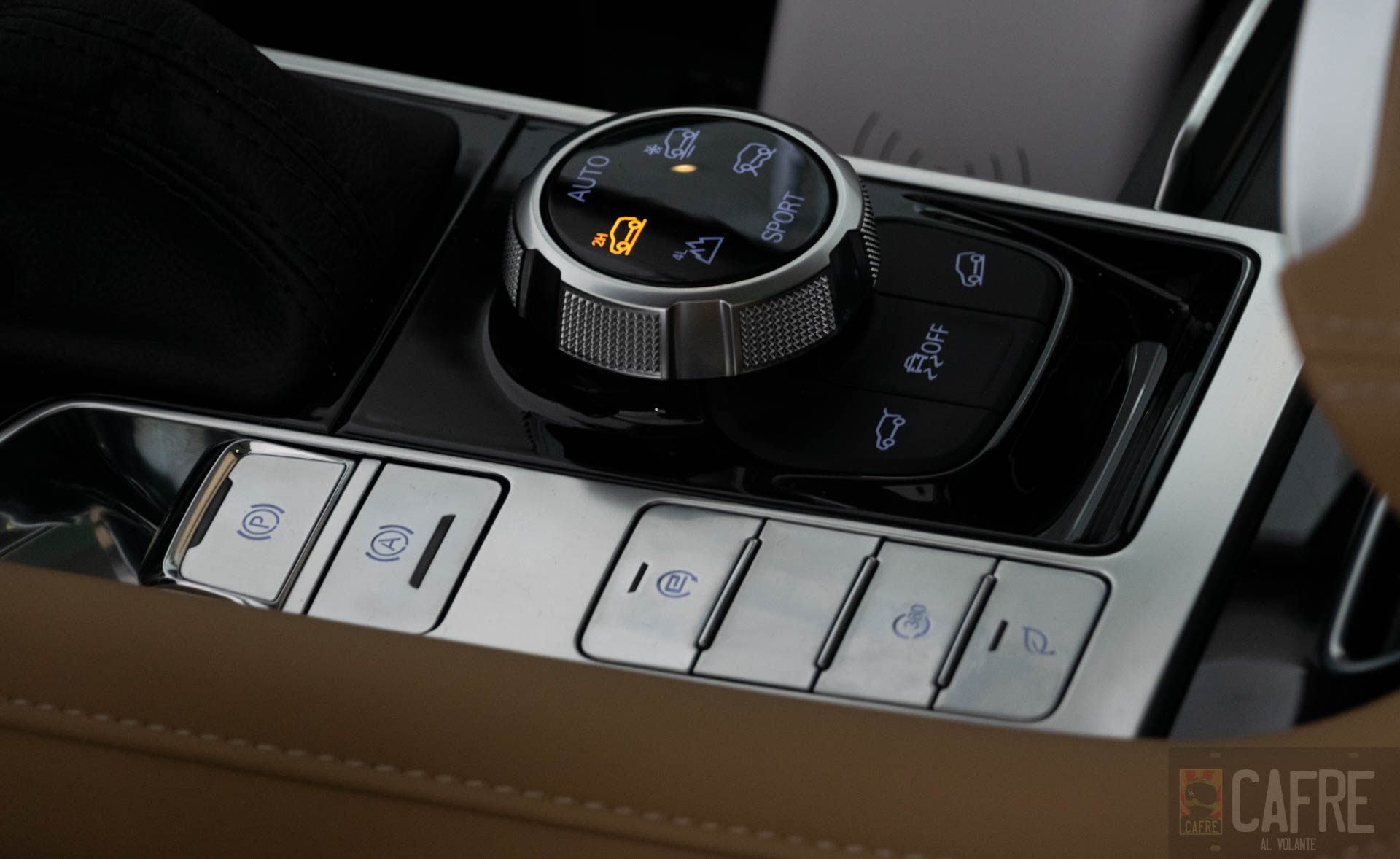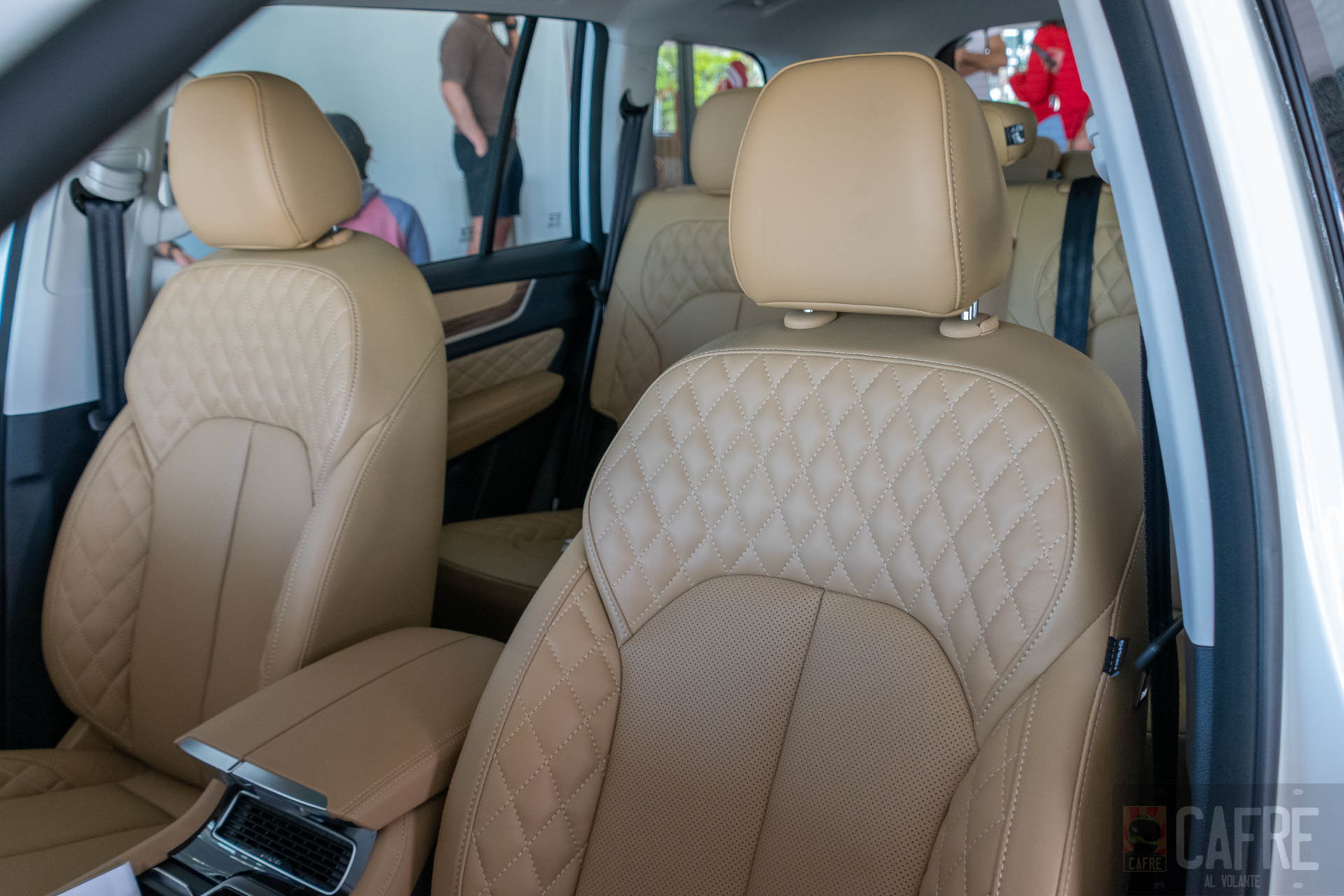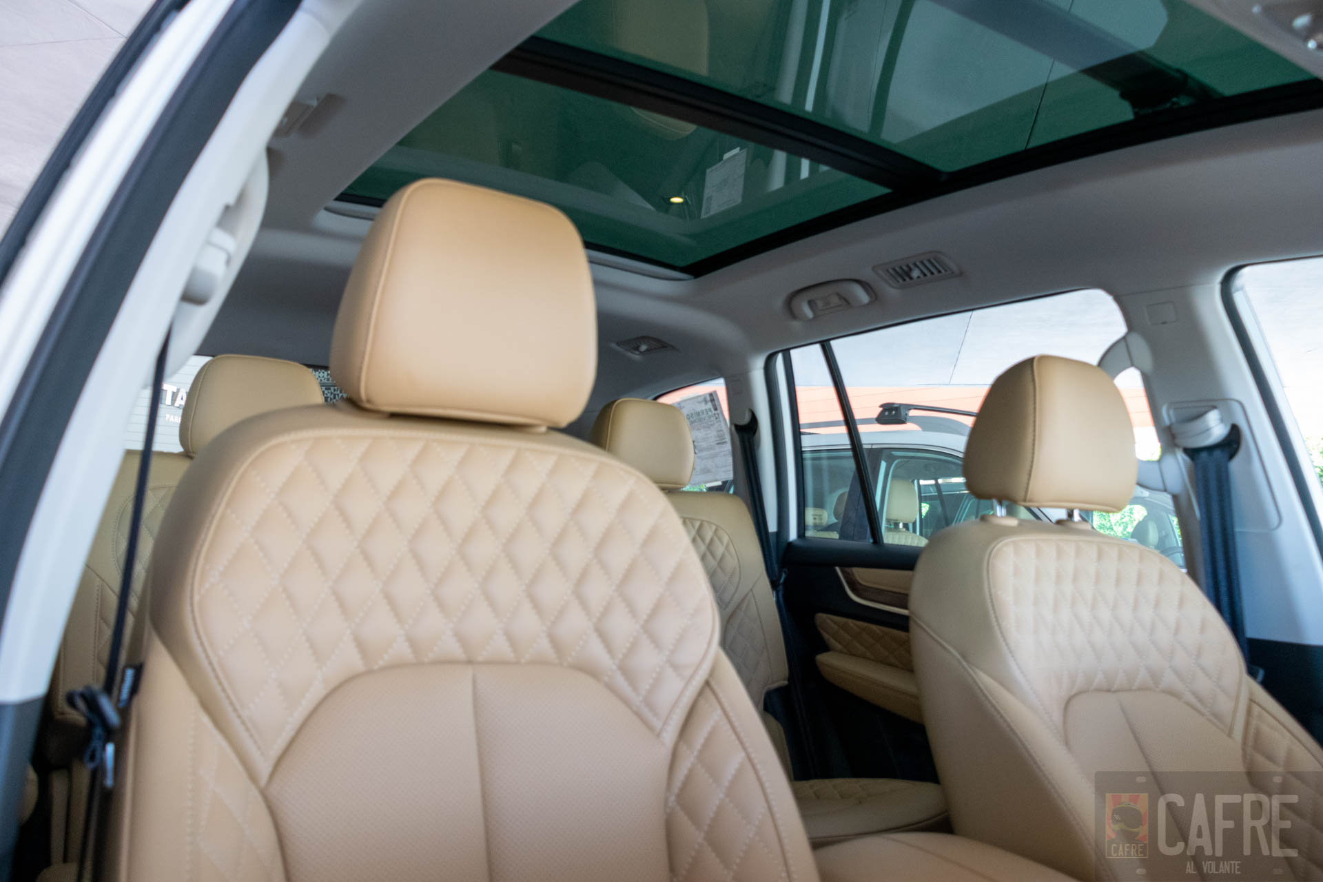 Al estar todos reunidos, nos subimos a las camionetas y empezamos a notar los detalles del interior del RX8. Los asientos están tapizados en piel en color beige para esta primera edición (aunque había una con interiores en negro que me gustó mucho), estos son eléctricos y el del conductor tiene la opción de guardar dos posiciones gracias a su memoria. Algo que vas a ver desde que te subes es el techo panorámico que abarca las dos filas con apertura para la primera fila. La segunda fila tiene opción para moverse adelante o atrás para darle espacio a la tercera fila. Uno de los detalles que se debe considerar es que, si se van a ocupar las tres filas, el espacio de carga se reduce notablemente, pero si necesitas espacio, se puede abatir la segunda y tercera fila.