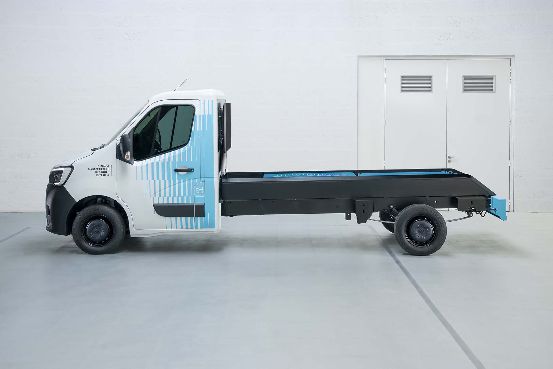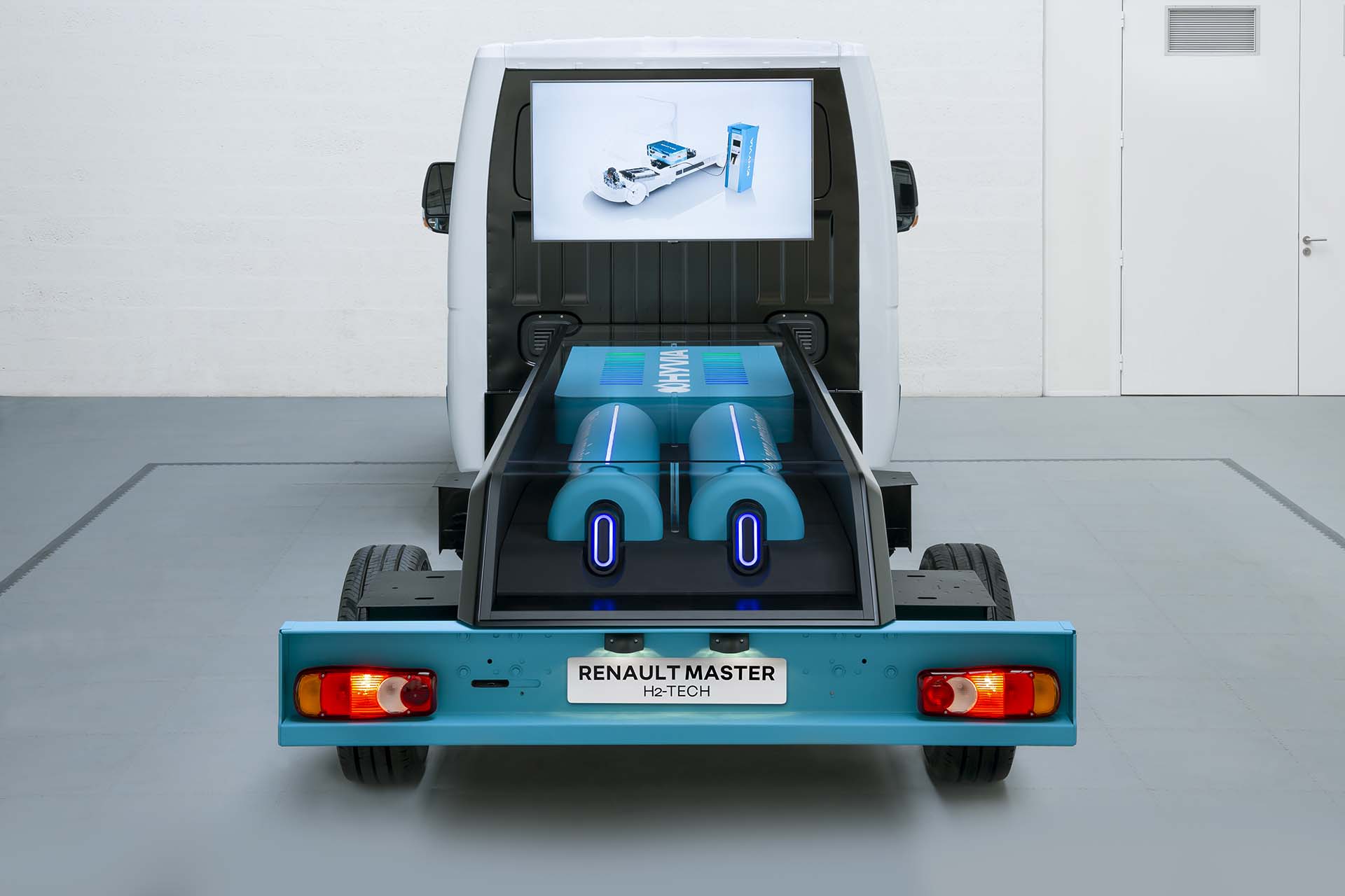 - La Master Chassis Cab H2-TECH está equipada con una pila de combustible de 30kW, una batería de 33 kWh y depósitos que contienen 3 kg de hidrógeno (2 depósitos de 1.5 kg) a 700 bares.