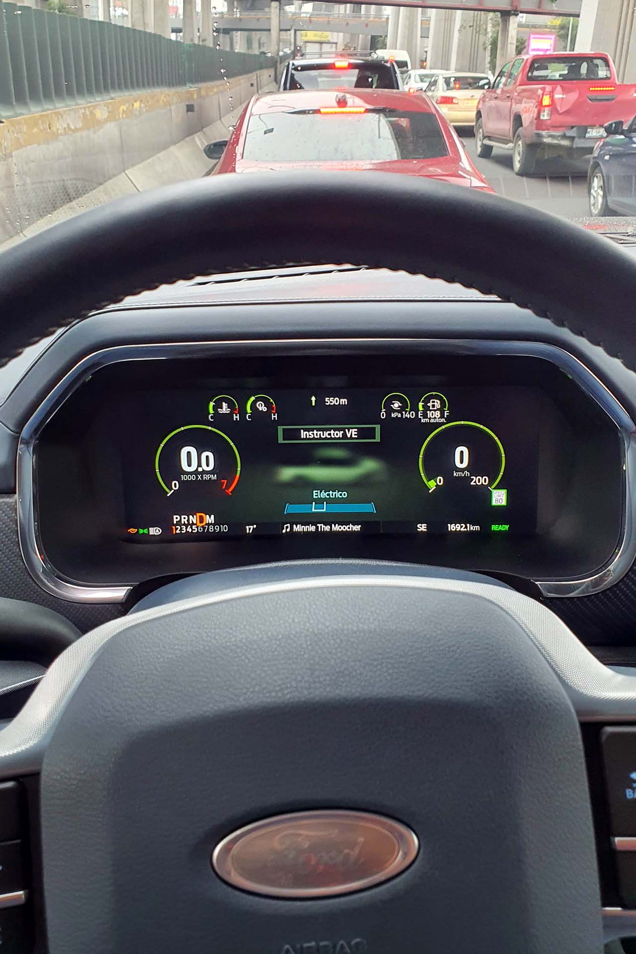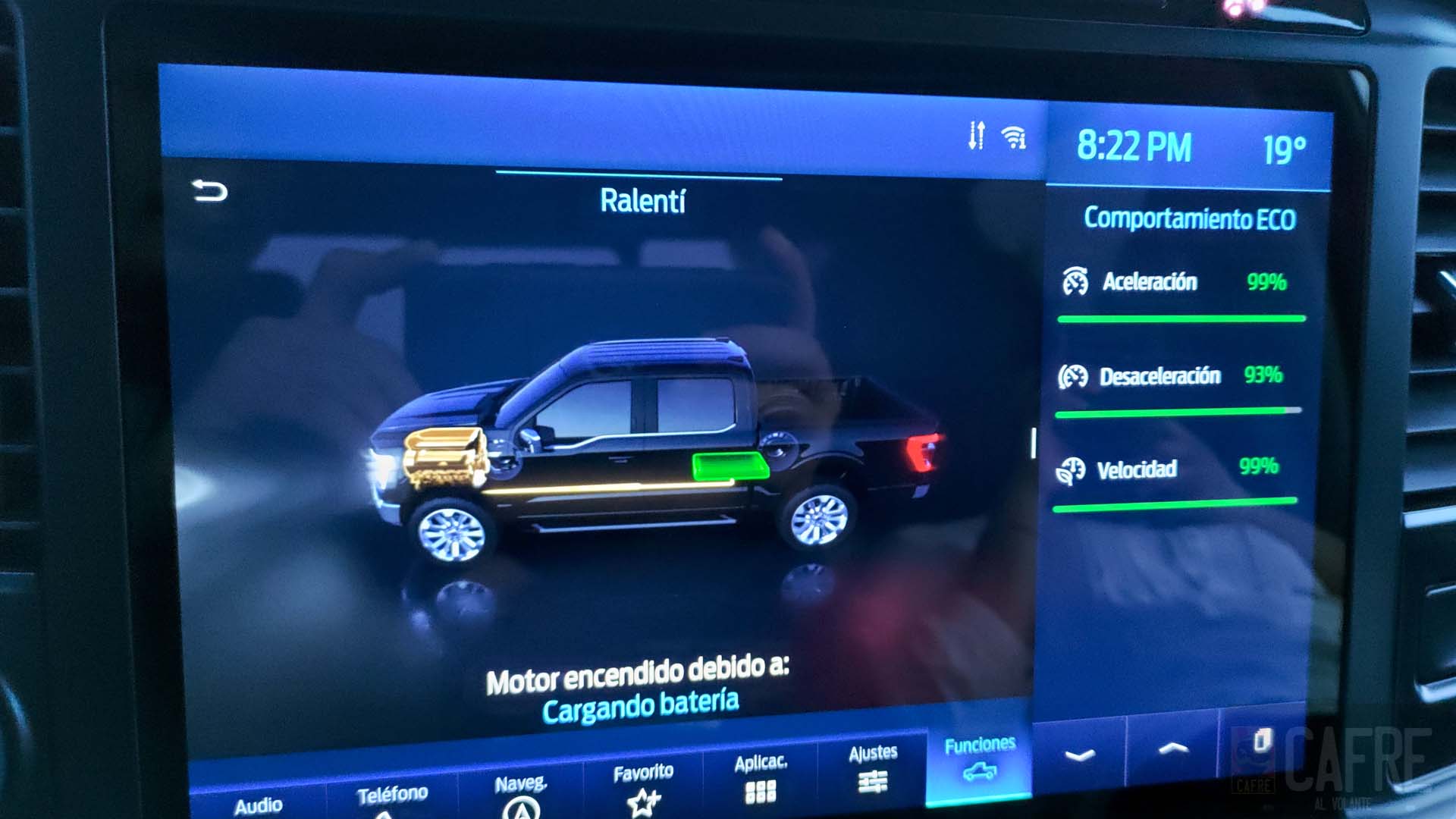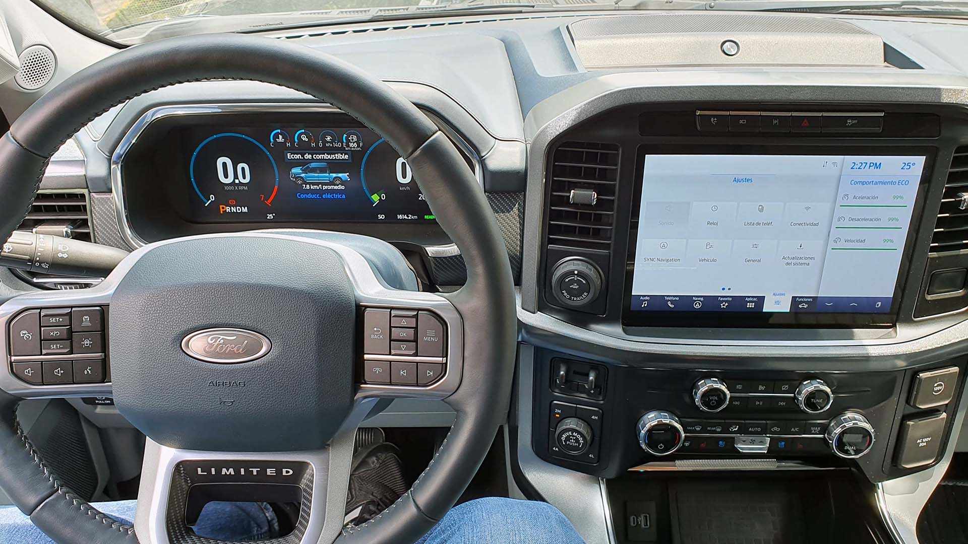 Al estar preparados para iniciar nuestro viaje oprimimos el botón de encendido y no escuchamos nada. Como buen híbrido, la motorización eléctrica será la que se encargue de mover a la F-150 al momento de pisar el acelerador, si requiere más fuerza entrará el motor de gasolina.