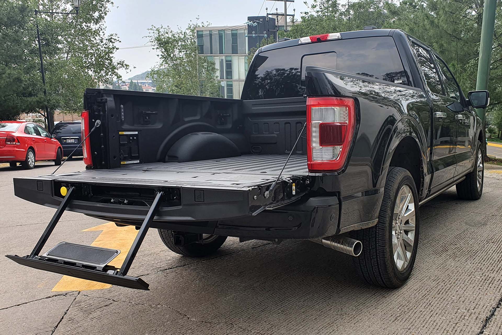 A pesar de mostrar un estilo lujoso, recordemos que también está diseñada para el trabajo, por lo que en la tapa “interior” de esta puerta funcionará como mesa de trabajo, con reglas de medición y bases para sujetar las prensas de carpintero. Debido a la altura de la caja, para subir a ella Ford integró una pequeña escalera con todo y un pequeño pasamanos articulable que se guarda en la puerta trasera. Como lo dice en su lema “Nacidos fuertes” para soportar el trabajo duro, la batea cuenta con un recubrimiento de Bedliner desde fabrica por lo que al cargarla no sufrirá daño.