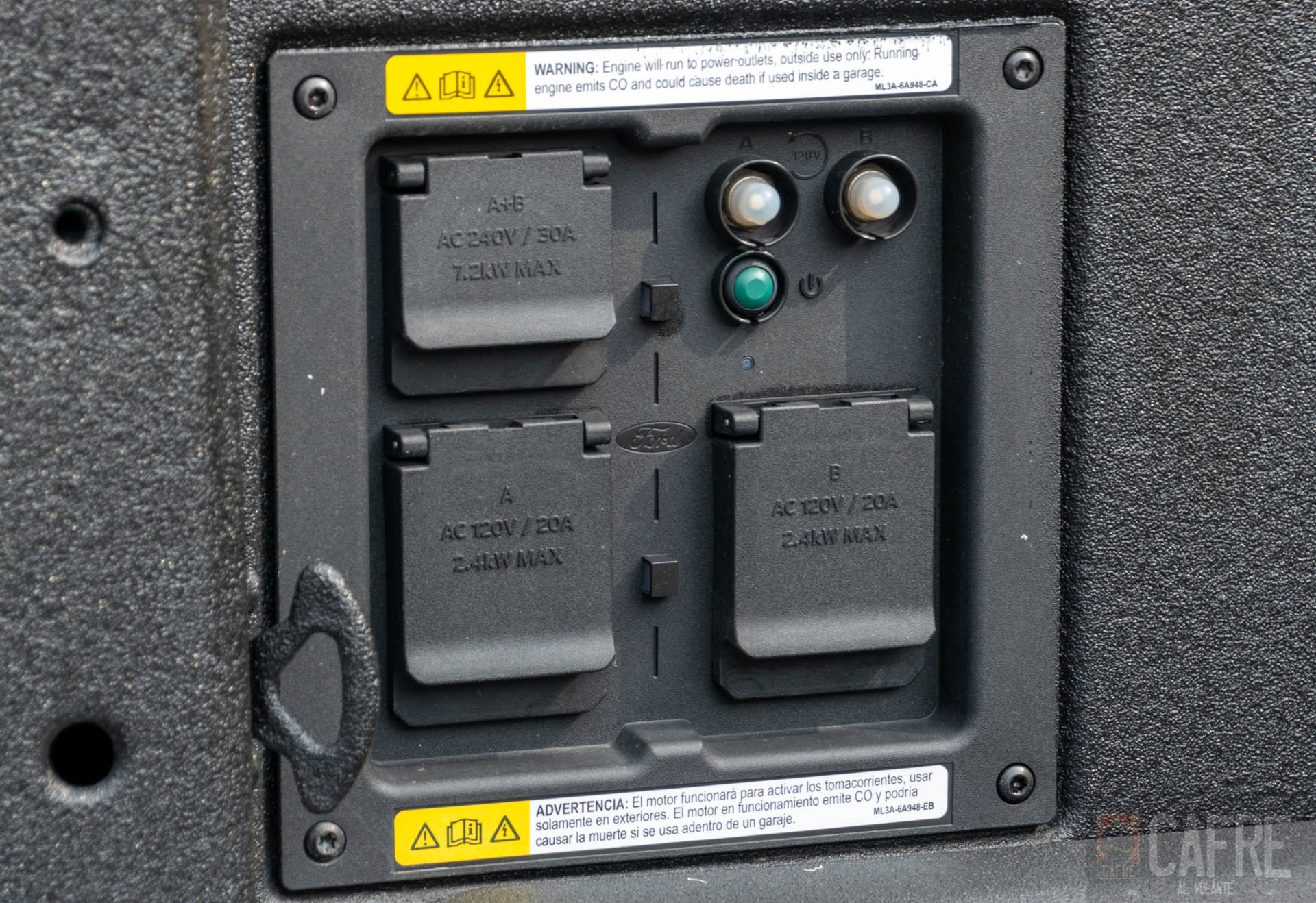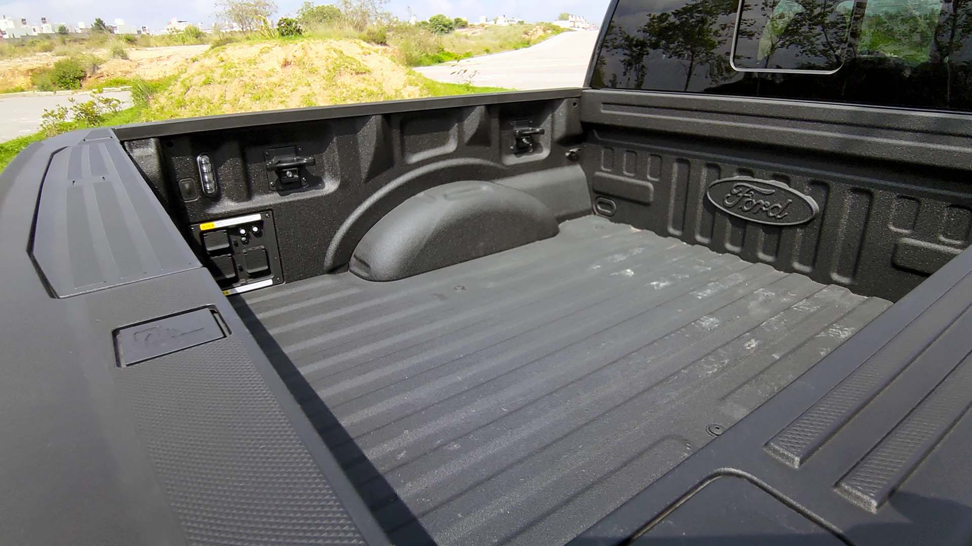 Una de las novedades que incorpora Ford a esta pickup es que podemos utilizarla como una fuente eléctrica, gracias a la toma de corriente eléctrica «Pro Power On Board» localizada al costado izquierdo de la caja, contaremos con 3 tomas corrientes de 110VCA que podrán suministrar con hasta 7.2kW de potencia de salida, con los cuales podremos conectar herramientas eléctricas o artículos para acampar, algo que sin duda es bastante útil y todo gracias a la batería del sistema híbrido.