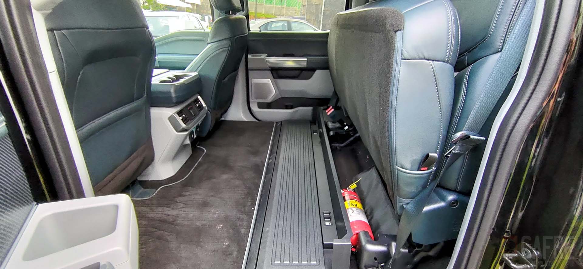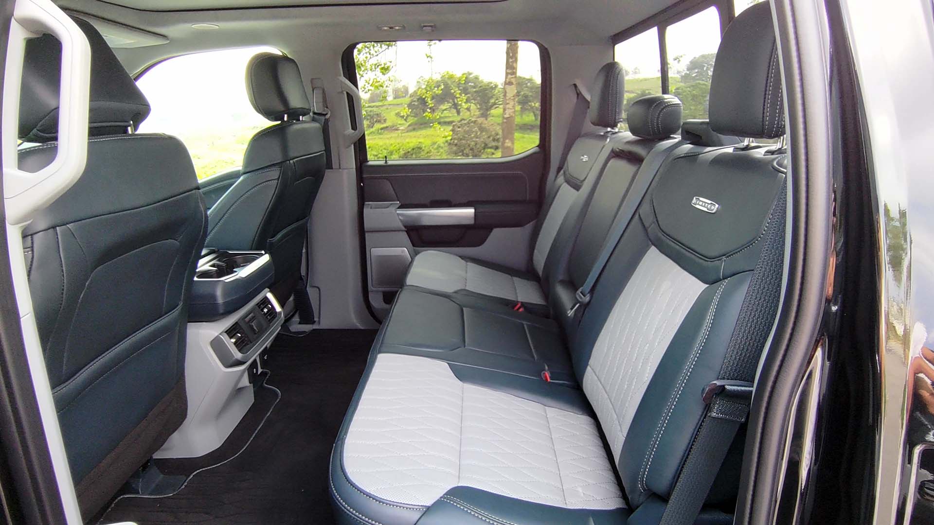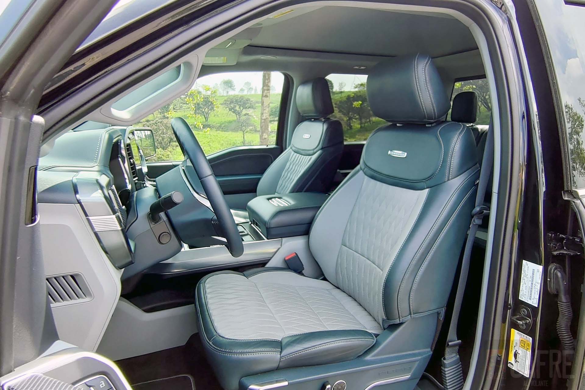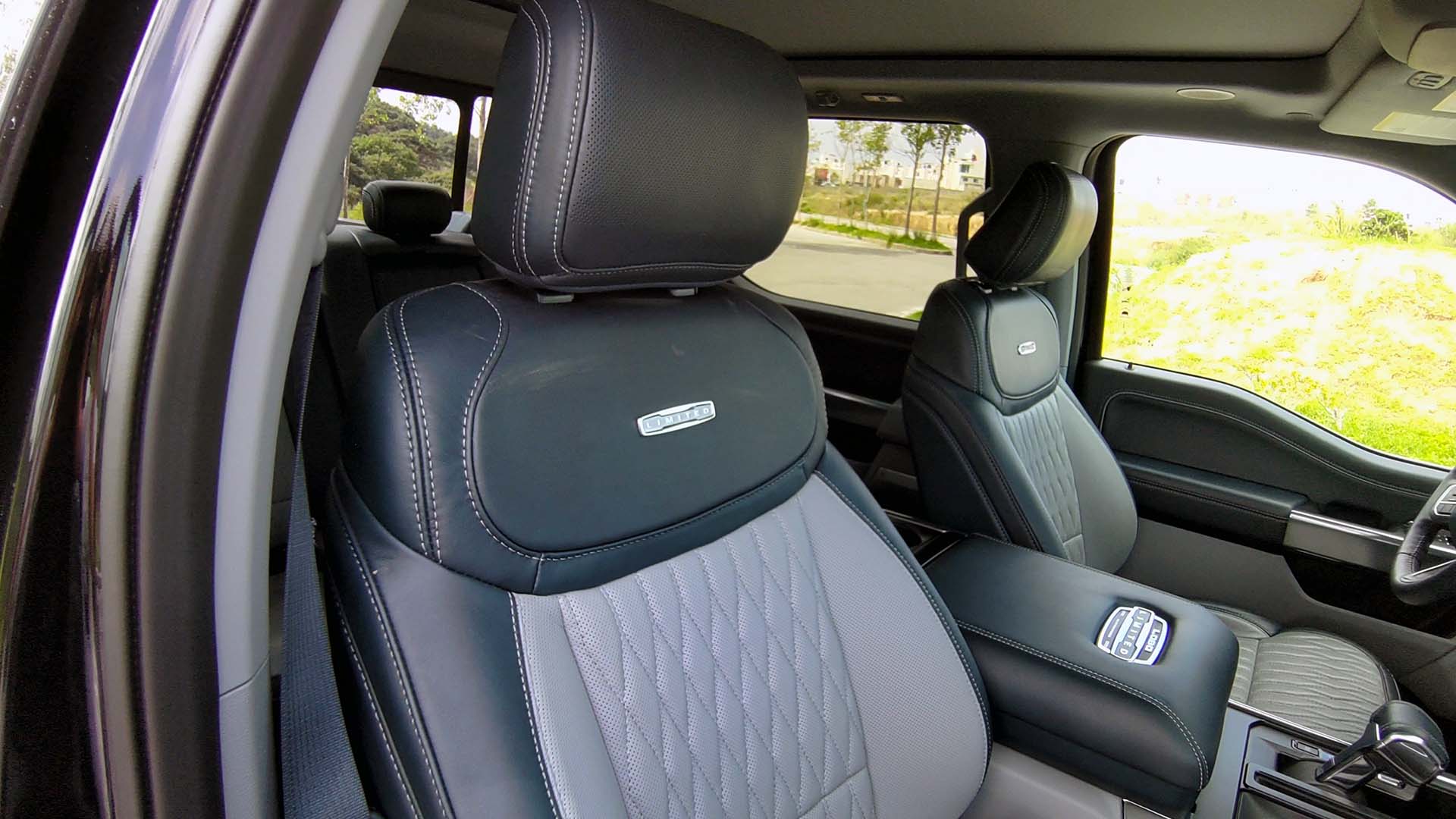 Resaltará el enorme espacio interior que incorpora la F-150 Lobo, teniendo asientos multi-contour en piel en dos tonos, Admiral Blue con detalles y texturizados en Light Slate. Estos incorporan calefacción, enfriamiento y masaje (entre otras características). Los asientos traseros son corridos tipo banca con la característica de abatir la parte inferior para darle aún más espacio al interior. Esta función también servirá para acceder a los compartimentos que incorporan para guardar herramienta, el cable para conectar a la corriente o algún artículo personal que no desees que quede expuesto. La elegancia de estos asientos se puede notar al llevar en el centro el emblema de LIMITED.