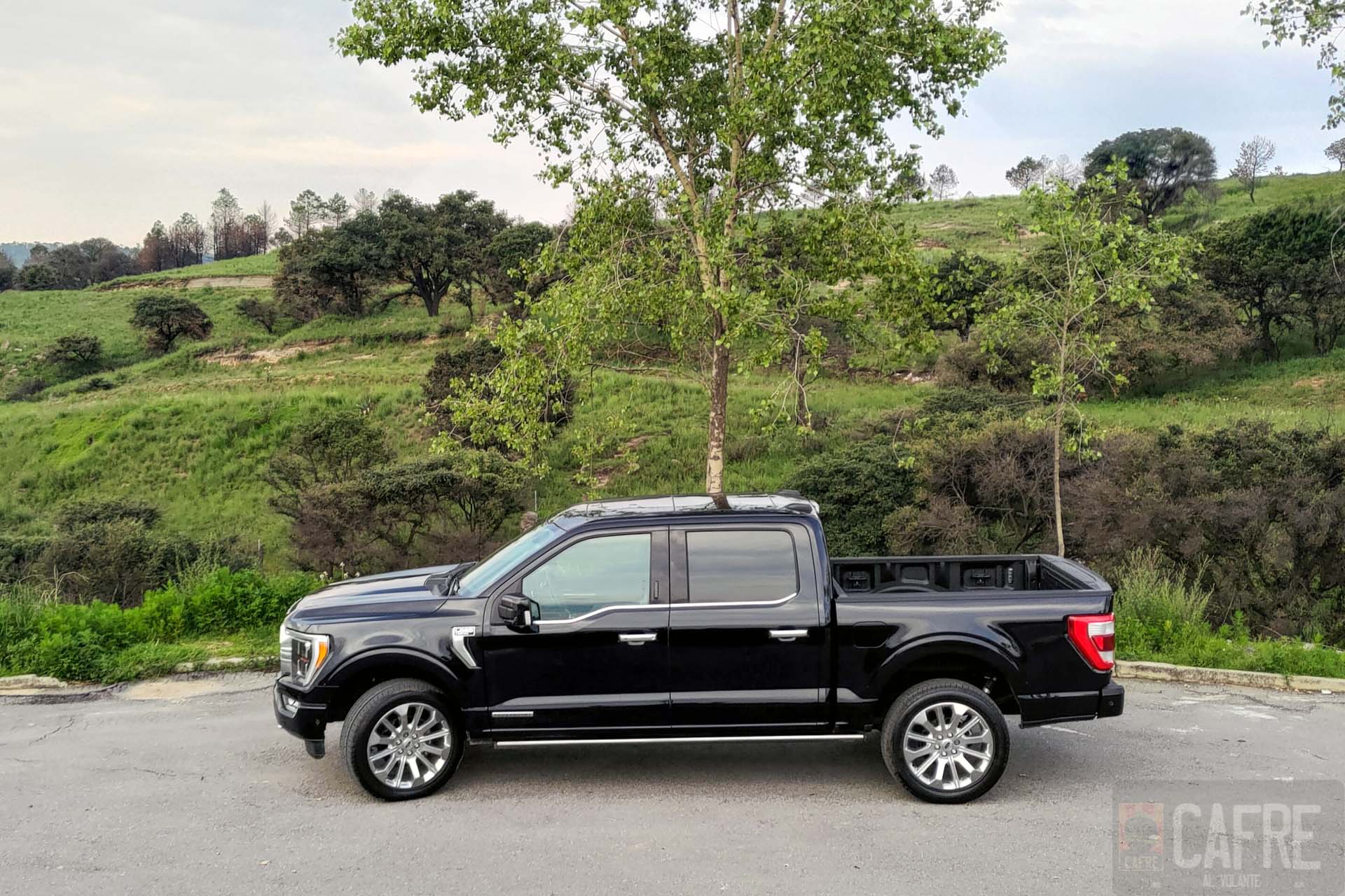 A los costados sin duda sobresale las dimensiones, al ser doble cabina la longitud total será de 5,885 milímetros. Resaltarán los enormes rines de aluminio pulido de 22 pulgadas, su diseño de 12 puntas le da un toque bastante elegante a esta camioneta. El diseño es bastante limpio, sólo notaremos que en las puertas tendrán unos relieves en la parte inferior que le darán estilo a la línea de diseño. Como toda pickup los espejos son de gran proporción para ayudar al momento de traer un remolque. Como detalles tendremos los emblemas de F-150 en la salpicadera delantera y en la parte inferior de la puerta delantera tendremos el de POWERBOOST, indicando la versión y motorización de esta Lobo.