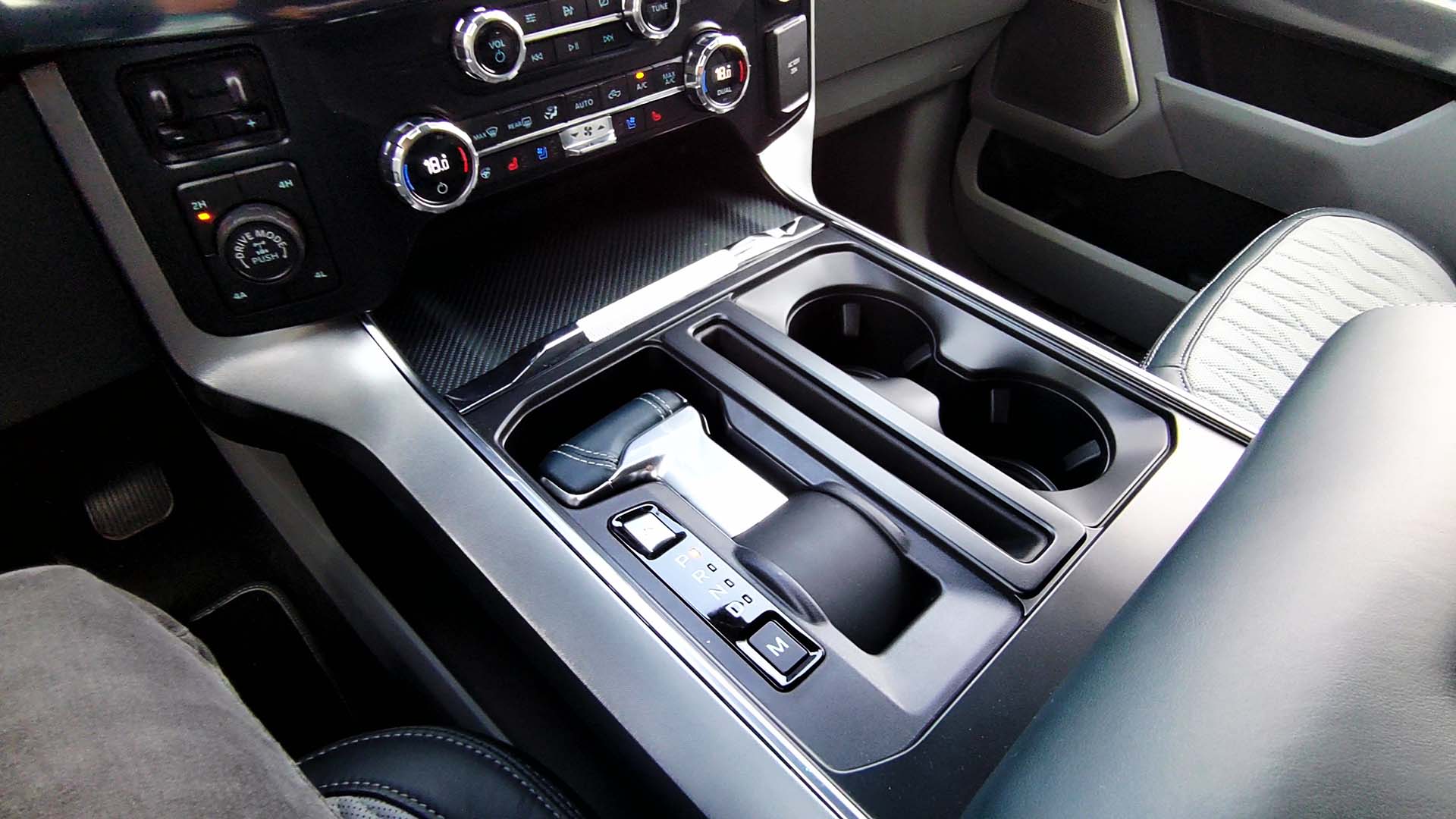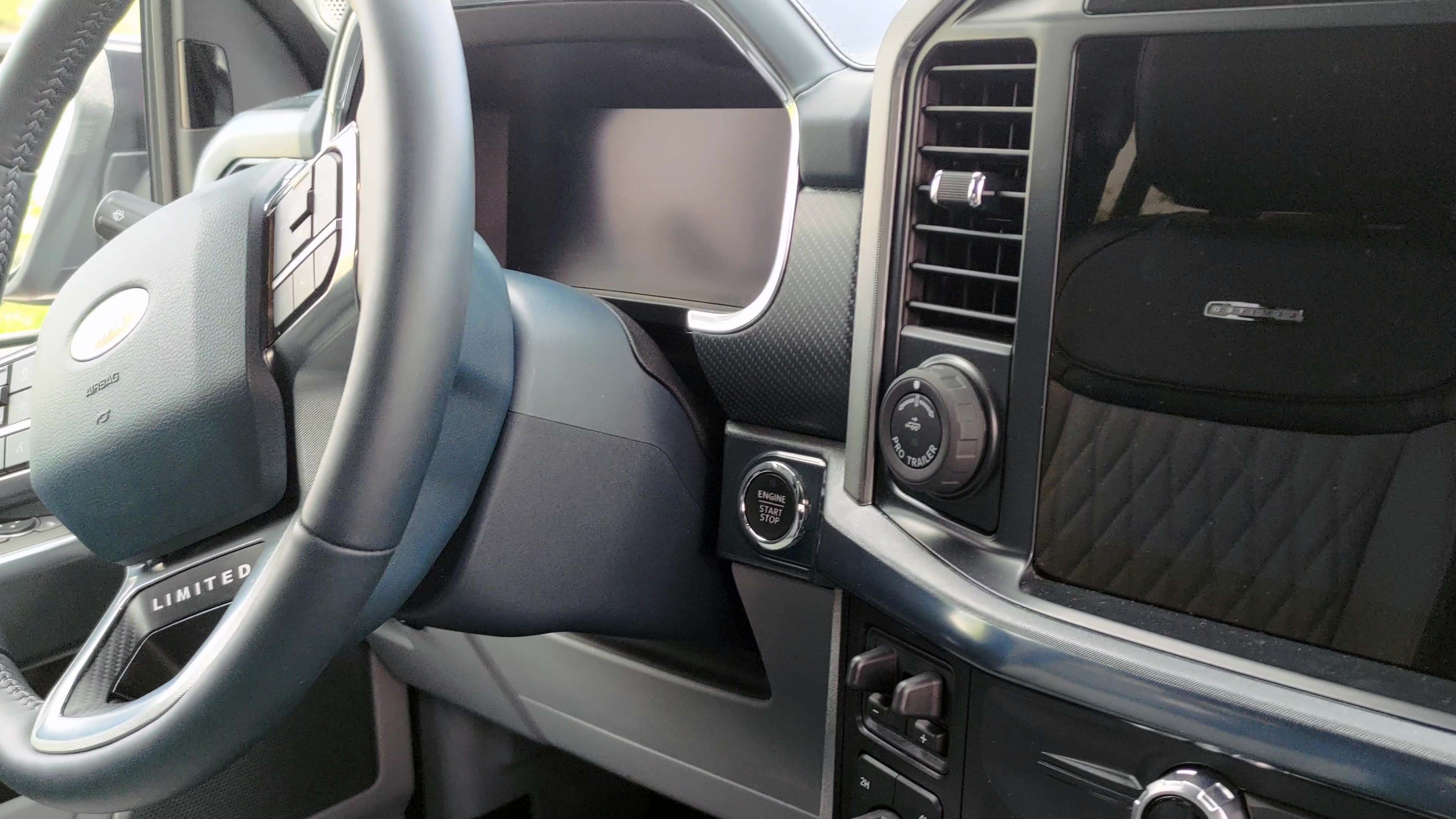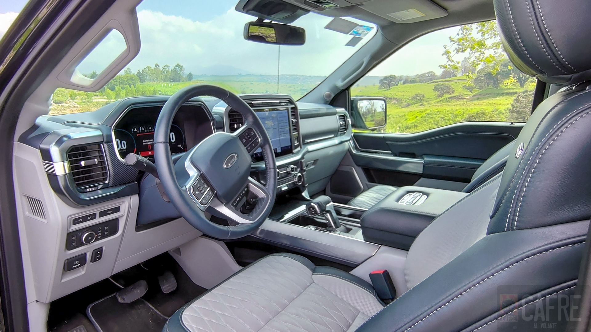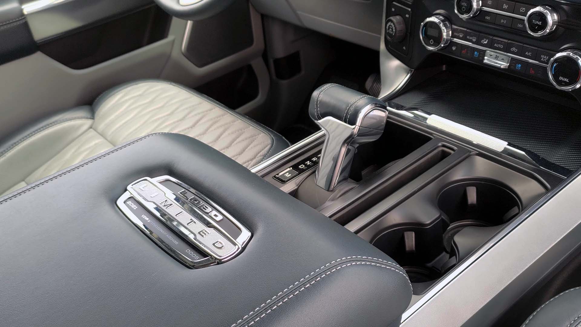 Desde el asiento del conductor podemos notar las imponentes dimensiones de la Lobo, como novedad para esta nueva generación de la F-150 el panel de instrumentos es totalmente digital de 12 pulgadas, el diseño y la información que muestre cambiará dependiendo el modo de manejo que elijas. Continuando con las enormes proporciones de esta pick up, en el tablero tendremos también otra pantalla de 12 pulgadas para el infoentretenimiento y otras funciones como el aire acondicionado y activar el masaje de los asientos. Ahora incorpora el sistema multimedia SYNC 4 con Android Auto y Apple Car Play de manera inalámbrica. Para armonizar el interior, al ser Limited tendremos el sistema de audio Bang & Olufsen con 18 bocinas de alto desempeño (Incluyendo Subwoofer). Alrededor de la pantalla de infoentretenimiento tendremos los interruptores para el asistente de remolque, las perillas para el aire acondicionado, el selector de modos de manejo y dos conexiones eléctricas.