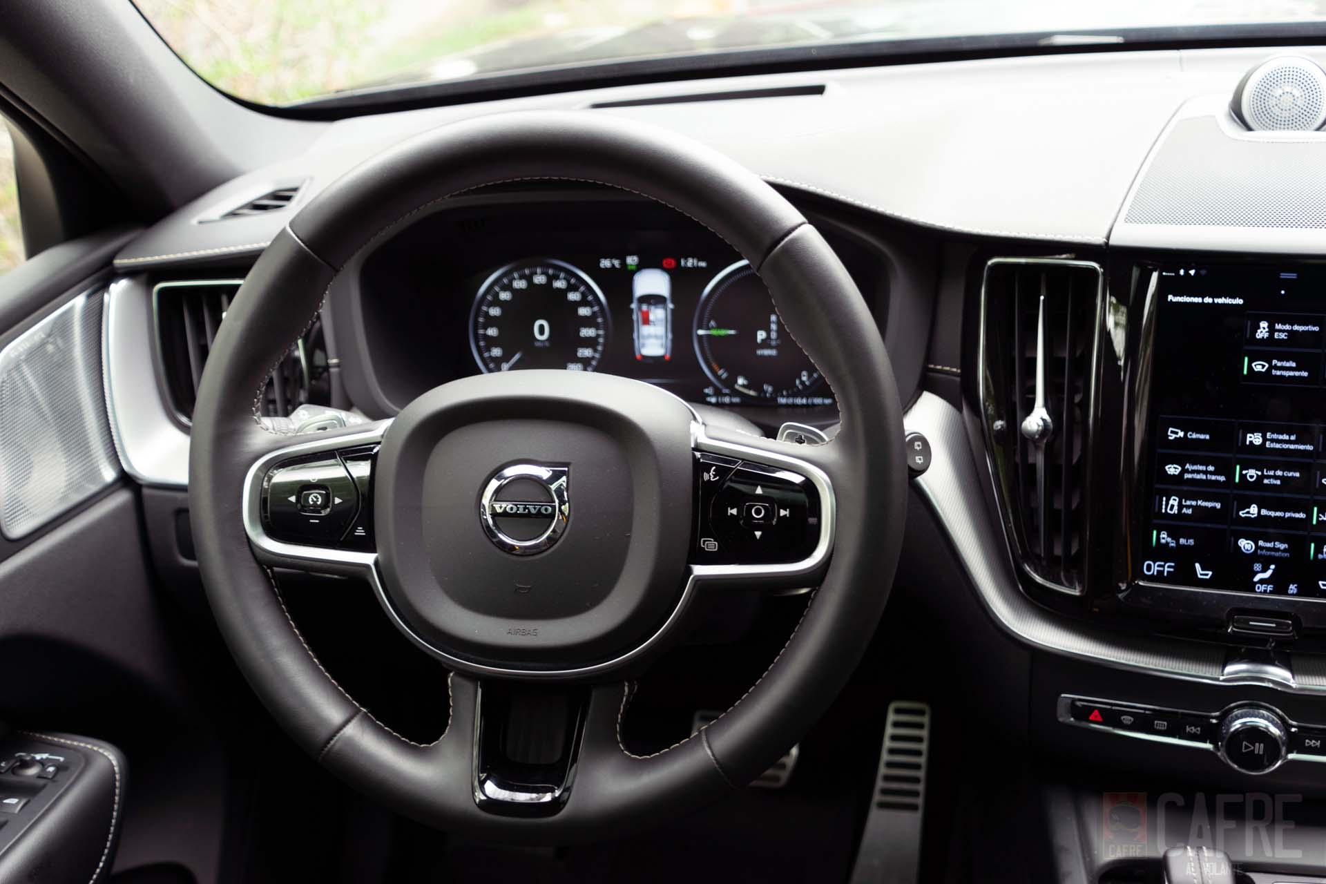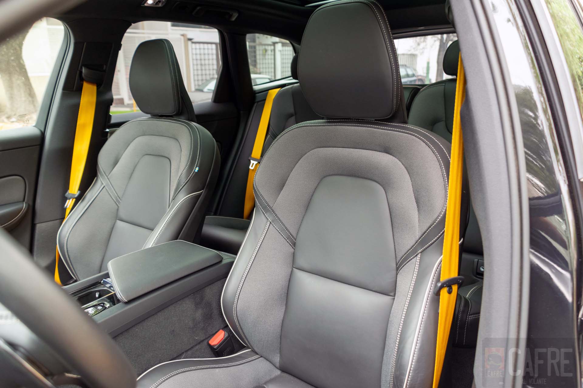 El interior nos da esa sensación de deportividad, resaltando los cinturones de seguridad que son el color amarillo buscando hacer conjunto con los frenos. El tablero tendrá la pantalla vertical que servirá para los servicios de Google (siempre y cuando tengas internet integrado) y funciones del vehículo. Los asientos son bastante cómodos y ofrecen muchas opciones para tener la posición de manejo perfecta. El volante tiene un diseño discreto con funciones básicas como la activación de las asistencias de conducción e indicaciones en el panel de instrumentos digital de 12 pulgadas. Resaltará el sistema de audio Bowers & Wilkins de 15 bocinas harán tu experiencia increíble al estar conduciendo la XC-60 (este tiene un costo extra).