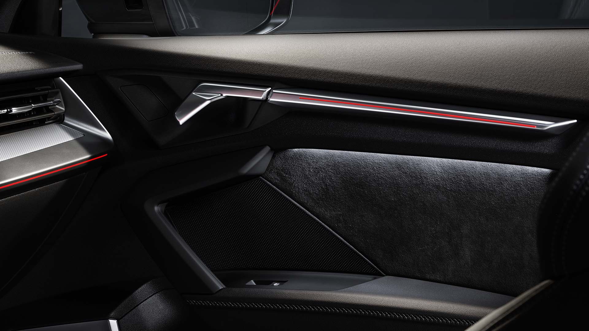En el nuevo A3 Sedán la línea de la carrocería se extiende de forma recta hacia la fascia trasera, lo que otorga a la vista lateral una elegante apariencia. La superficie cóncava bajo la línea de cintura resalta aún más los faldones laterales, creando un intenso juego de luces y sombras. La línea del techo desciende de forma dinámica desde el pilar B, como en un coupé, y termina en un llamativo spoiler integrado en la tapa del maletero que, opcionalmente, está disponible en acabado carbono, enfatizando la poderosa apariencia del modelo de cuatro puertas.