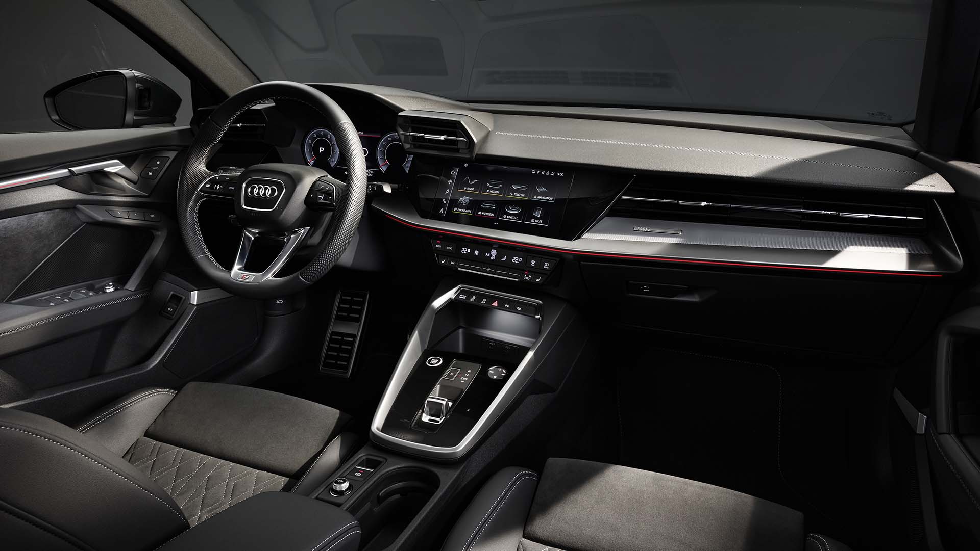 Desde el diseño hasta las pantallas y los mandos de control, el puesto de conducción del A3 Sedán está completamente enfocado en el conductor. Por ello, la pantalla central MMI touch en el tablero está ligeramente inclinada hacia él. Tiene una diagonal de 25.6 cm (10.1 pulgadas) y su manejo resulta fácil e intuitivo. Incluye de serie el reconocimiento de texto escrito a mano, así como el control de voz mediante lenguaje natural, que opcionalmente puede recurrir a las capacidades del almacenamiento en la nube. El Audi Virtual Cockpit es de serie desde la versión de acceso a la gama, con una pantalla de 26 cm (10.25 pulgadas). En el caso del Audi virtual cockpit plus opcional la pantalla alcanza los 31.2 cm (12.3 pulgadas) y ofrece tres modos de visualización diferentes, incluyendo una deportiva con los dígitos inclinados y un diseño particularmente dinámico, en la que se muestra el régimen de giro del motor y la velocidad mediante diagramas de barras con elementos gráficos angulares y de color rojo. De forma opcional se puede instalar un head-up display que complementa el sistema de pantallas proyectando información relevante en el parabrisas, directamente en el campo de visión del conductor.
