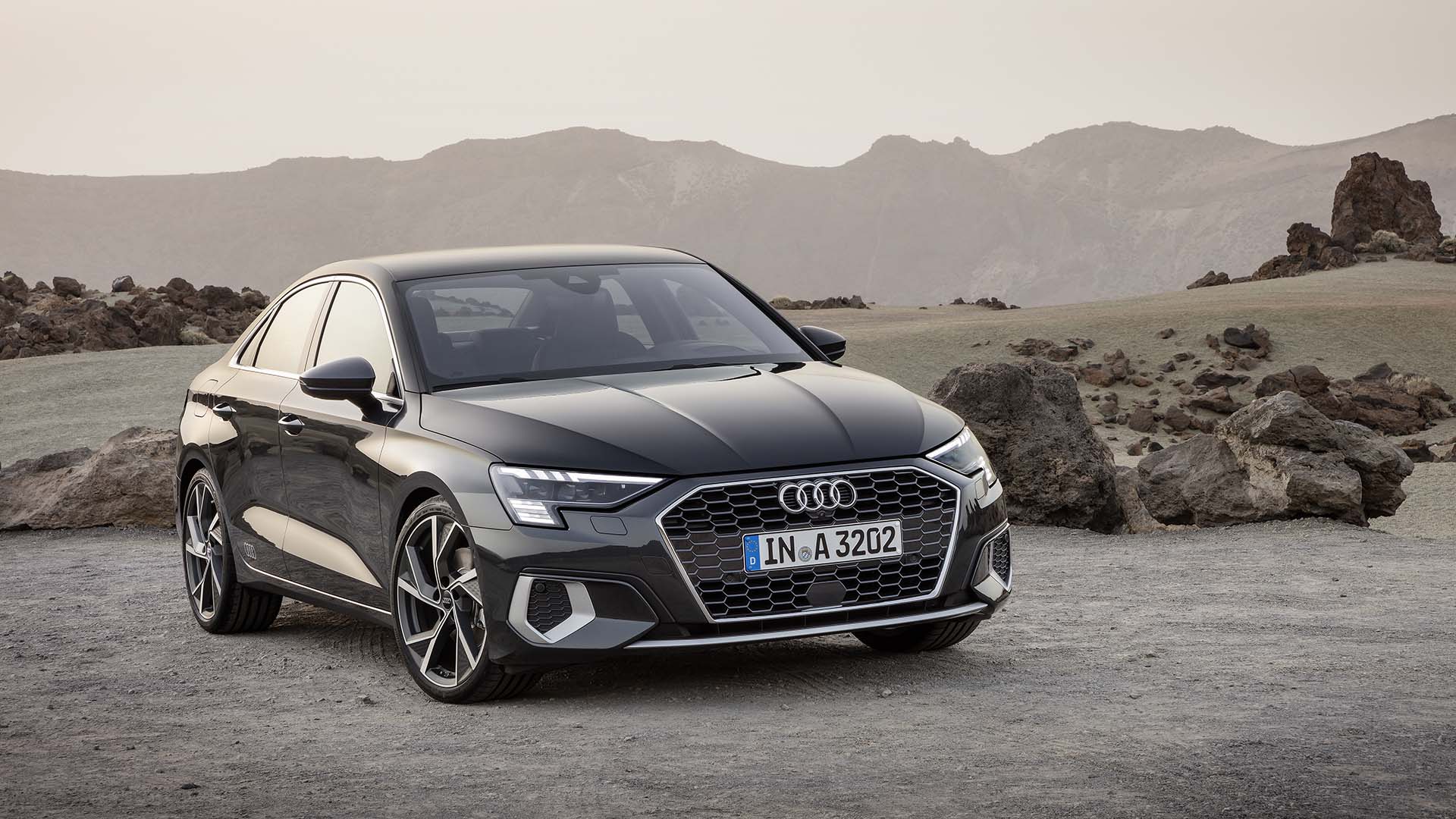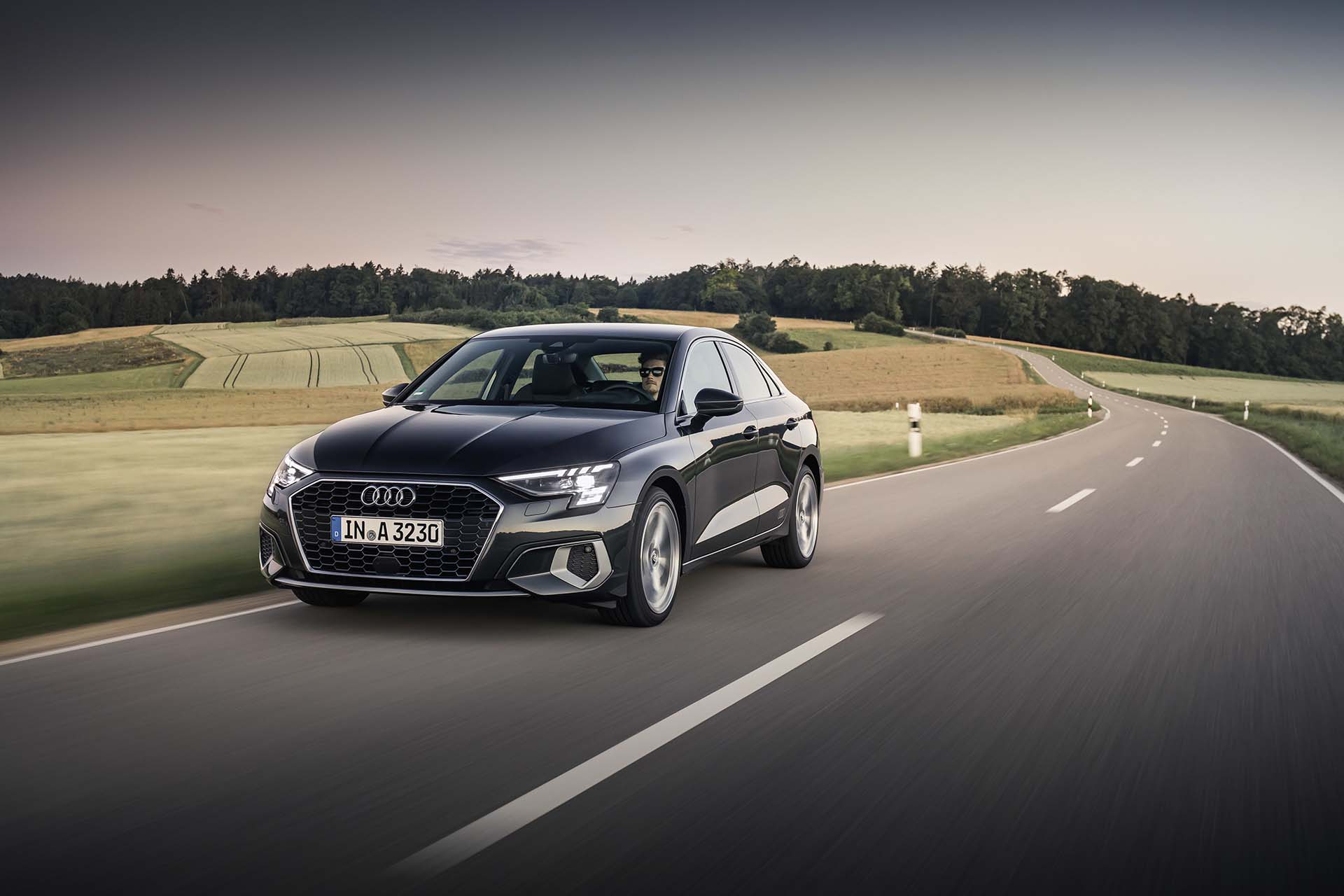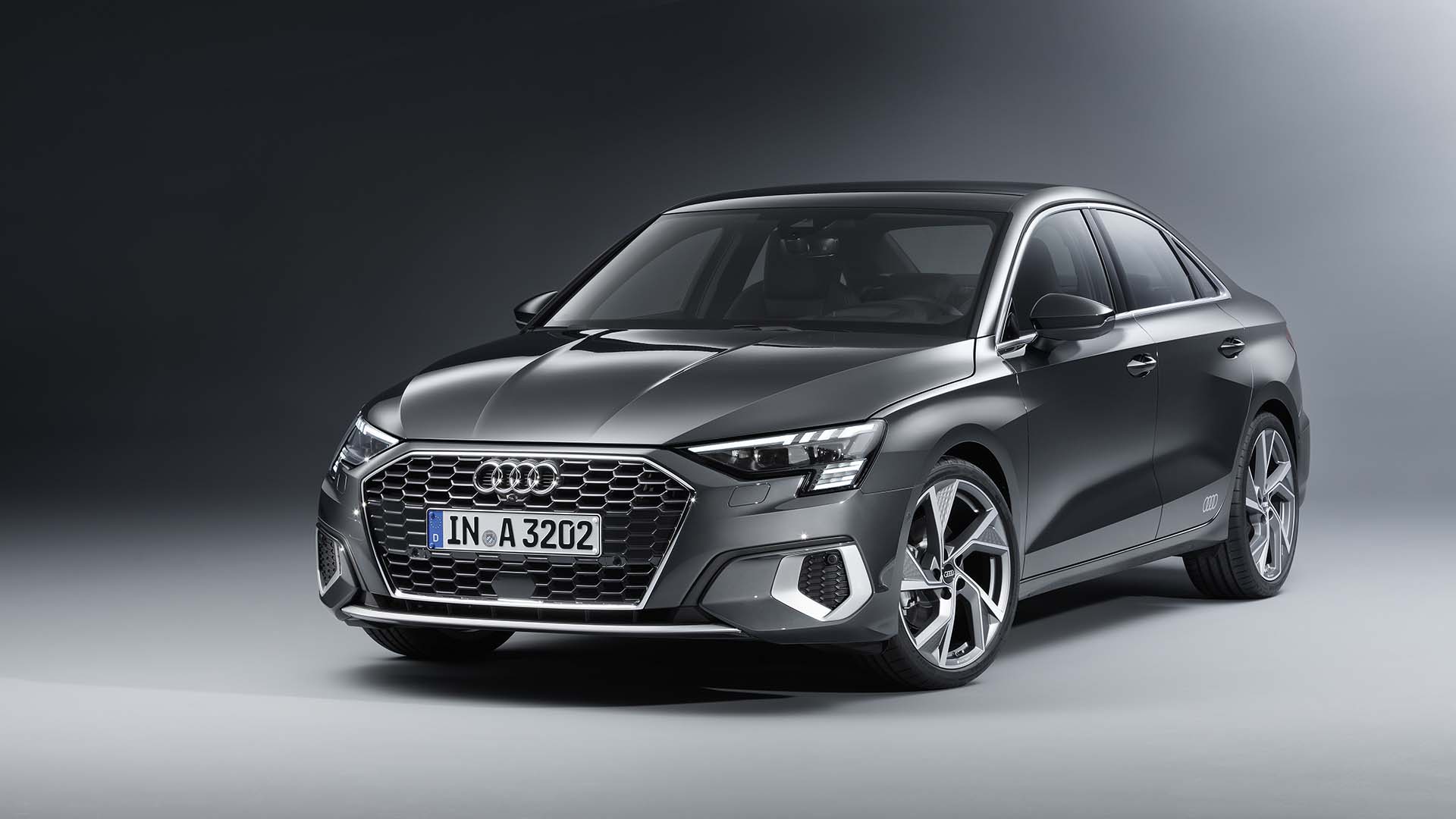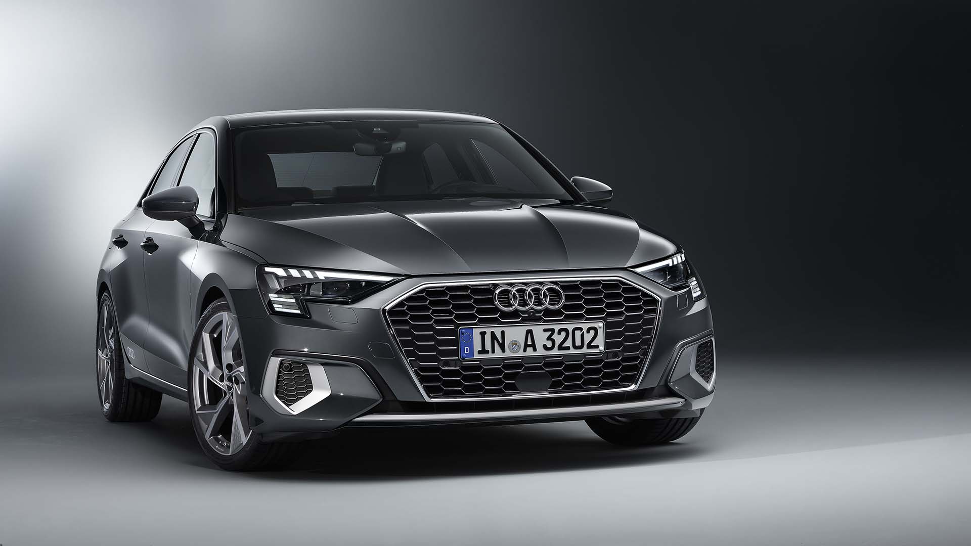 La parte frontal está dominada por una gran parrilla Singleframe con rejilla de panal, flanqueada por grupos ópticos de llamativo diseño, formando ángulos trapezoidales en su parte exterior que apuntan hacia abajo. De forma opcional, la tecnología Matrix LED, aloja las nuevas luces diurnas digitales. Consiste en una matriz de píxeles formada por 15 segmentos LED que pueden funcionar de forma individual, y confiere a las distintas versiones de acabado del A3 Sedán una firma lumínica específica.