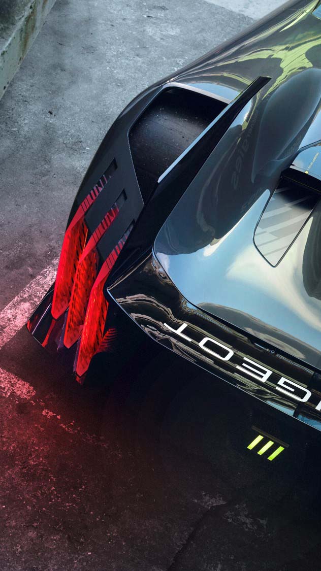 Cuando se creó el PEUGEOT 9X8, se puso un gran énfasis en la parte trasera. Siguiendo el boceto original de un automóvil algo arremetiendo, apareció una cabina ligeramente puntiaguda, junto con la cubierta muy particular que vemos hoy sobre la rueda trasera.